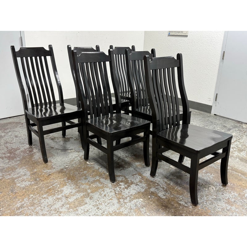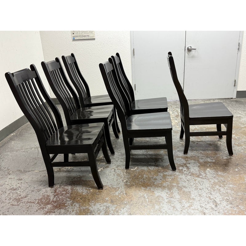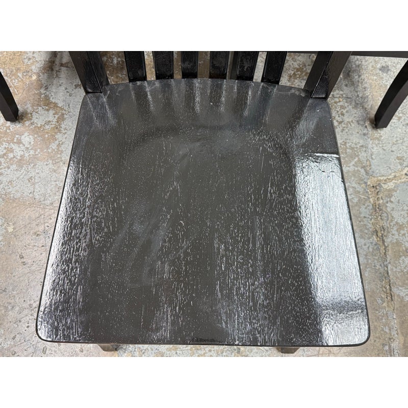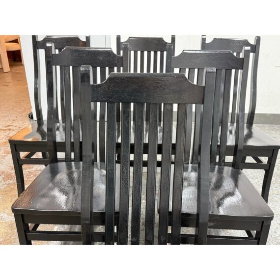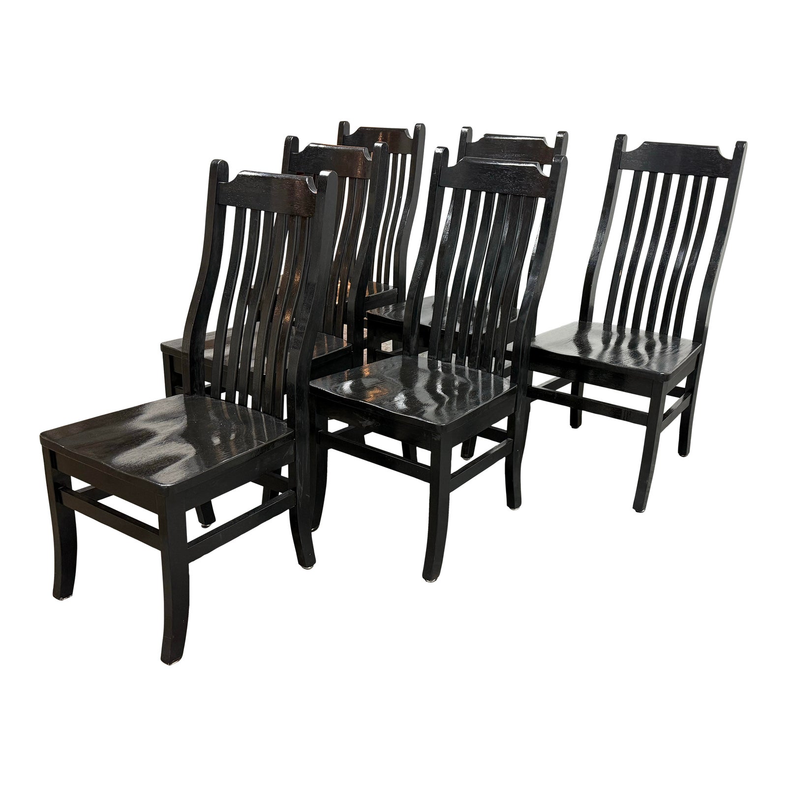 Design Plus Gallery presents a Set of Six Chairs from an Unknown Maker. The chairs have farmhouse characteristics to add into your dining room. With their rectangular slat-back design that delivers style with airy comfort. Finished in a versatile black, these chairs blend rustic with a refined, modern edge. Sturdy, well-supported legs ensure everyday durability—perfect for family meals, entertaining, and everything in between. In good condition, visible and minimal wear on finish from usage.