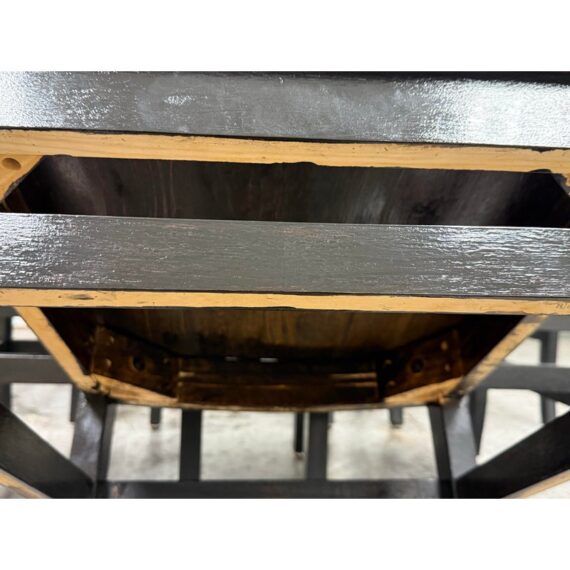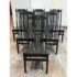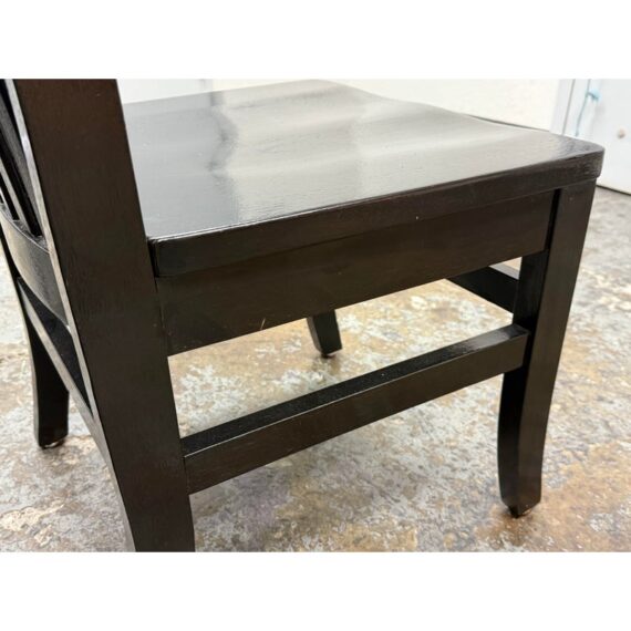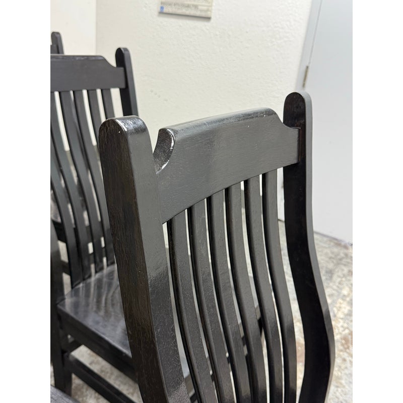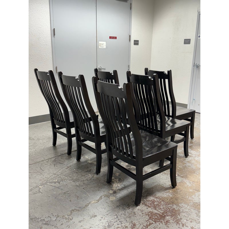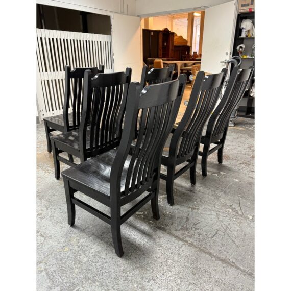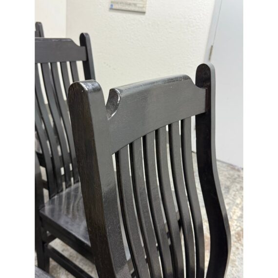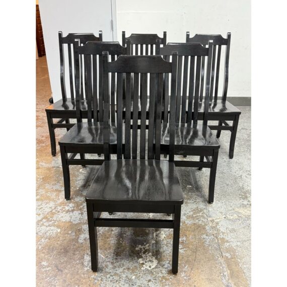 Design Plus Gallery presents a Set of Six Chairs from an Unknown Maker. The chairs have farmhouse characteristics to add into your dining room. With their rectangular slat-back design that delivers style with airy comfort. Finished in a versatile black, these chairs blend rustic with a refined, modern edge. Sturdy, well-supported legs ensure everyday durability—perfect for family meals, entertaining, and everything in between. In good condition, visible and minimal wear on finish from usage.