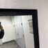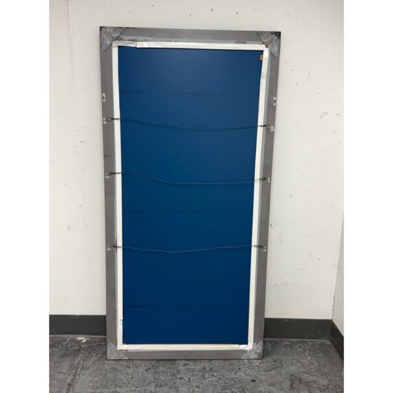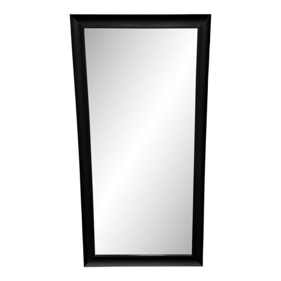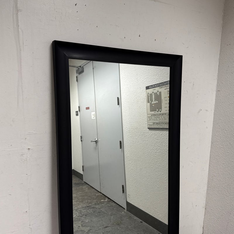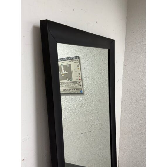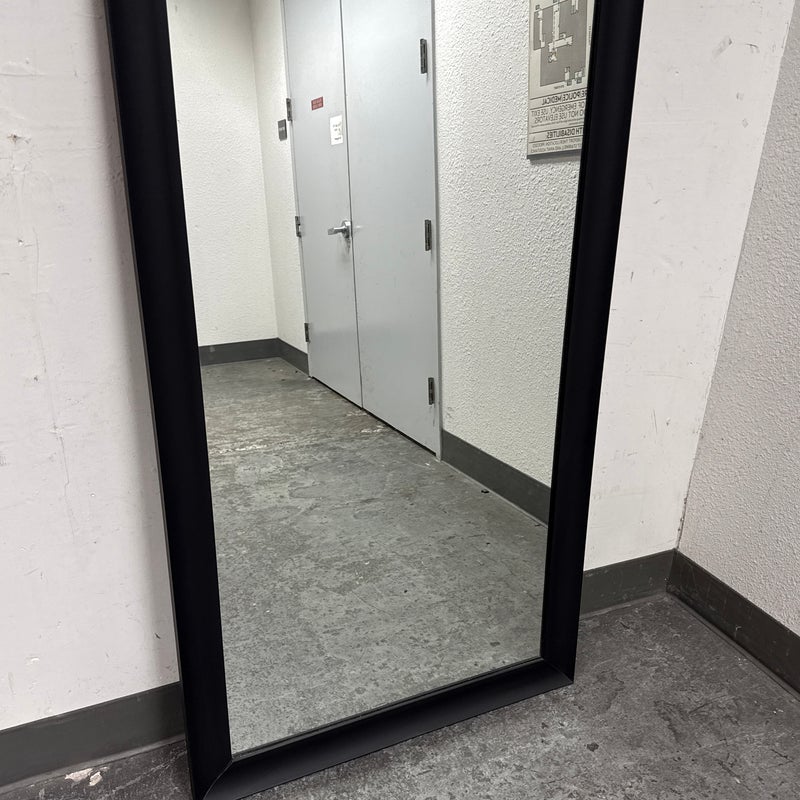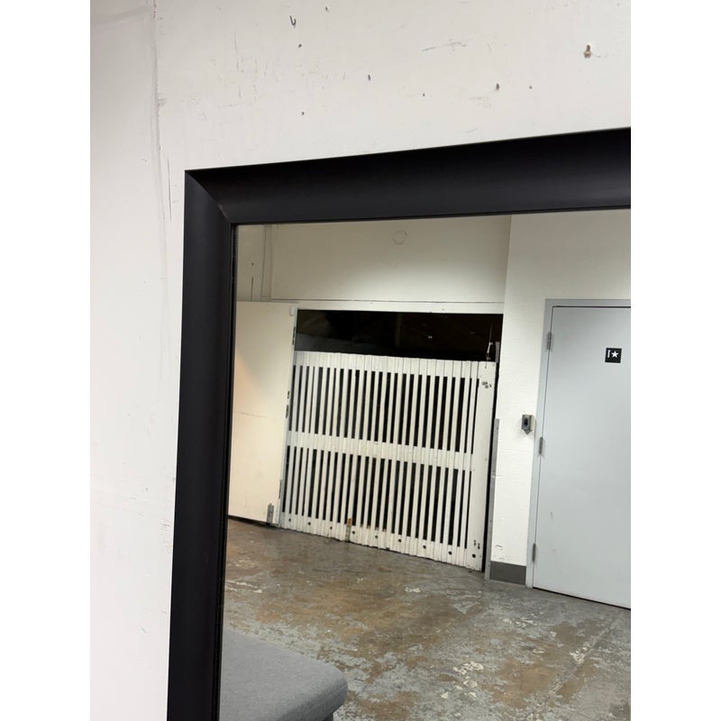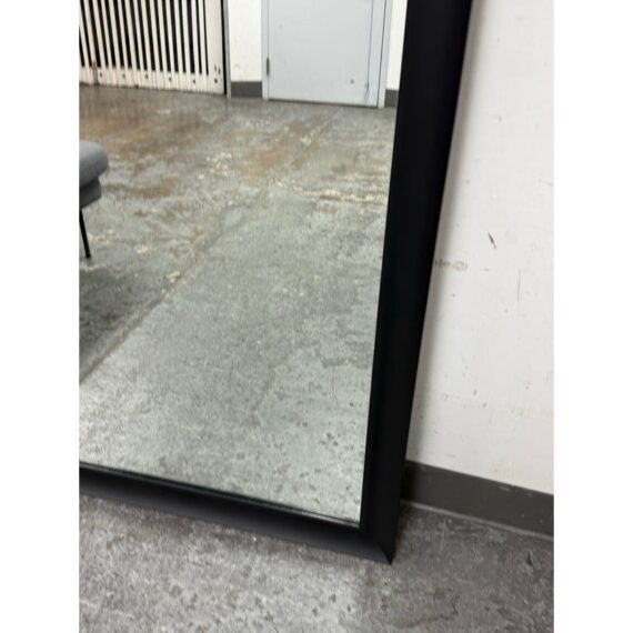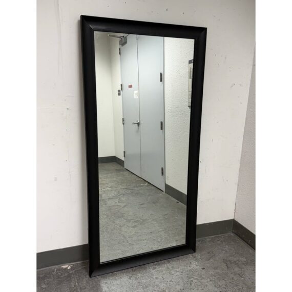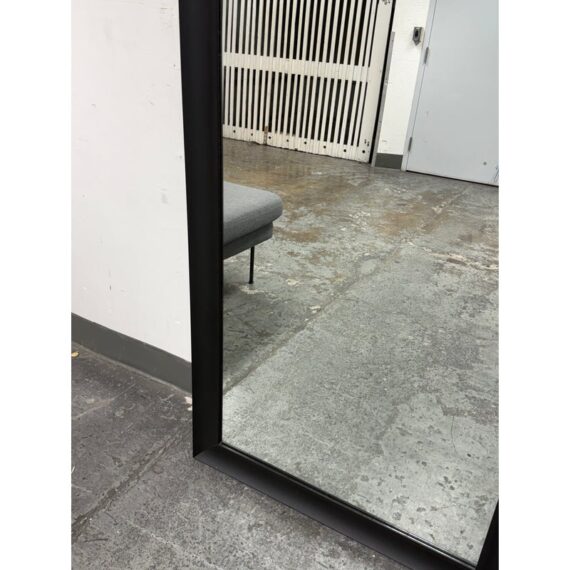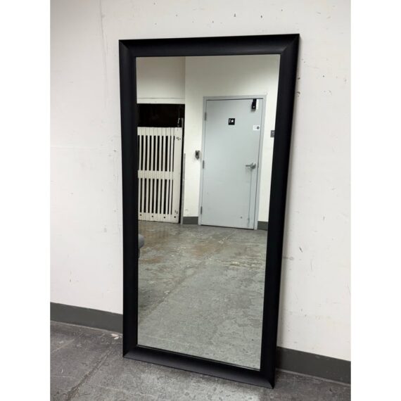 Design Plus Gallery presents a Full Length Mirror with a Black Wood Frame. The tall mirror is able to lean up against a wall with its sturdy weight and case. It can also be readily hung vertically as it has the set up on the back side to do so. Visible wear is present but overall it is in good condition for its usage.
