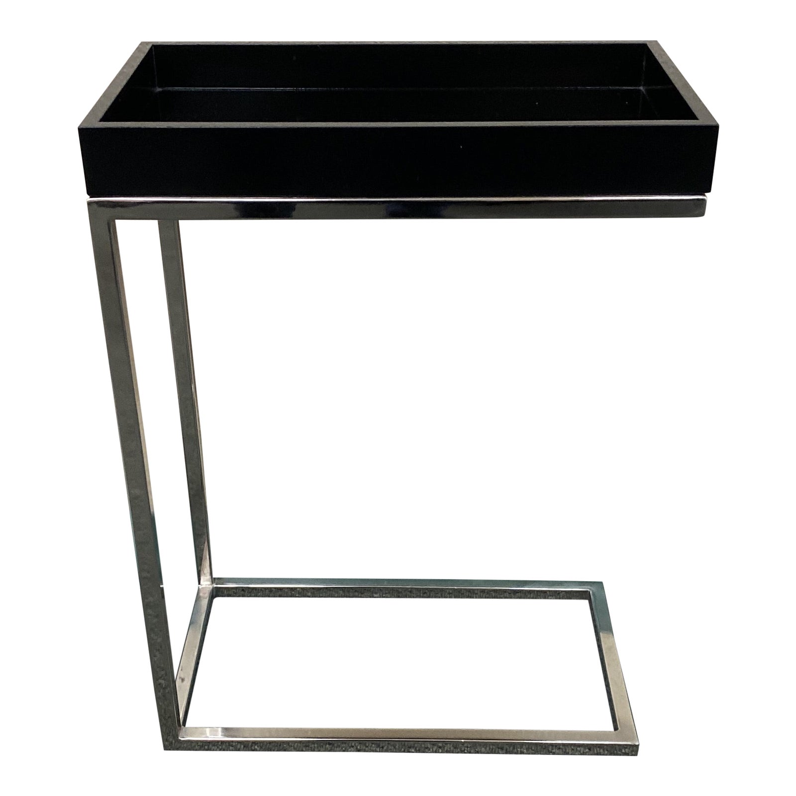 Design Plus Gallery presents a Black Tray Top + Chrome Base C-Table. Efficient configuration is ideal for small spaces and integrates surface space effortlessly in a light and sleek profile. Visible wear on tray. Tray is finished with a satin black and is removable.