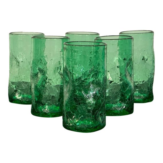 Design Plus Gallery presents a Set of Six Crackle 418 Emerald Dimple Indented Water Glasses by Blenko. The highball glass has a concave shape for comfortable griping with a design that makes it look as the glass was shattered. Nice design with the splash of color. The set of six are in good condition with minimal wear.
