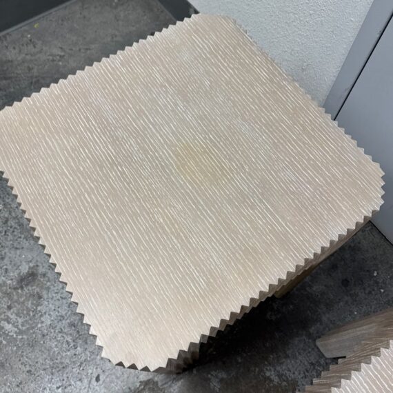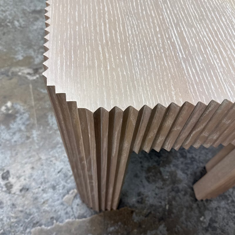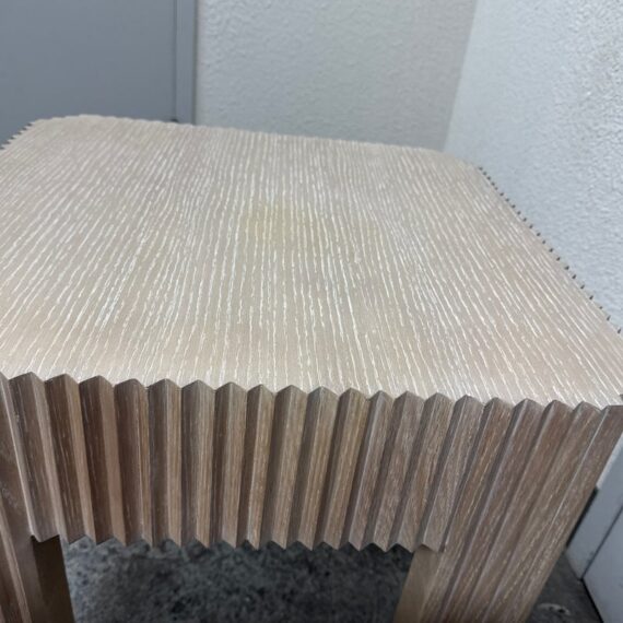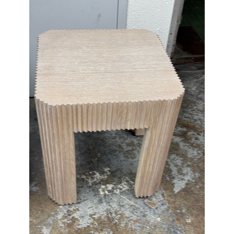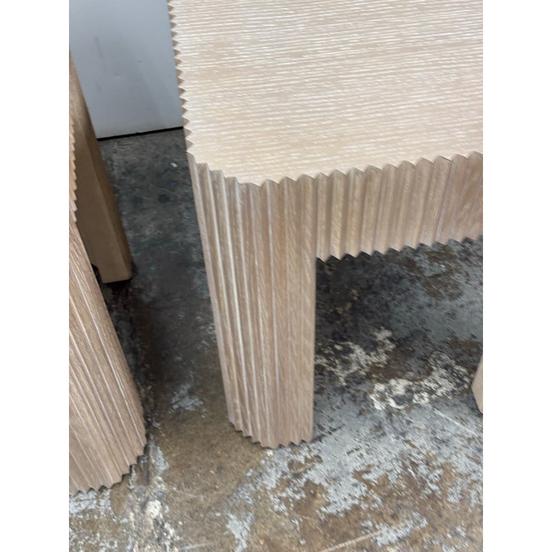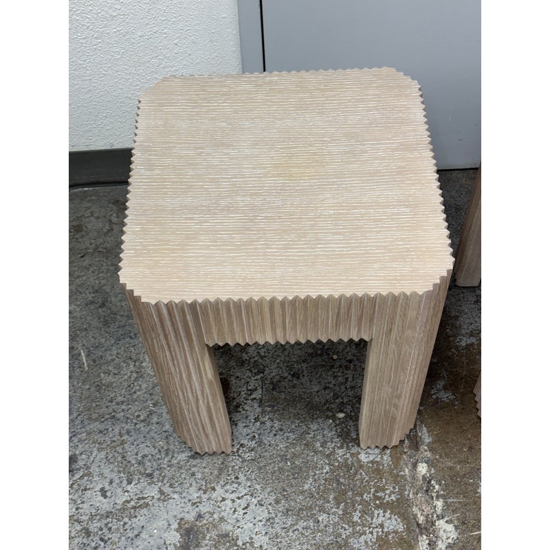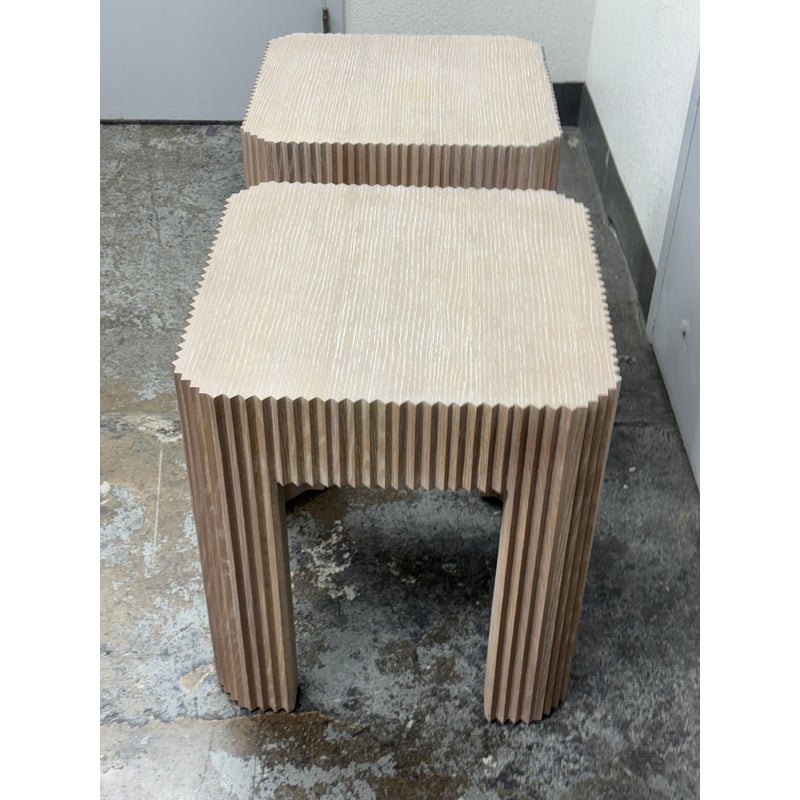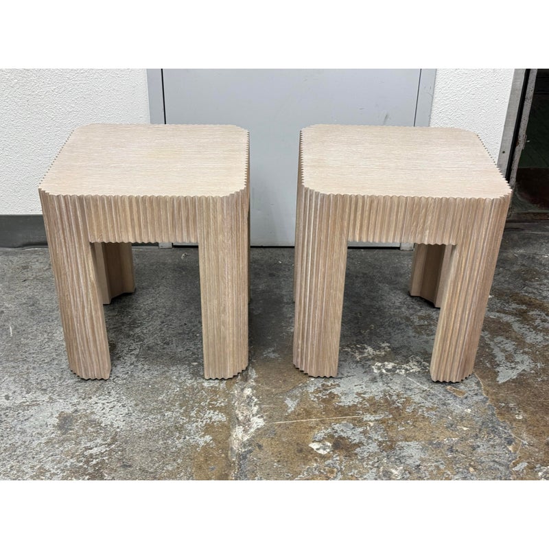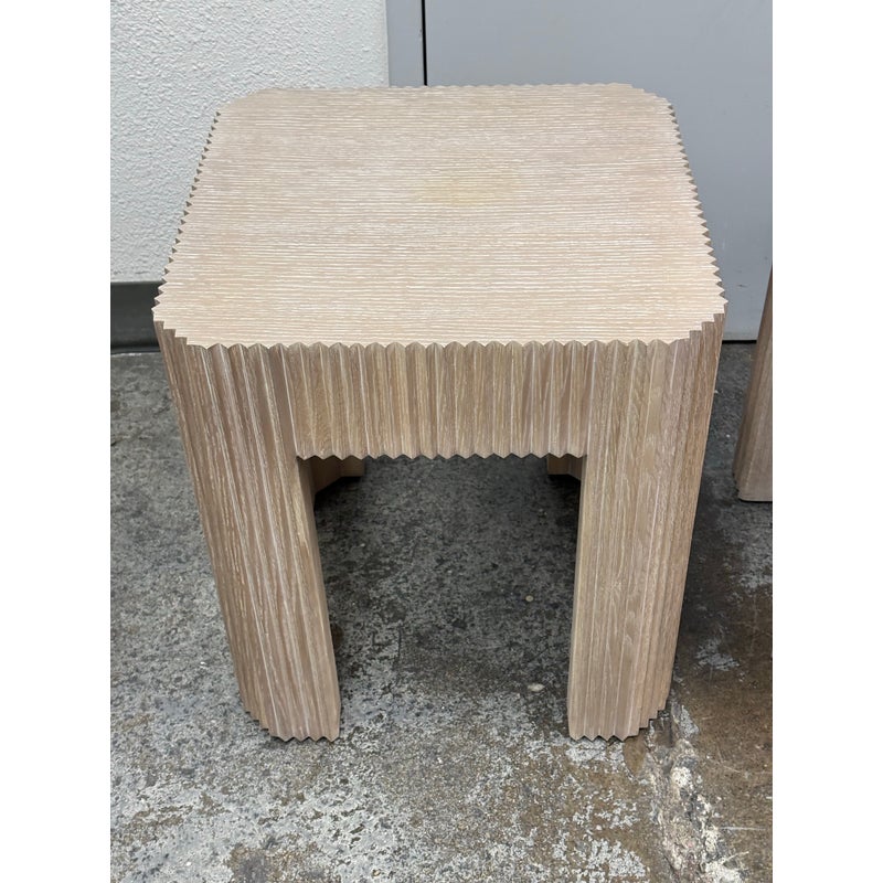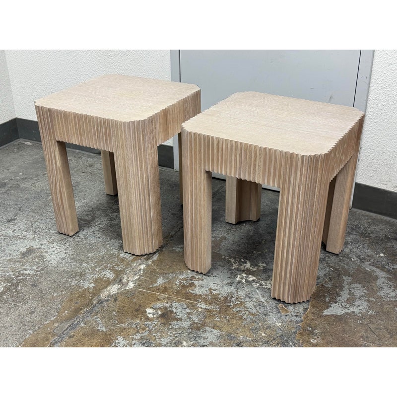 Design Plus Gallery presents a Pair of Colmo Accent Tabes by Bliss Studio. Crafted from solid woods in a Casper Fench Oak Finish. The top coat is an Aqueous Polyurethane. In good condition, minimal wear from usage. In showroom sample condition, from the San Francisco Design Center. Made in California, USA.