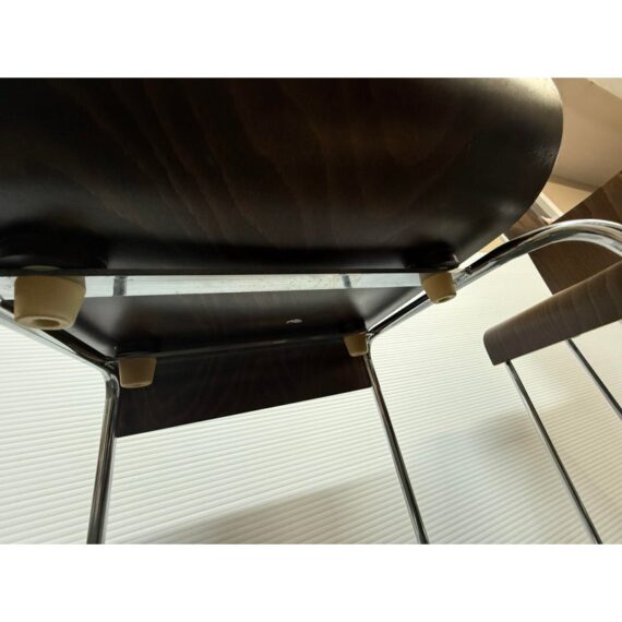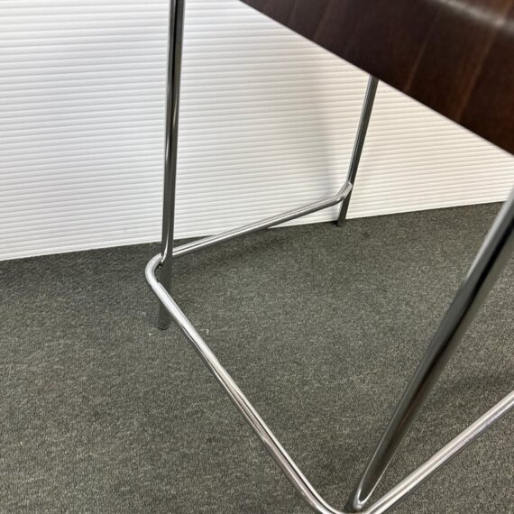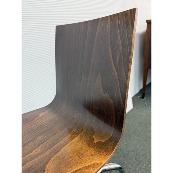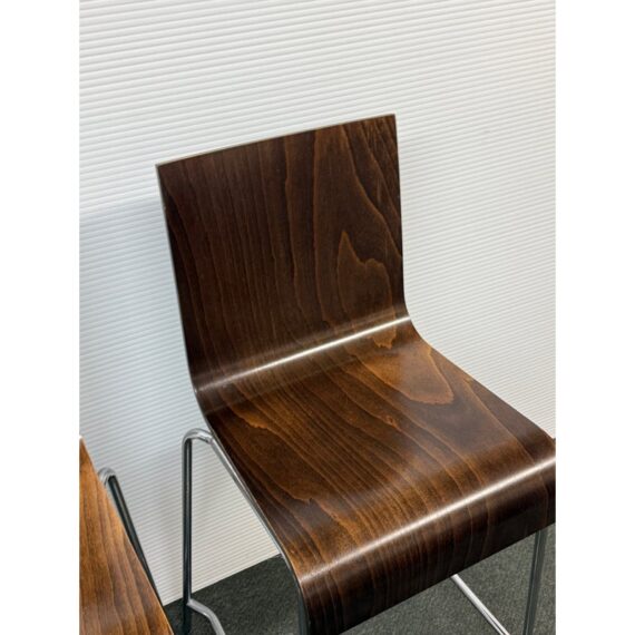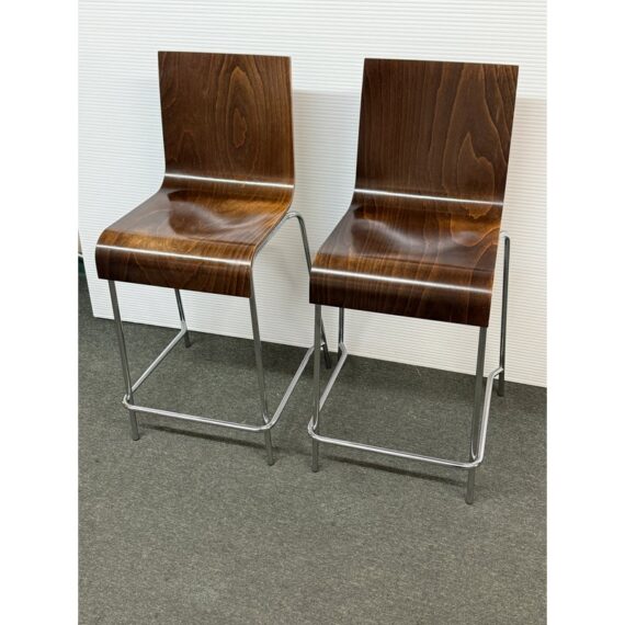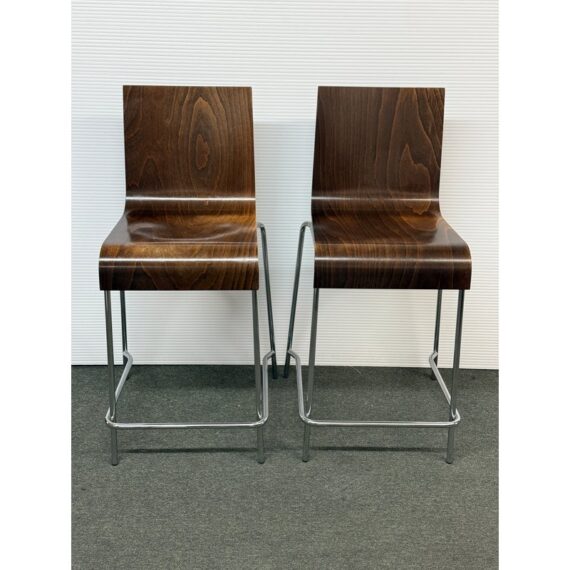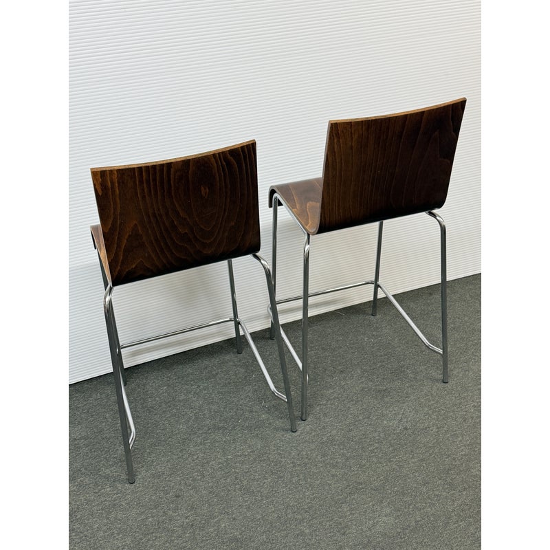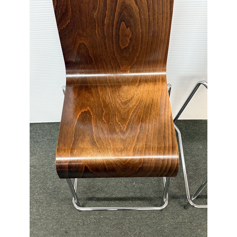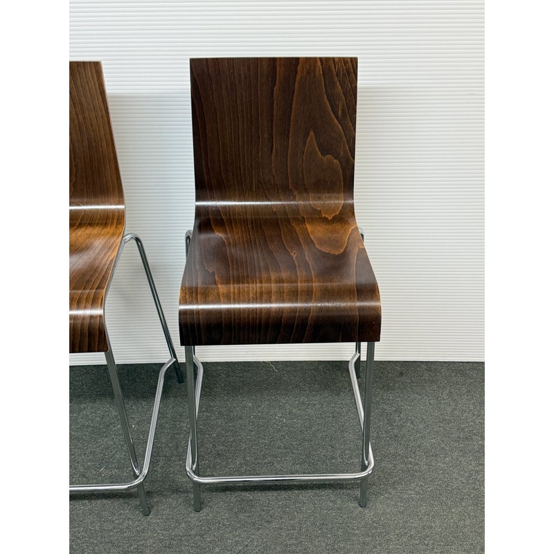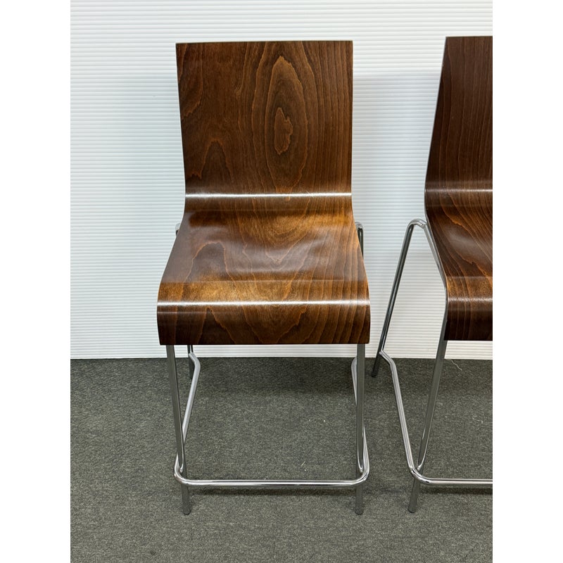 Design Plus Gallery presents a Pair of Contemporary Bentwood Counter Heigh Stools. Simple and elegant with warm curving wood juxtaposed against the cool stainless steel supports. Light surface wear; condition is good for age and use.