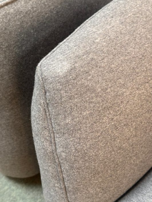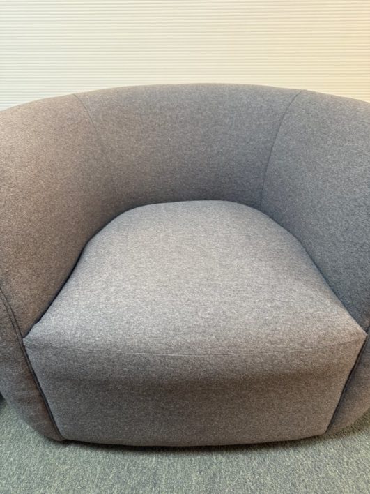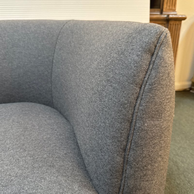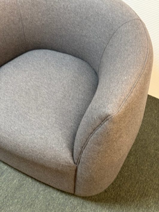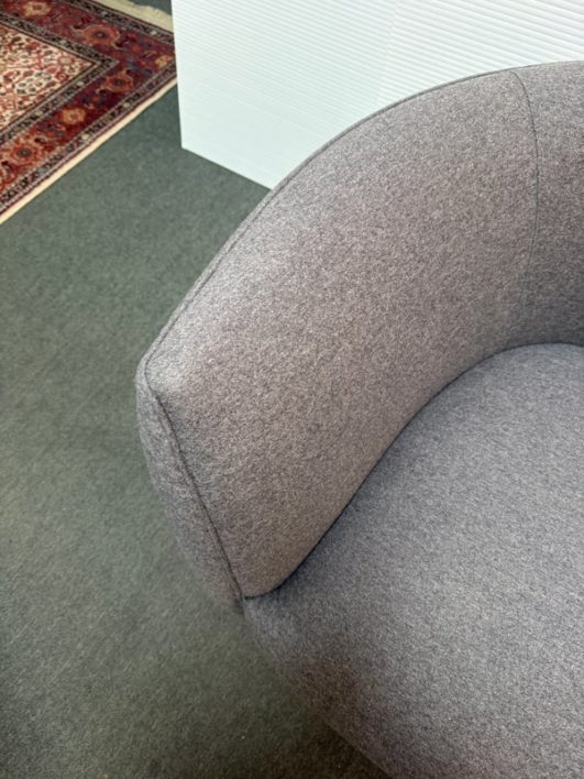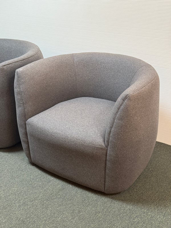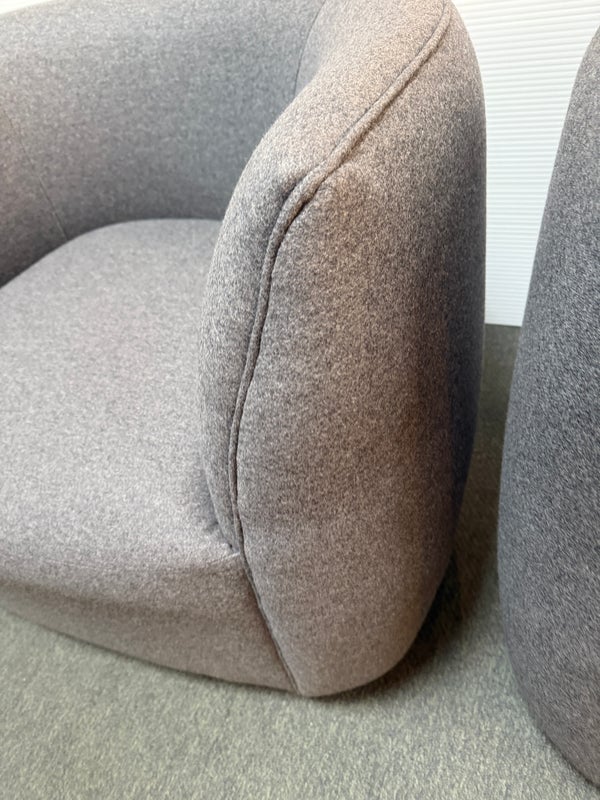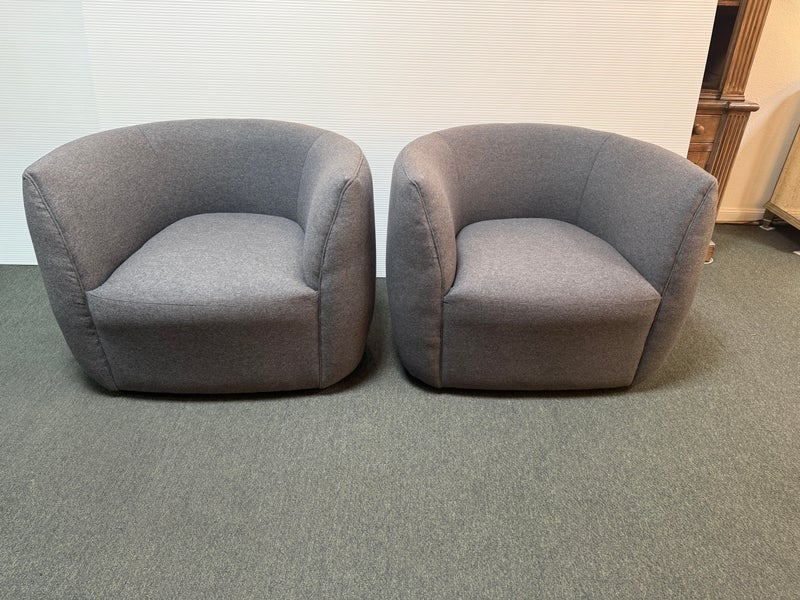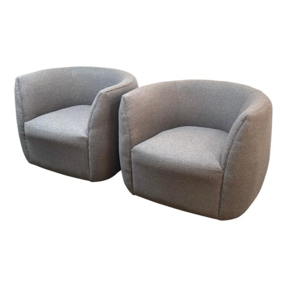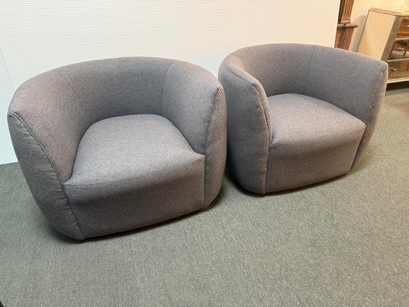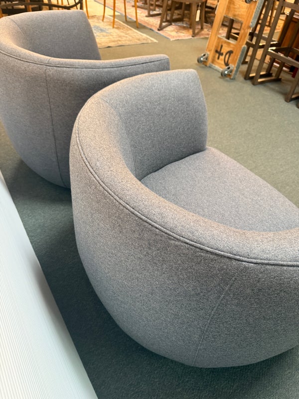 Design Plus Gallery presents a Pair of Council Swivel Chairs by Blu Dot. Gently rounded curves, built with high resiliency tight upholstery-wrapped foam, create a generous and supportive seat that invites relaxation. The wide, plush seat with sinuous springs is designed to embrace your comfort. Hidden return-to-center swivel base allows the roomy chair to float and swivel easily. Neutral poly-wool Gabro upholstery. Little wear; used for staging only.