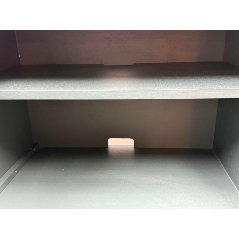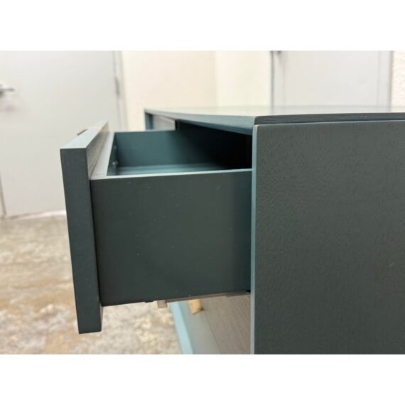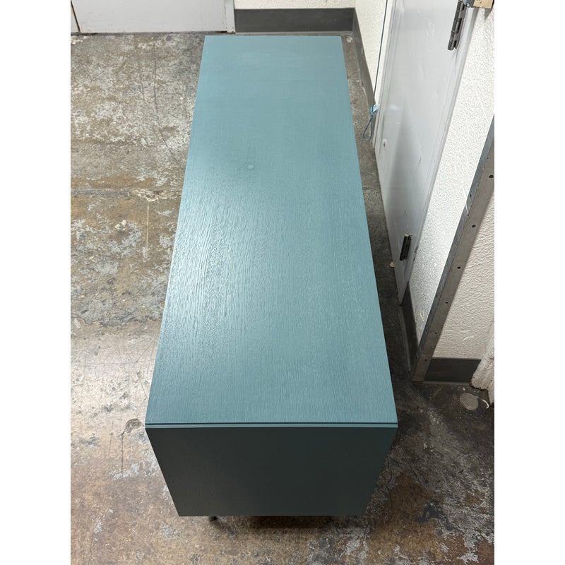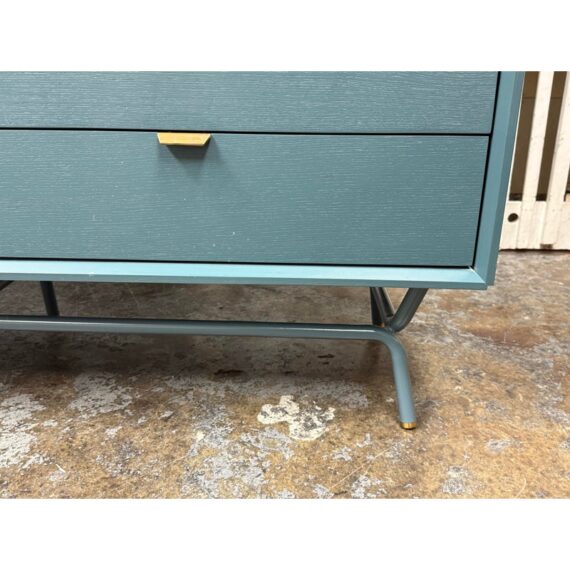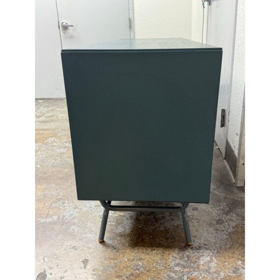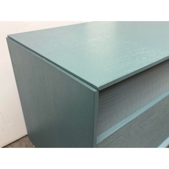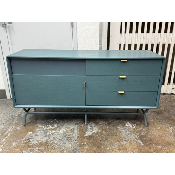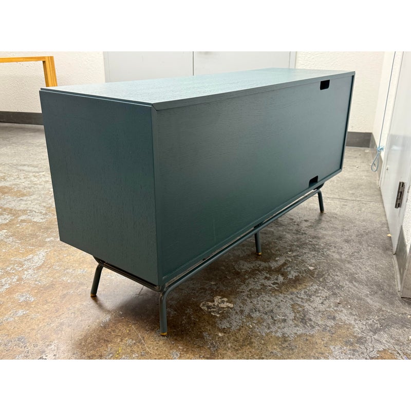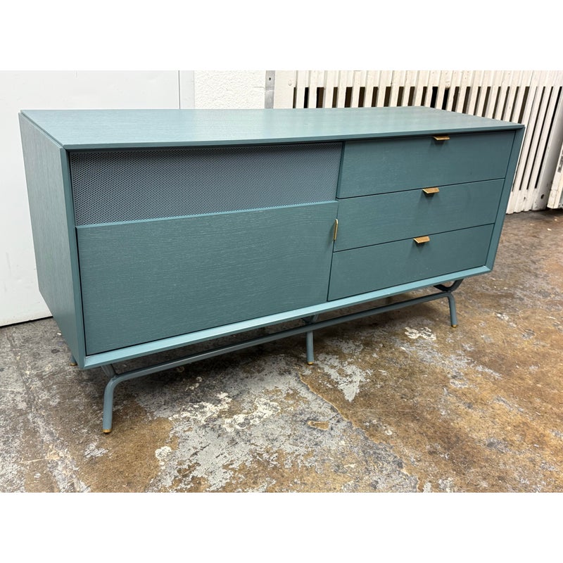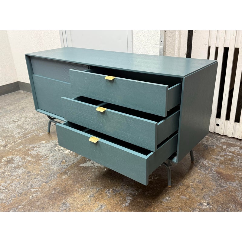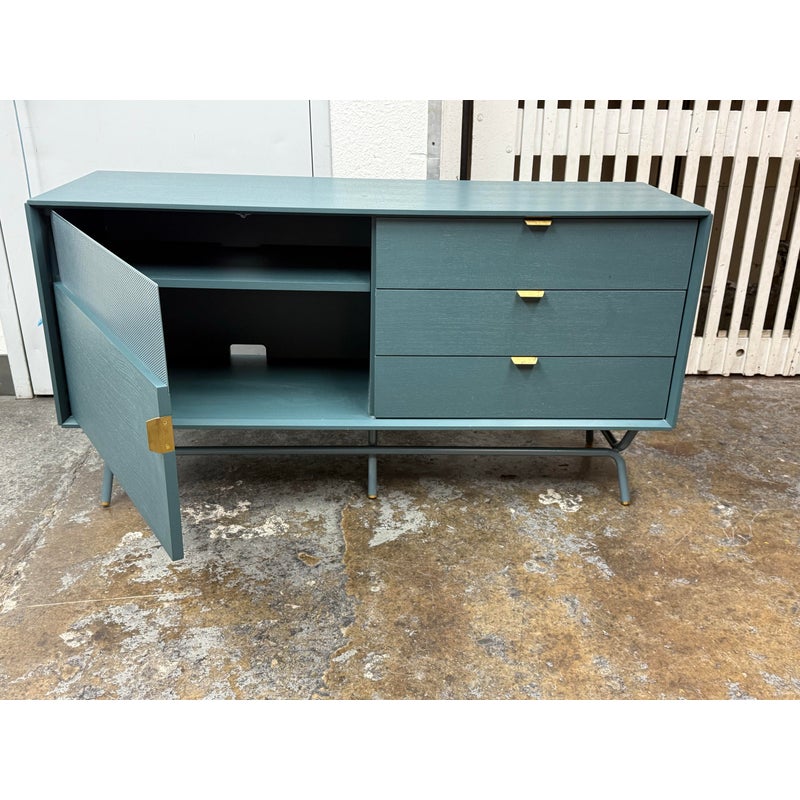 Design Plus Gallery presents a Blu Dang Cabinet and Three Drawer Console from Blu Dot. Powder-coated in Marine Blue with a perforated steel door front allowing for efficient use of all our remote controls. The hardware is in an antique brass on the door + drawer pulls that patina. Each drawer has a soft feel close and there is cord management escapes with adjustable interior shelves. In good condition, visible and minimal wear. Made in the US.