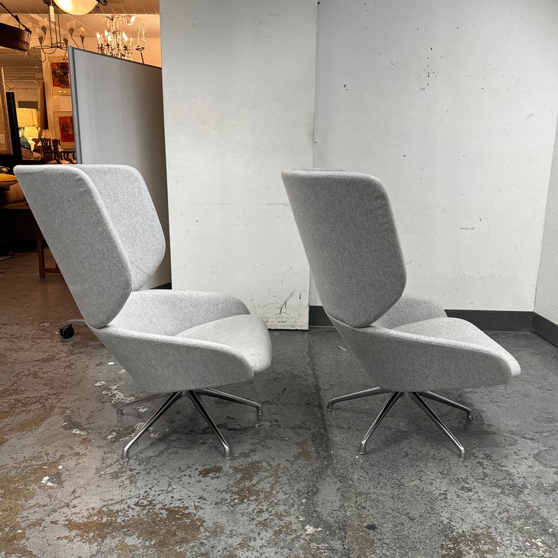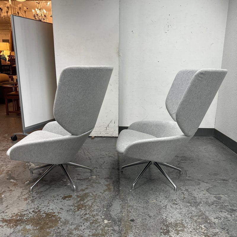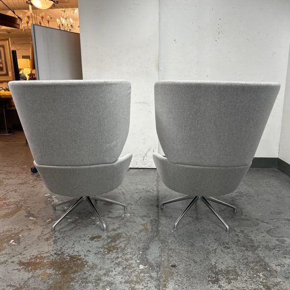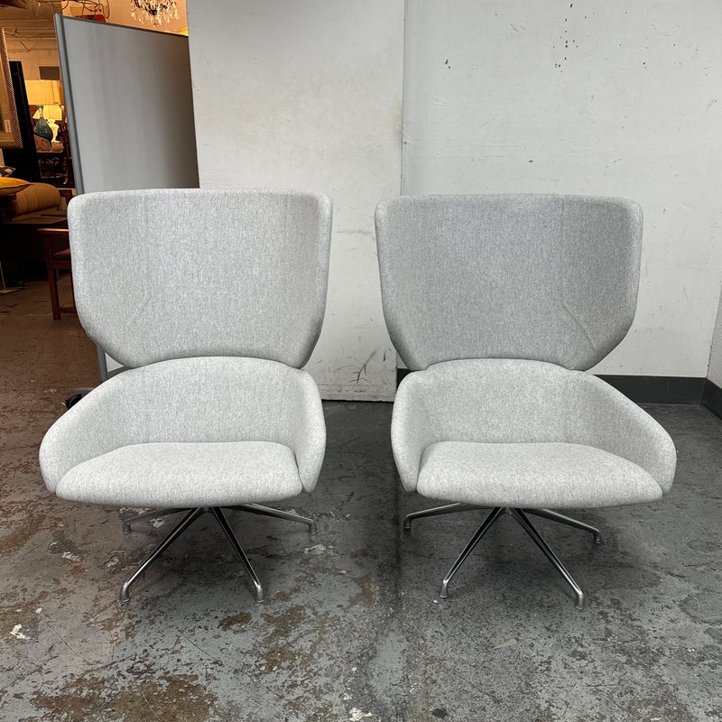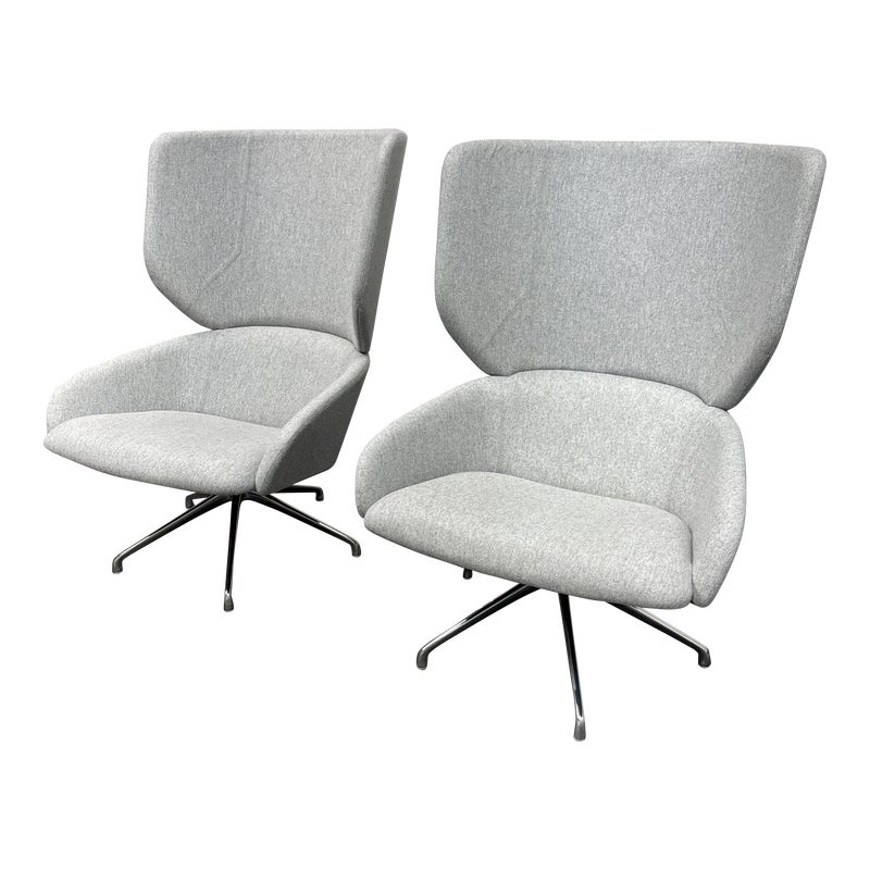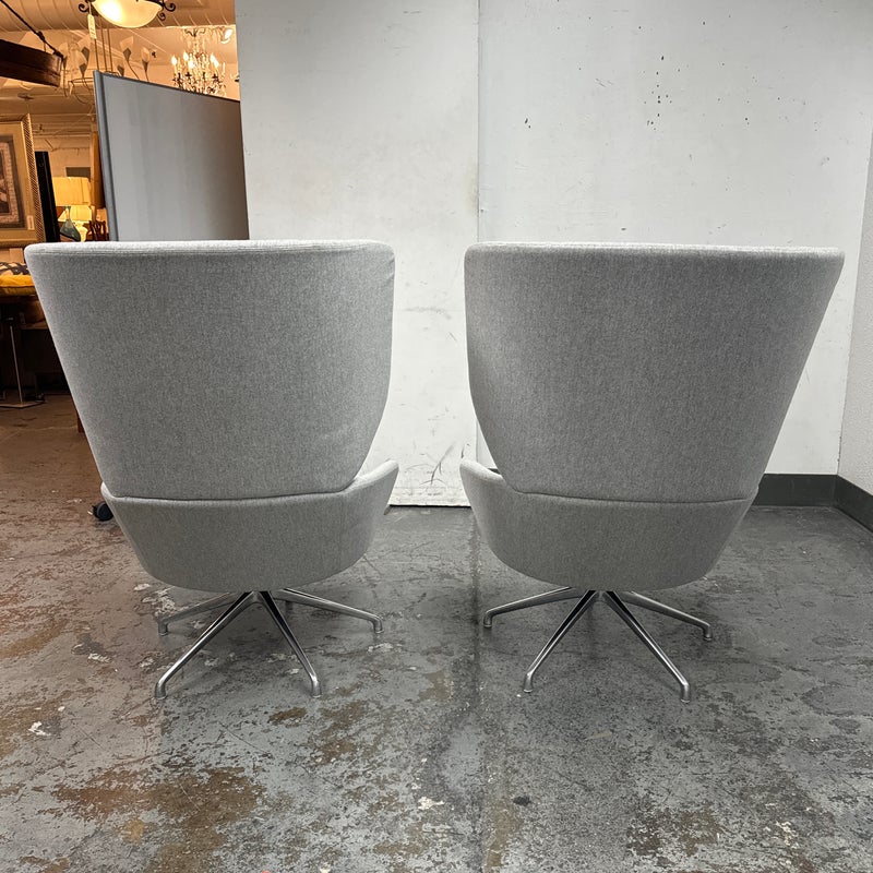 Design Plus Gallery presents a Pair of Heads Up Swivel Lounge Chairs by BluDot. Designed in 2020. Designed to cocoon and cradle, Heads Up has a commanding presence and sheltering upholstered contours. Comfort mode is always in full effect. A Tight upholstered seat and high shaped back with an aluminum swivel base. Upholstered in a Light Grey Heather Fabric. In good condition, minimal wear from usage + age. One chair has visible and minor markings on the fabric. Made in Thailand.