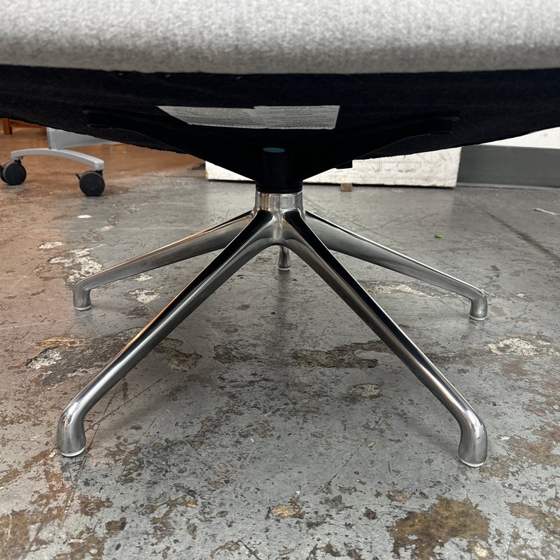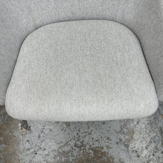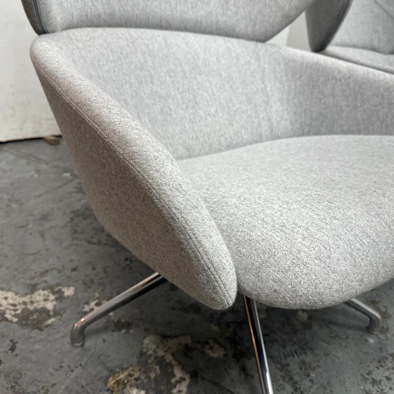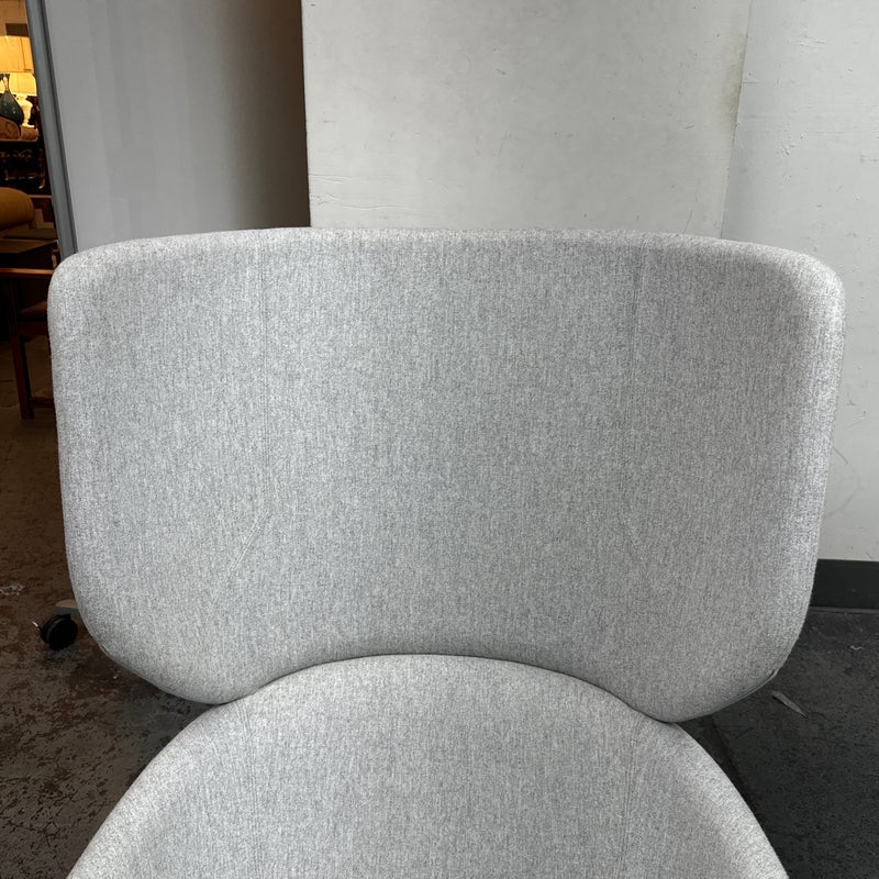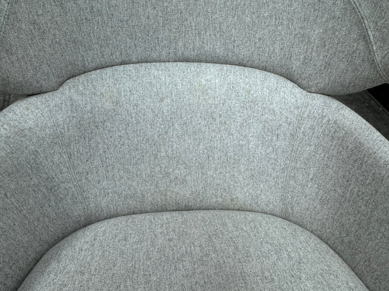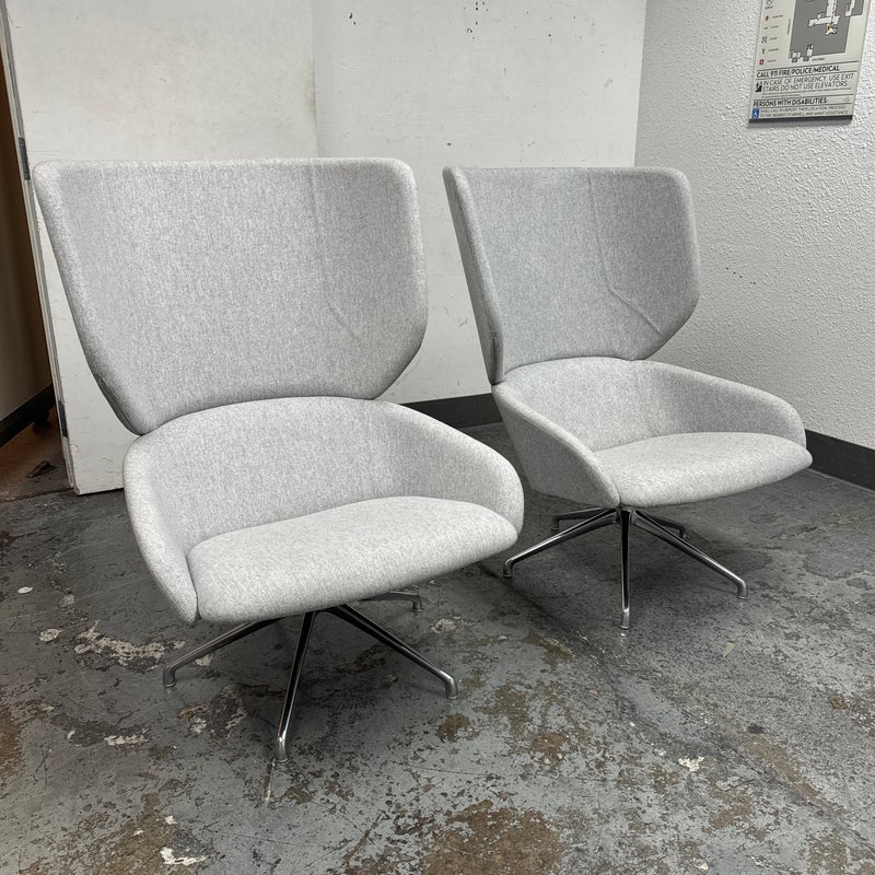 Design Plus Gallery presents a Pair of Heads Up Swivel Lounge Chairs by BluDot. Designed in 2020. Designed to cocoon and cradle, Heads Up has a commanding presence and sheltering upholstered contours. Comfort mode is always in full effect. A Tight upholstered seat and high shaped back with an aluminum swivel base. Upholstered in a Light Grey Heather Fabric. In good condition, minimal wear from usage + age. One chair has visible and minor markings on the fabric. Made in Thailand.