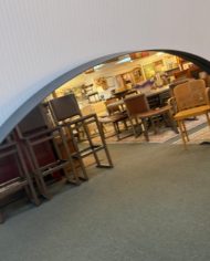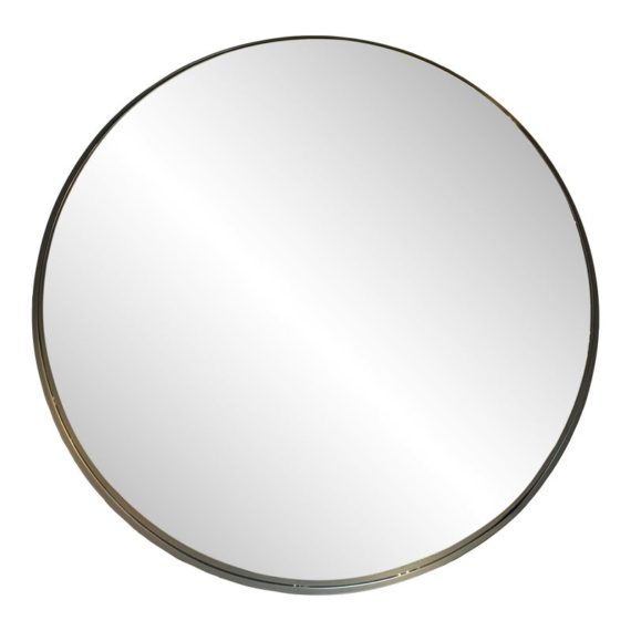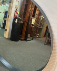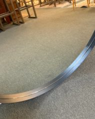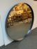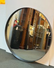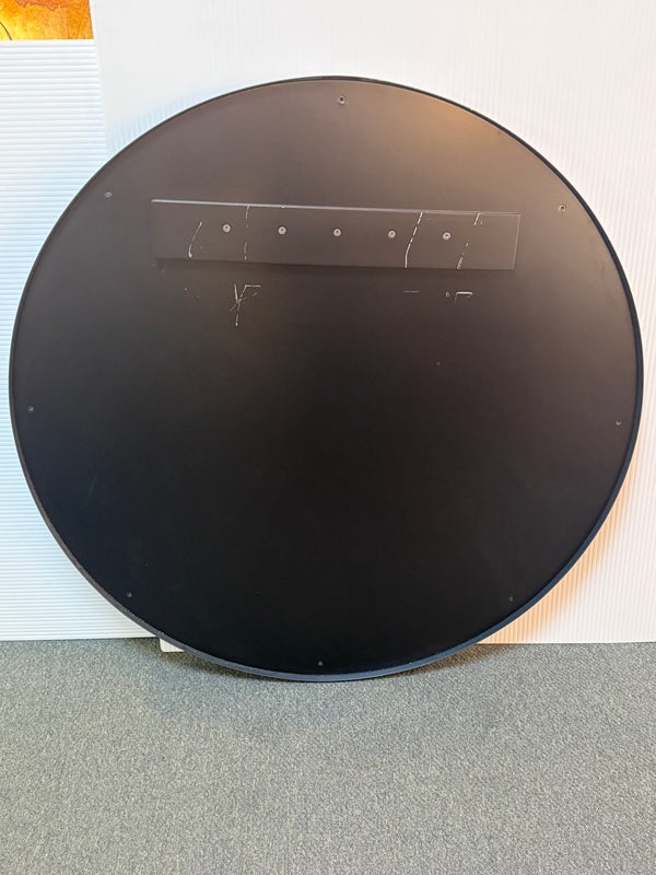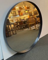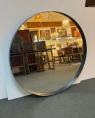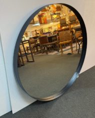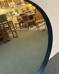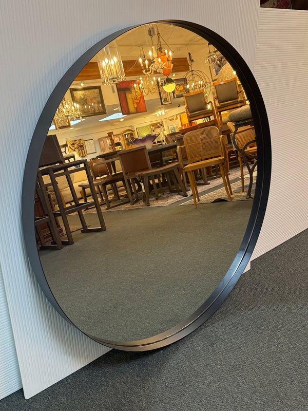 Design Plus Gallery presents a Large Scale Hoopla Wall Mirror by Blu Dot. Referencing its construction, the Hoopla Mirror is a Powder-coated steel hoop that simply wraps around a fully tempered mirror for an understated effect Wall cleat for mounting the large, heavy mirror. Little wear; condition is good; used for staging.