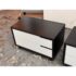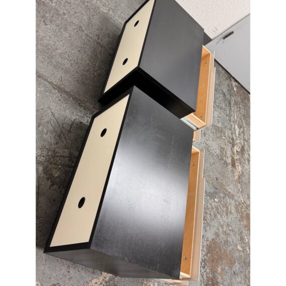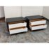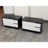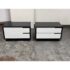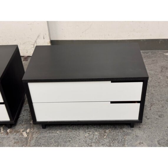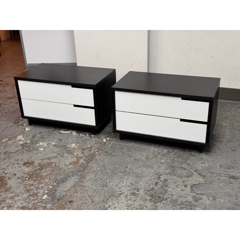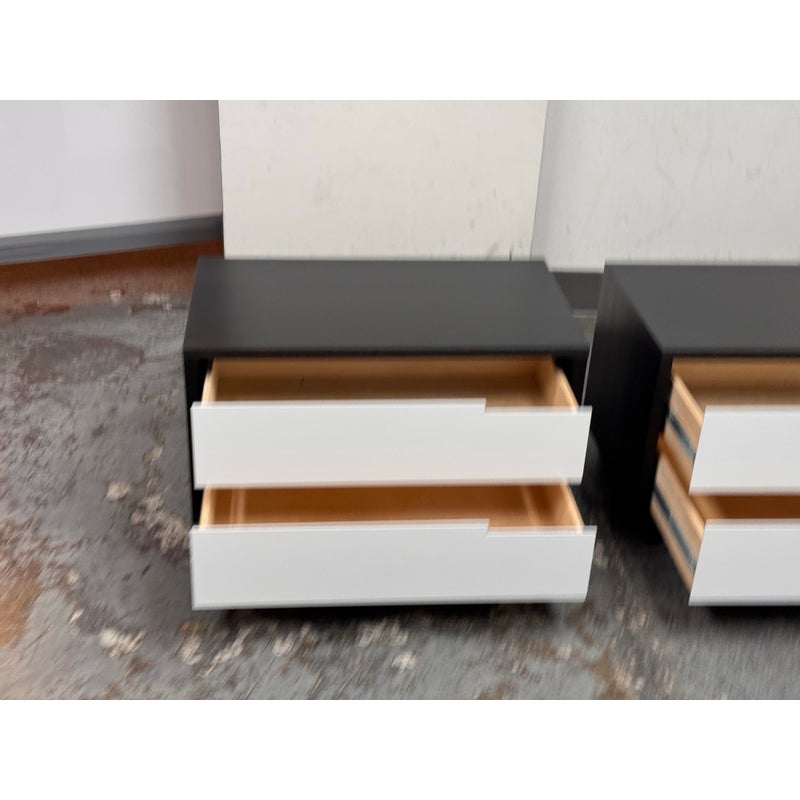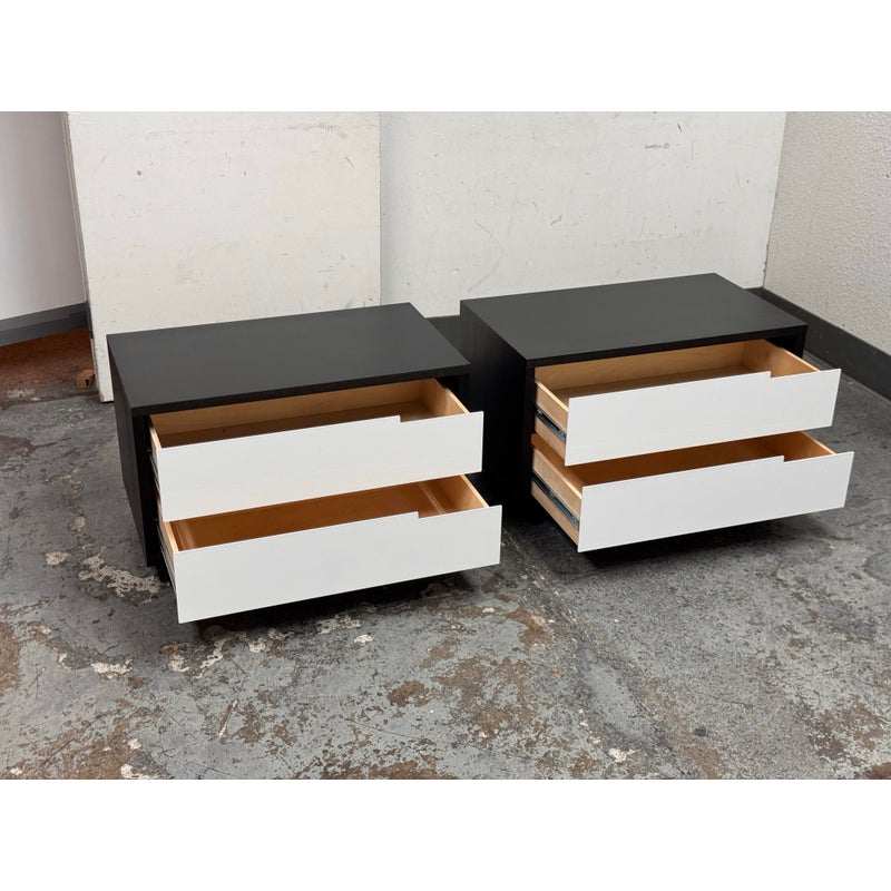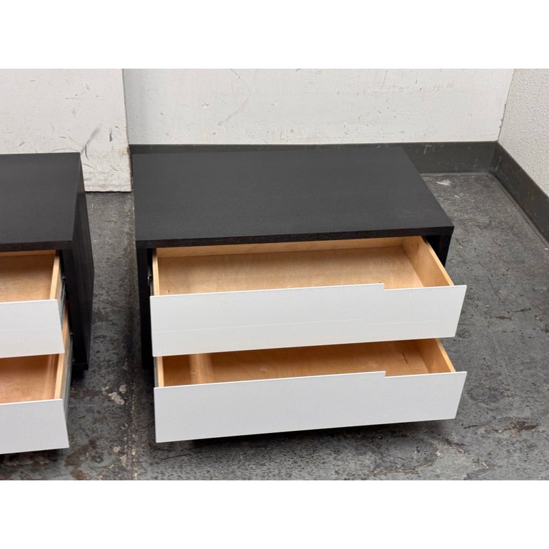 Design Plus Gallery presents a Pair of Modu-licious #1 Nightstands from Blu Dot. These bedside tables are versatile, modern nightstands or small storage unit that have a wooden frame with a graphite-on-oak stain. They have two drawers that are fronted with powder-coated steel in white. Designed for functionality and customization, it includes soft-closing drawer hardware and a finished backs. Both are in good condition for their usage.