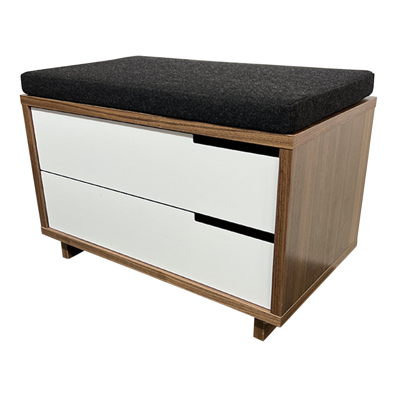 Design Plus Gallery presents a Modu-Licious Storage Bench from Blu Dot. Maple case elevated on short tapered legs, house a pair of roomy white powder-coated steel drawers. Topping it off with a felted upholstered cushion, you now have a spot to plop. Very seldom will you find a this level of storage in a great modern bench. Light surface wear; condition consistent with age and use.