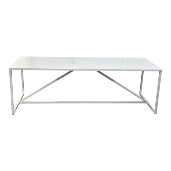 Design Plus Gallery presents an XL Strut Dining Room Table from Blu Dot. The large surface is lacquered in gloss white and the frame has been powder coated in white as well. This table has very clean lines and could easily paired with any number of chair styles. This table provides ample surface space and could also make a fantastic conference table. Is in good condition, with visible and minimal wear for its age + use.