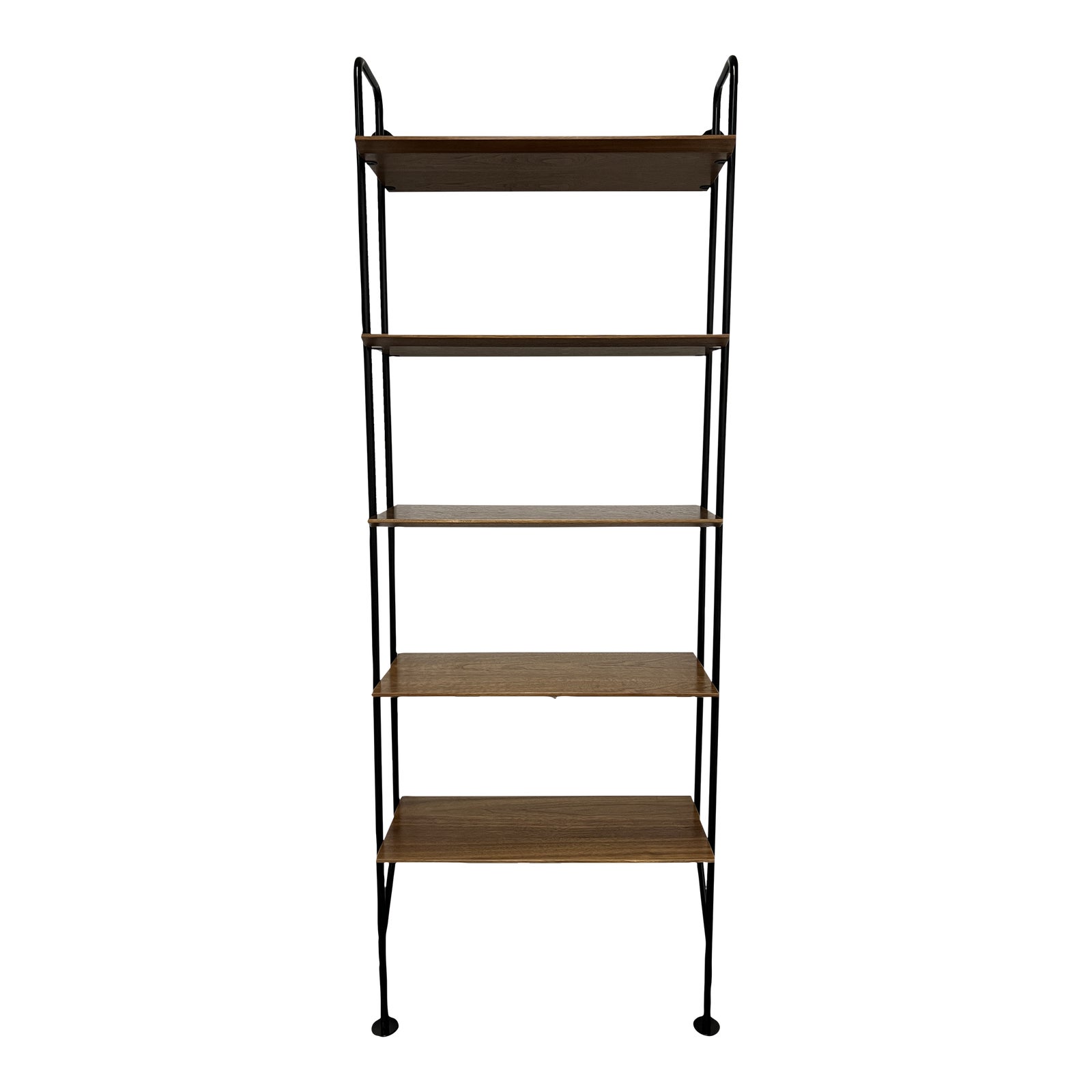 Design Plus Gallery presents a Hitch Bookcase by BluDot. A black powder-coated steel uprights and wood shelves in a walnut finish. Single units stand alone. Minor wear from usage.