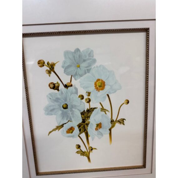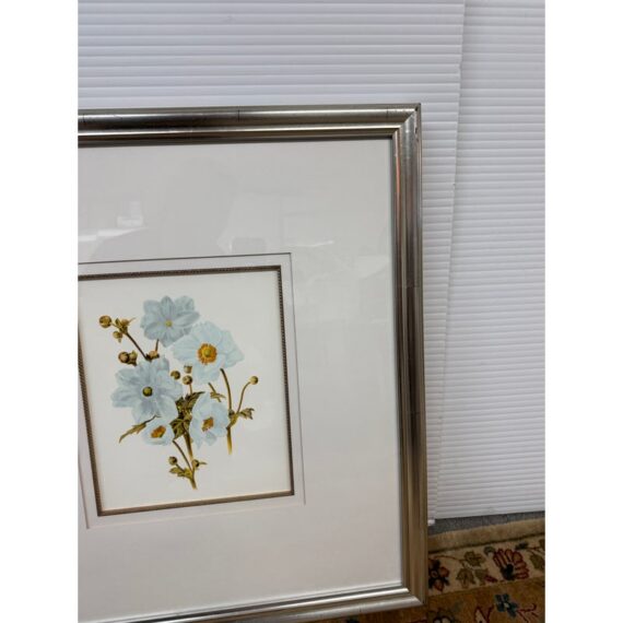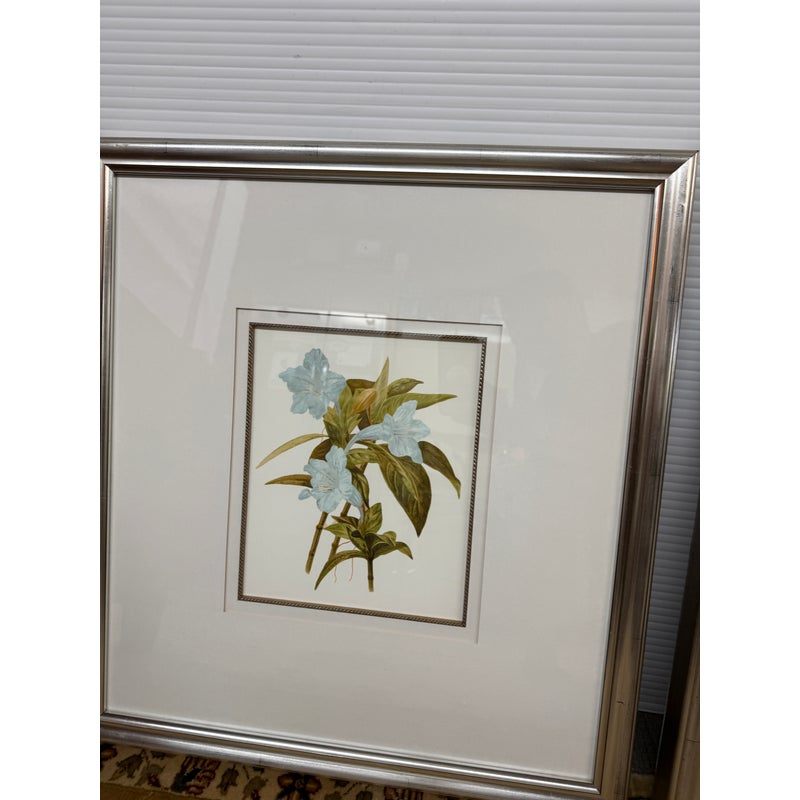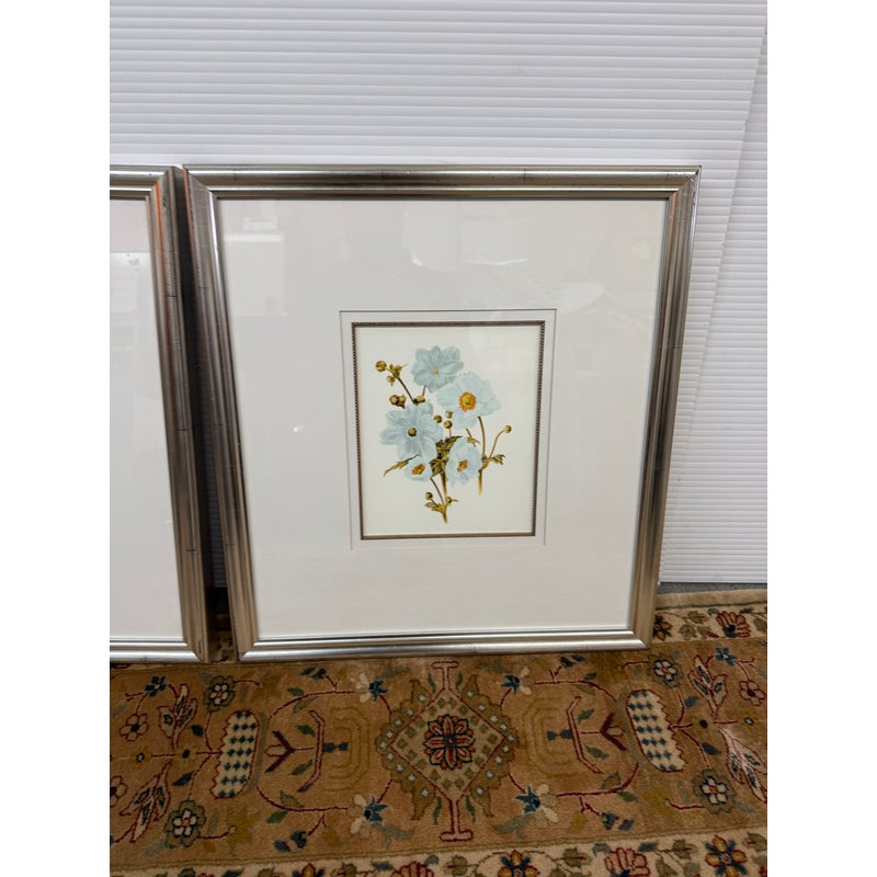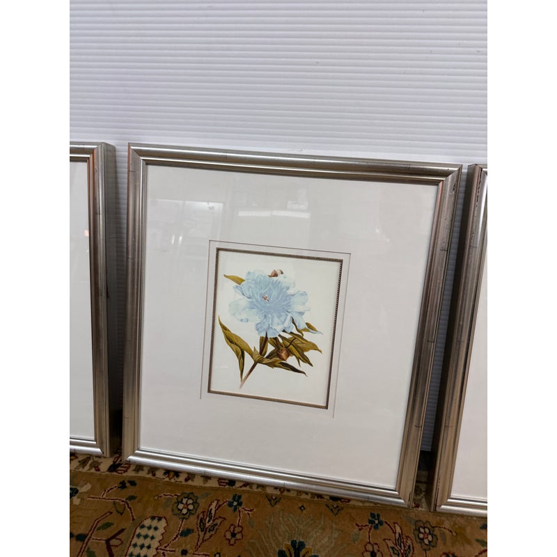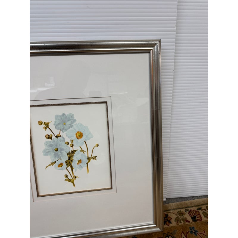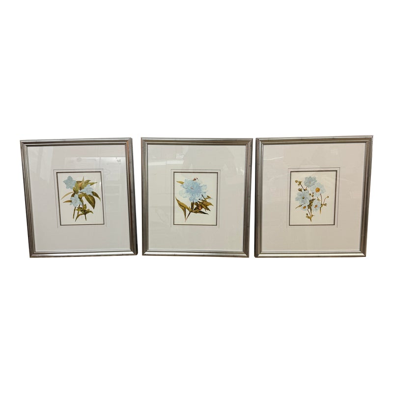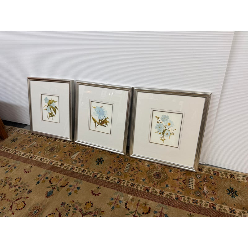 Design Plus Gallery presents a Set of Three Botanical Prints. Popular starting in the 18th century, prints of the like were used to identify and introduce species in the medical field. The set of three botanicals is of flowers that have a soft blue coloring. They are all encased in a silver frame with wide white matte to amplify its imagery. They are all in good condition with identical measurements.