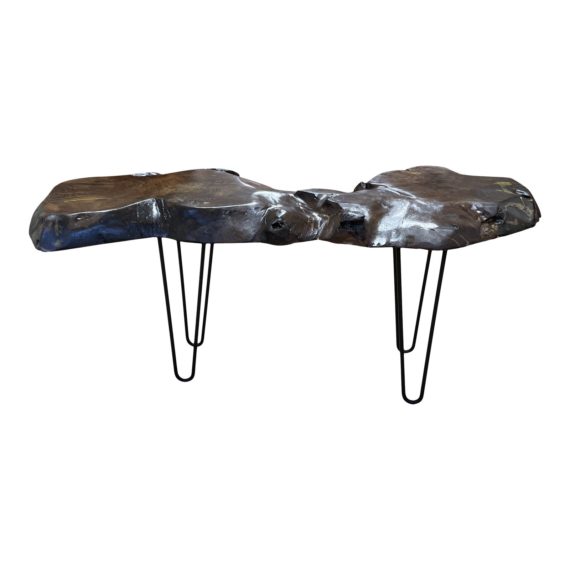 Design Plus Gallery presents a Black Walnut Coffee Table by San Francisco Craftsman Bob Baker. Natural wood with shimmering gold epoxy. Hairpin leg stands support this saton finished surface with rough natural edges. Natural grains + knots gleam from this reclaimed Bench or Coffee Table. Ideal accent for the outdoorsmen or urban naturalist.