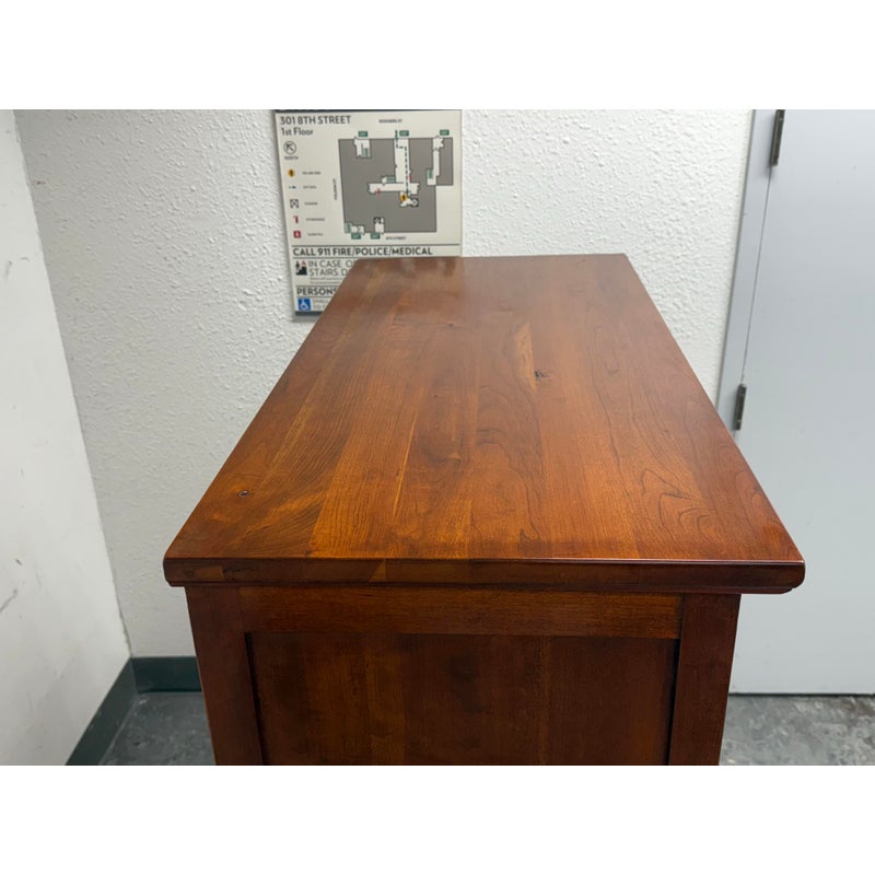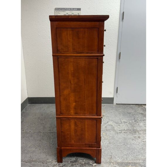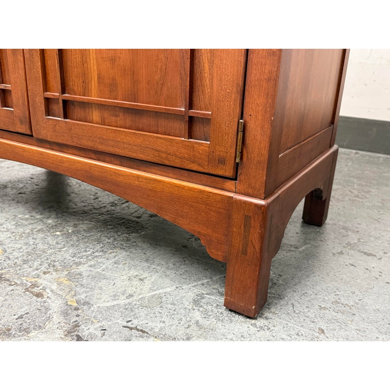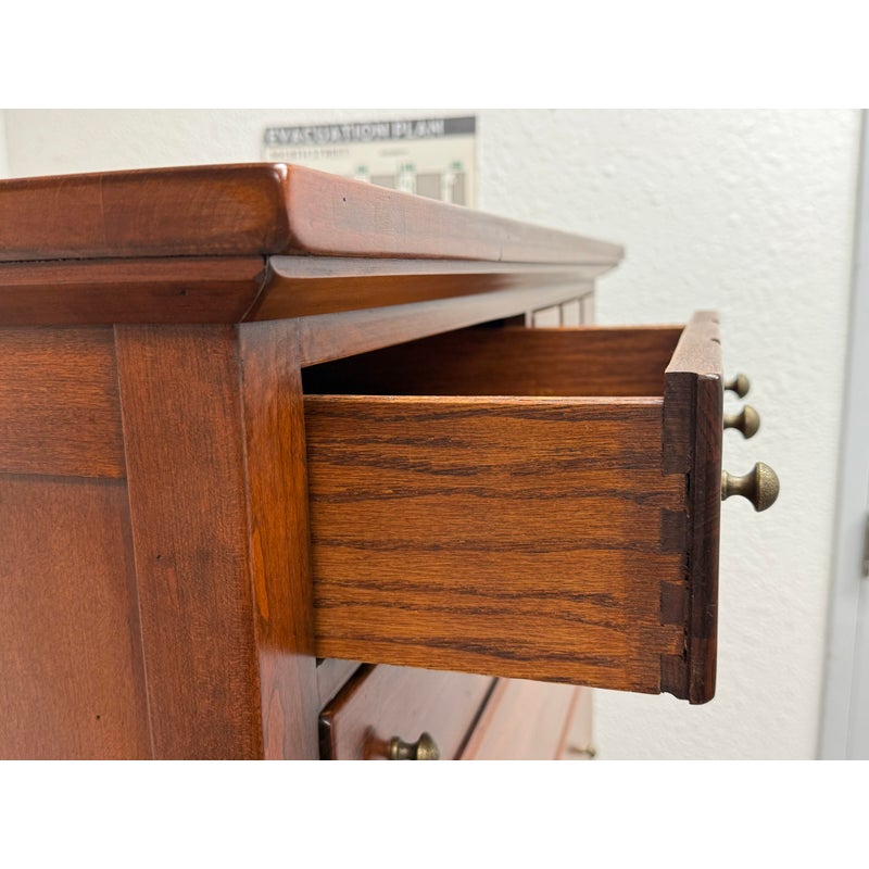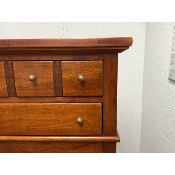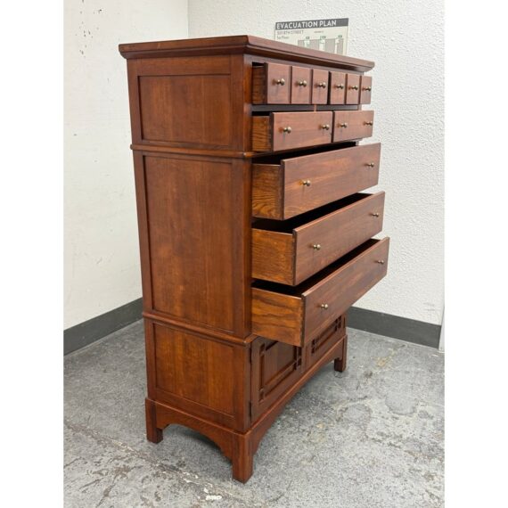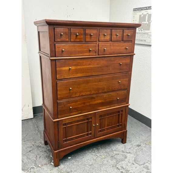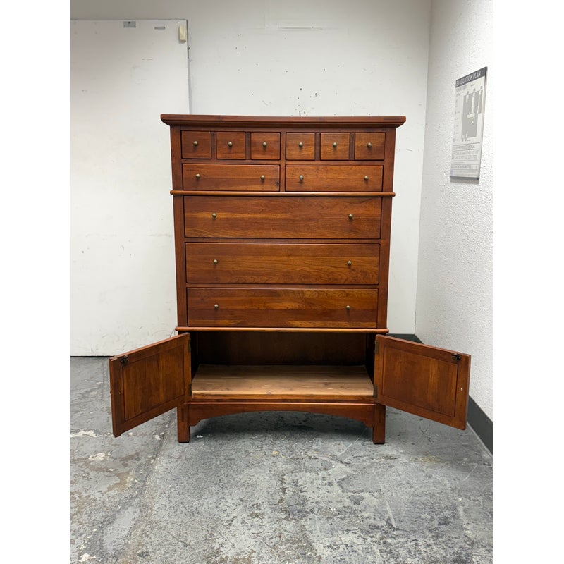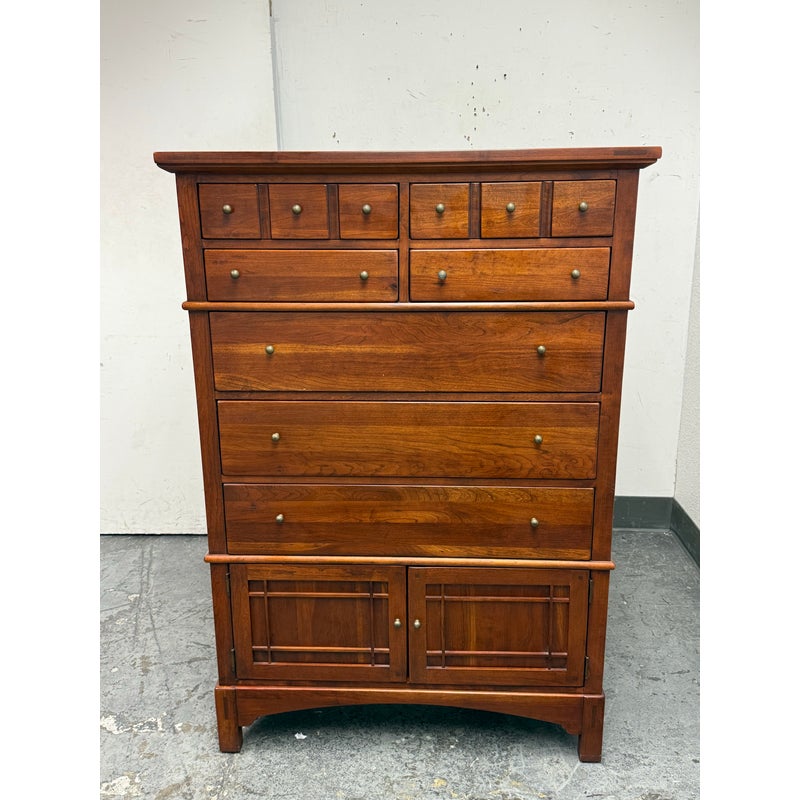 Design Plus Gallery presents a Chest of Drawers from Lexington Furniture with Design by Bob Timberlake. The chest is made of solid cherry wood and gives a reddish hue to the impeccable chest. The chest beckons you to come and organize all your possessions to perfection. The top of the chest has six miniature drawers with two half width size drawer beneath. The middle section offers three same depth drawers while the lowest position of the chest allows to cupboard doors to open for flat folded + bulky items, i.e. blankets. All hardware is present, with small ball shaped pulls in an aged brass tone. The dresser is signed with in good condition with minimal wear for its age + use. This is a discontinued model. Made in the USA.
