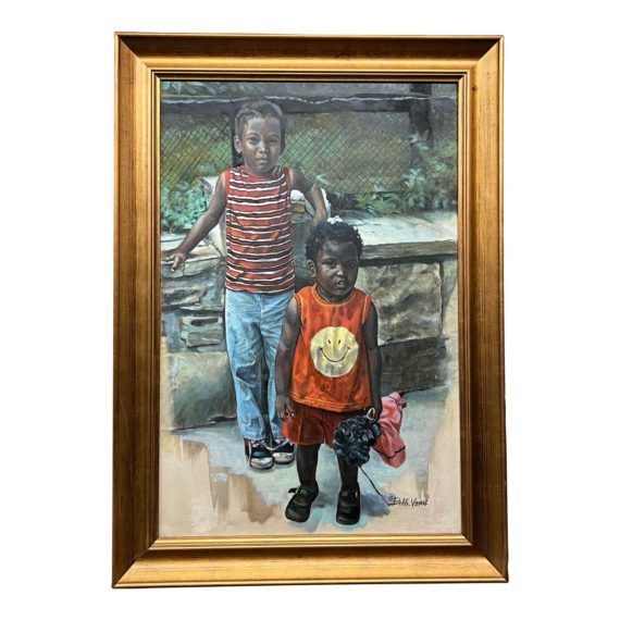 Design Plus Gallery presents “In Charge” an Oil Painting by Bobb Vann Signed + Dated 1990. Bobb founded Vanngo Graphics in 1990 as a way of providing a positive vision of black images through art. In this oil painting still-life composition Vann focuses on a pair of siblings, chainlink fence in the background and child-like cool in hand. Custom framed in gold-finished wood. The picture is in good condition with wear that is consistent with age + use.