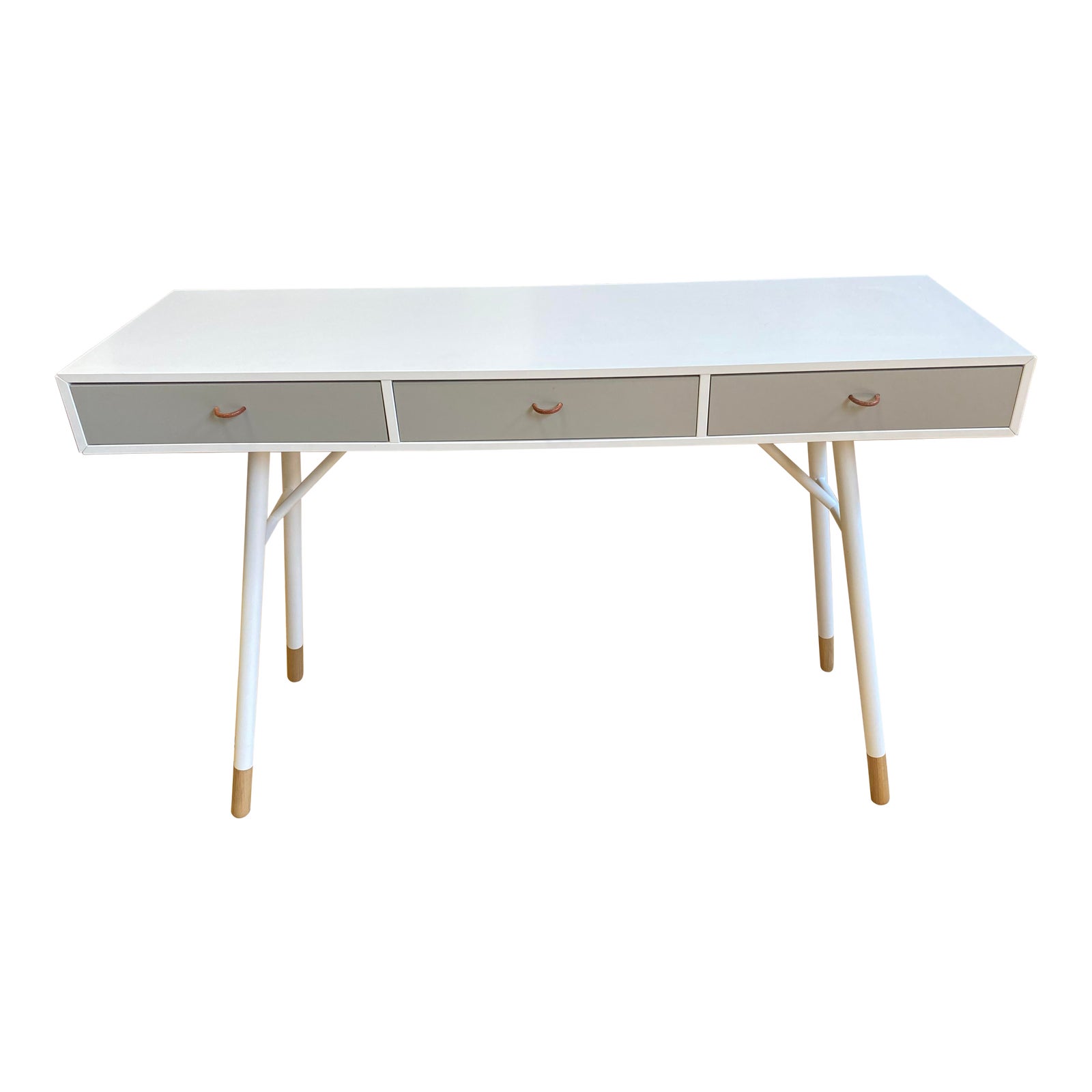 Design Plus Gallery presents a Cupertino Console Table by BoConcept. A slim table top, slender legs and a light design makes the cupertino console table perfect in the narrow space of a hallway, as extra storage in a small living room, or perhaps as a bedroom dressing table. Tabletop is a matte white lacquered with a matte ash gray lacquered drawer fronts. Minor wear.