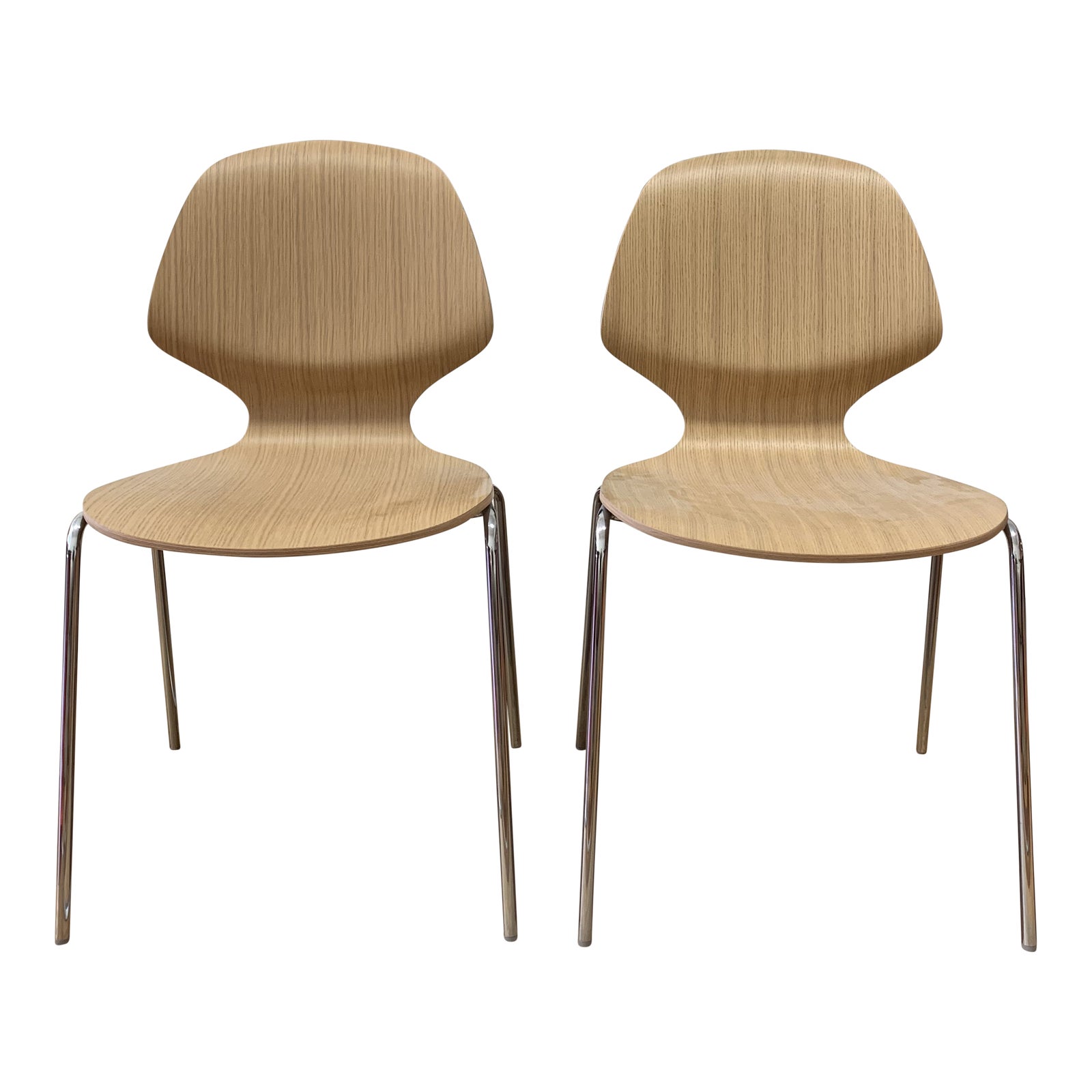 Design Plus Gallery presents a Pair of BoConcept Florence Stackable Chairs in Chrome + Oak. Organic form is both lightweight and practical for entertaining while providing maximum comfort. Minor wear, small stain on one of the seats. Designed by ARDE with excellent craftsmanship in the engineering of the steam bent Oak Veneer and stack-ability of the polished Chrome bases.