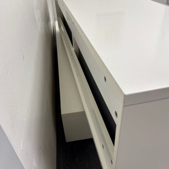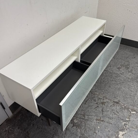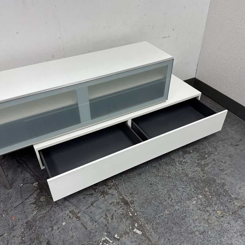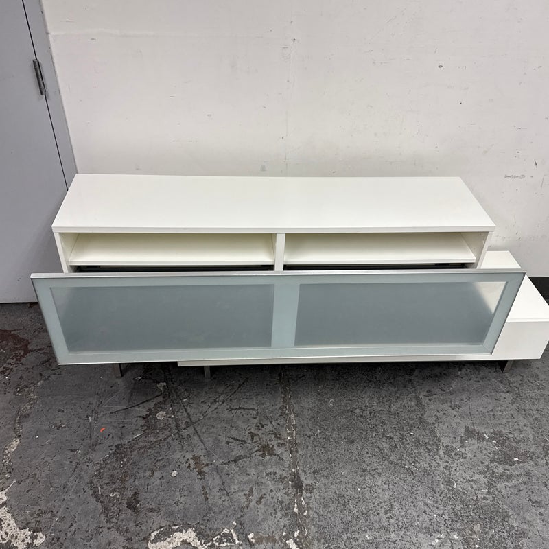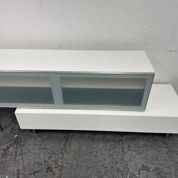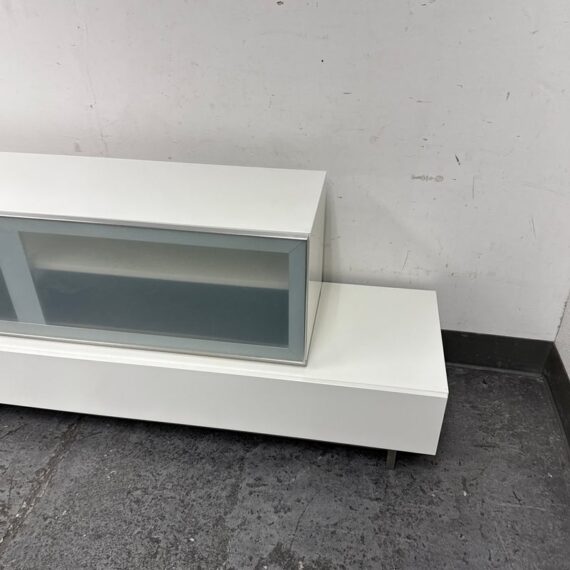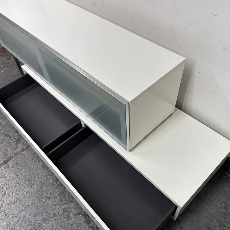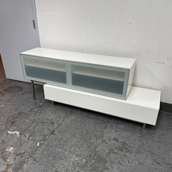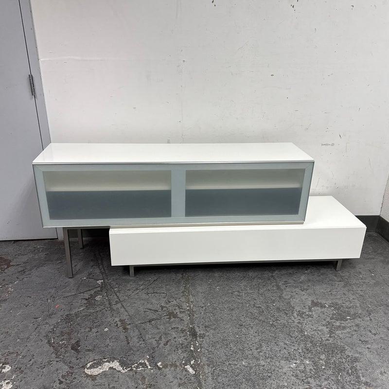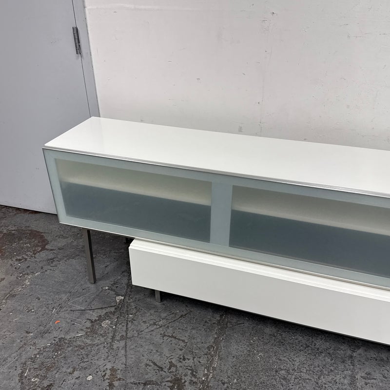 Design Plus Gallery presents the Volani Two Piece White Media Sideboard from BoConcept. Sleek + modern with clean lines and an asymmetrical style. Gives the allusion of floating in the room. Great piece that will conceal your media units with the frosted glass panels. Is in good condition with minimal surface wear. This was a limited and now discontinued model.