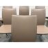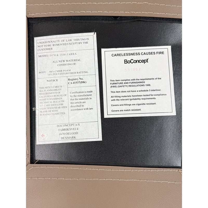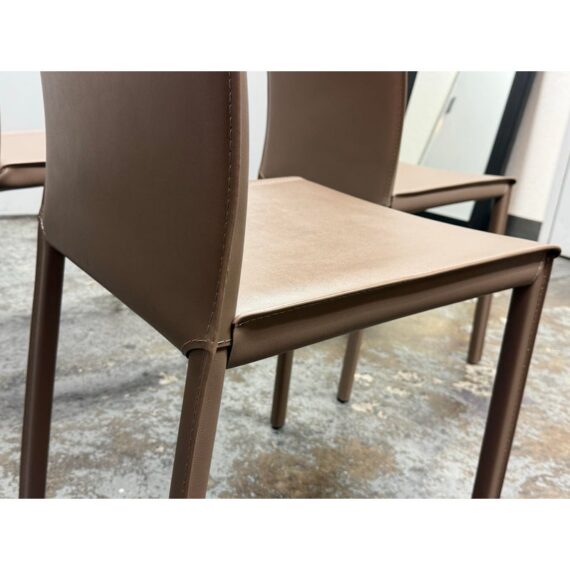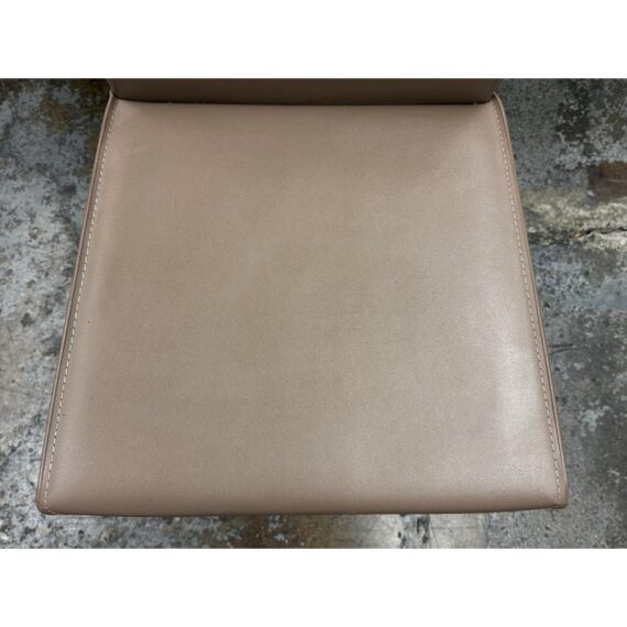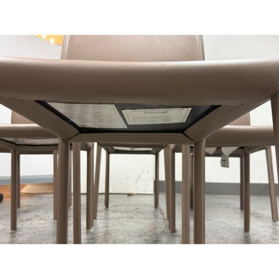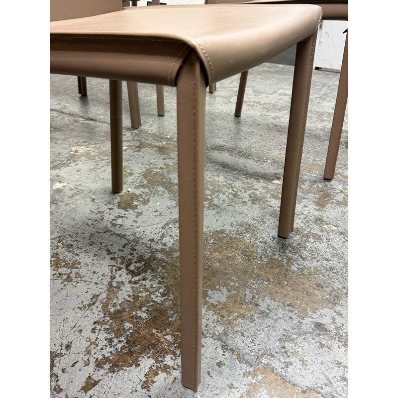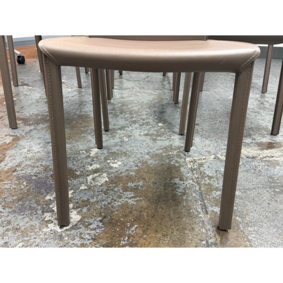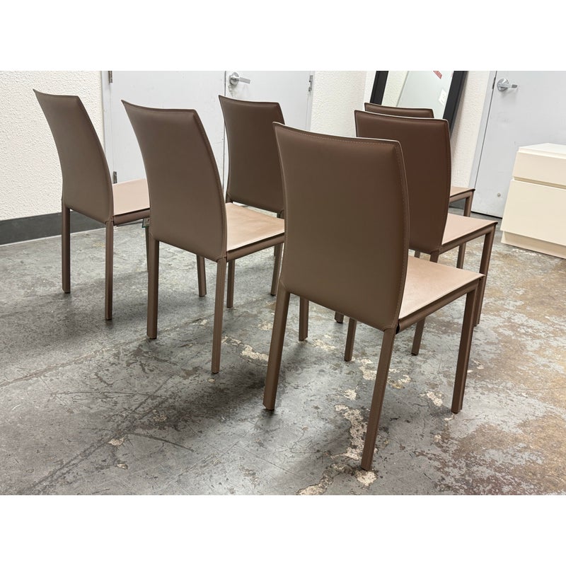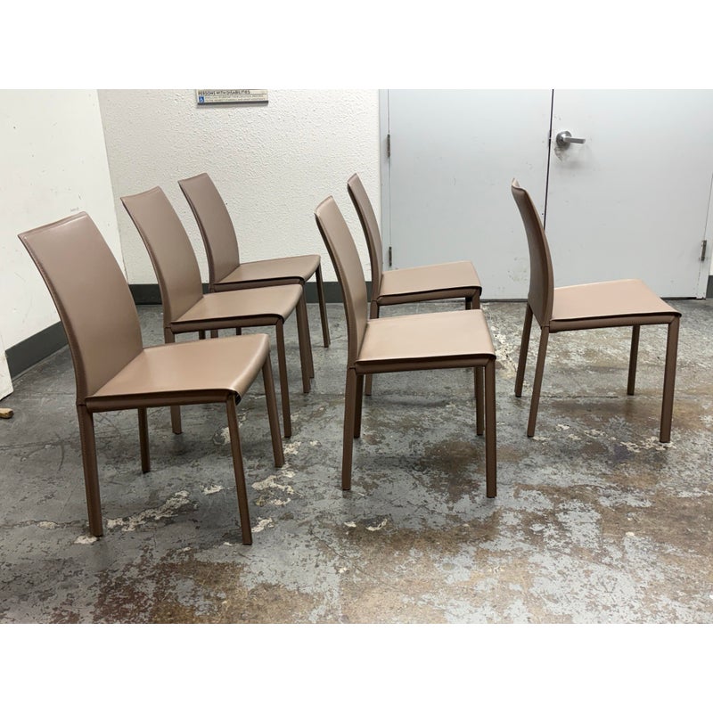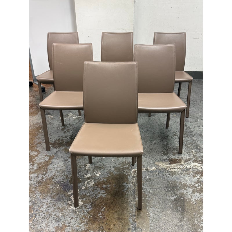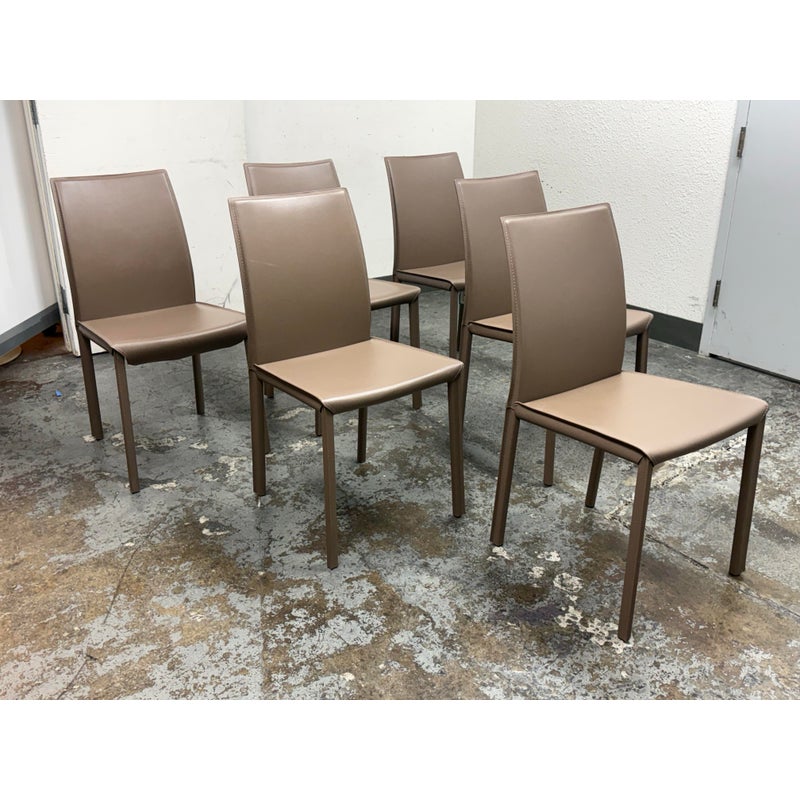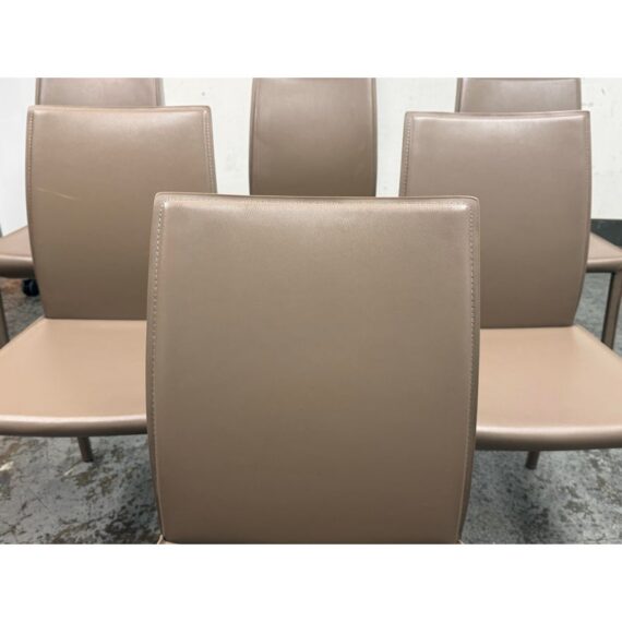 Design Plus Gallery presents a Set of Six Zarra Leather Dining Chairs from BoConcept. The chairs are tall, gently curved profile with leather upholstery extending over the frame and legs for a fully tailored look. The taupe-toned leather and narrow silhouette give the set a restrained, contemporary presence, while stitched detailing along the edges defines the contours. These are discontinued models with the brand and are in good condition with visible and minimal wear from usage. Made in Denmark.