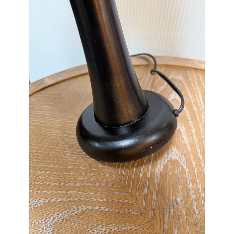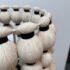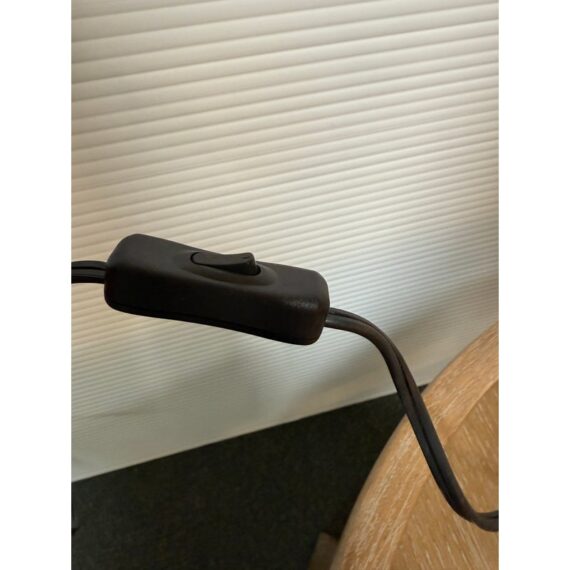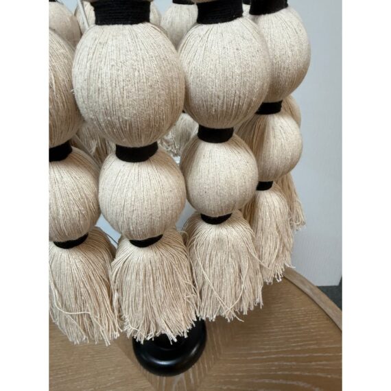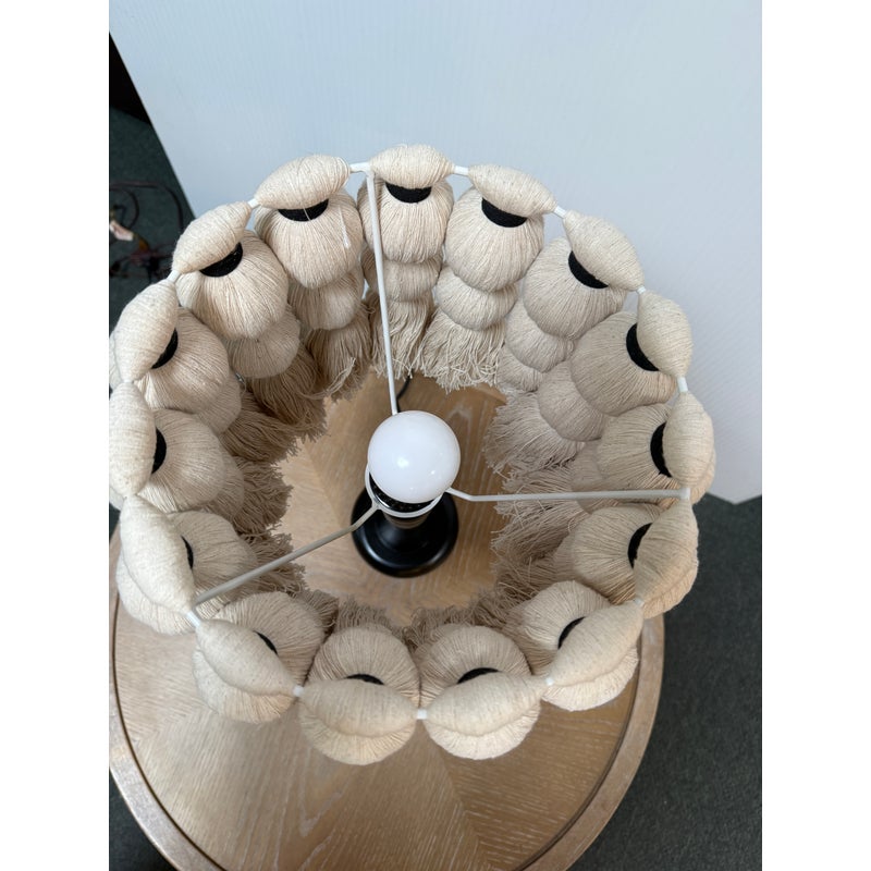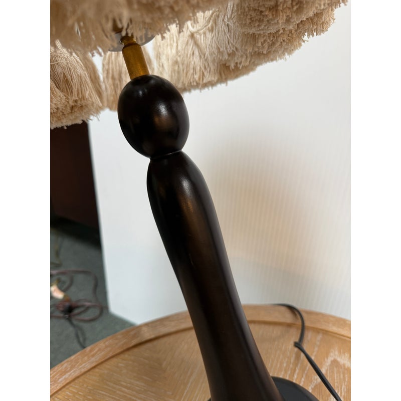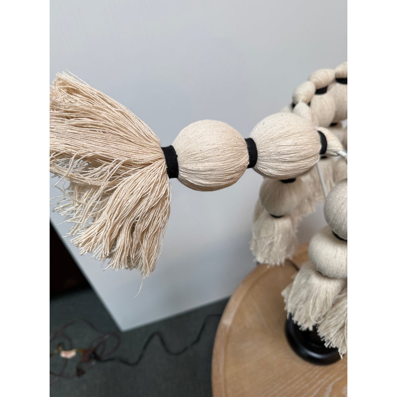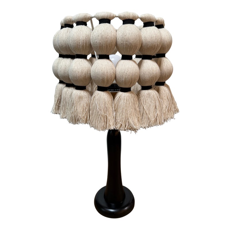 Design Plus Gallery presents a Ball Tassel Shade Table Lamp. Funky and so fun, the cotton covered tassels bump their way down the lamp. Simple, dark stained wood base is the perfect contrast to this unique lamp. Little surface wear; condition is good.