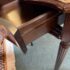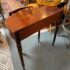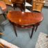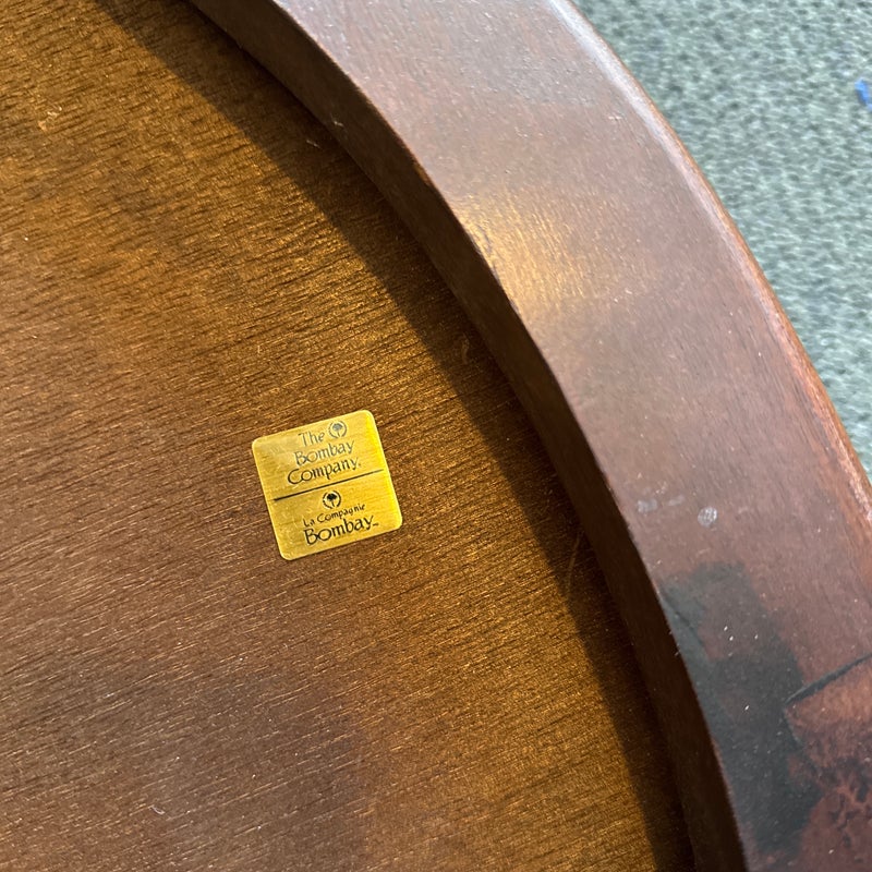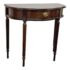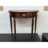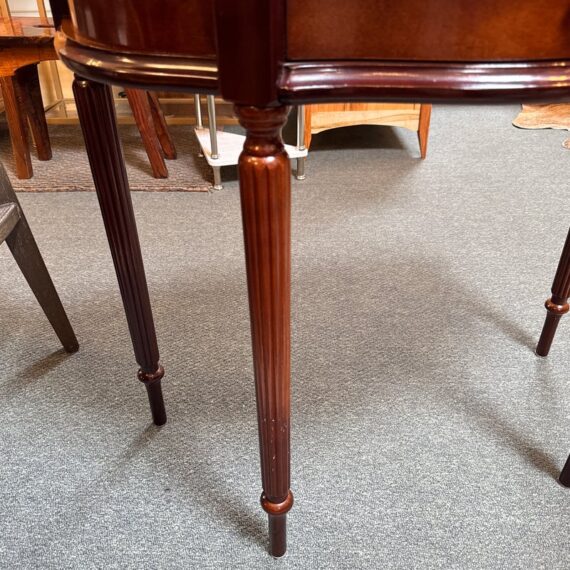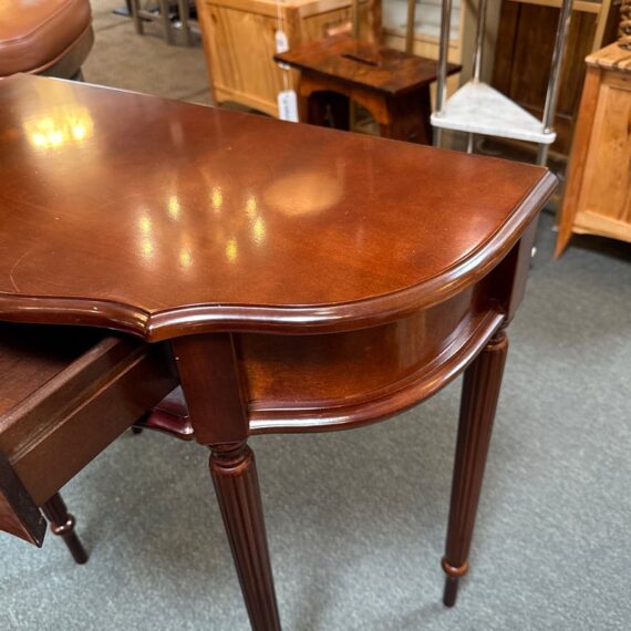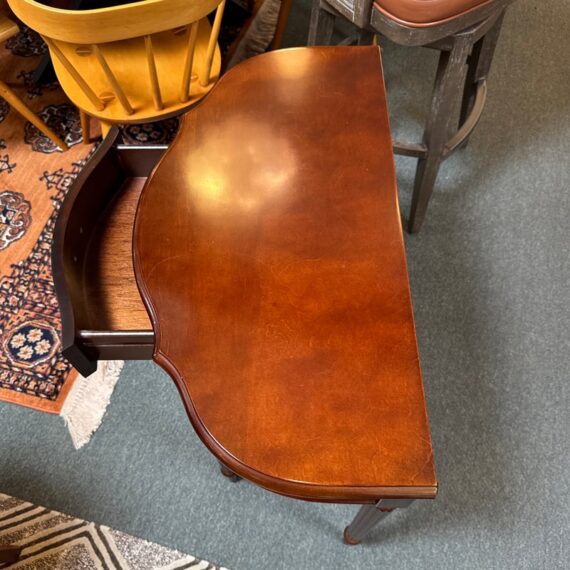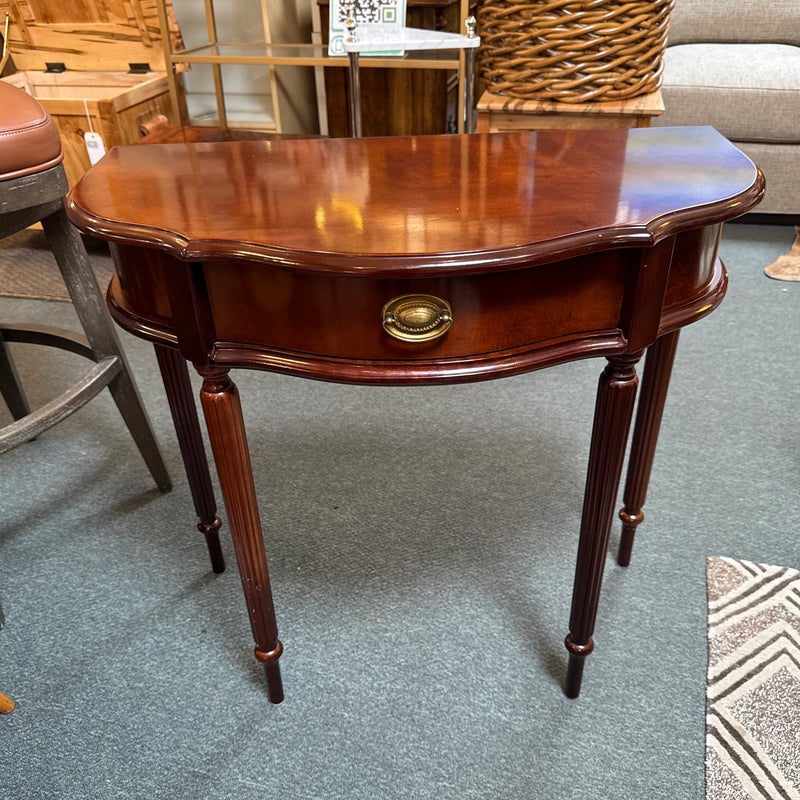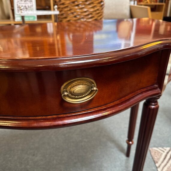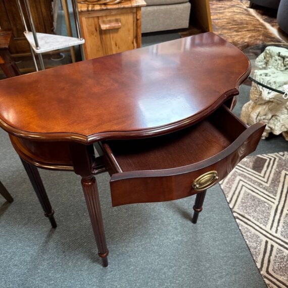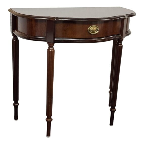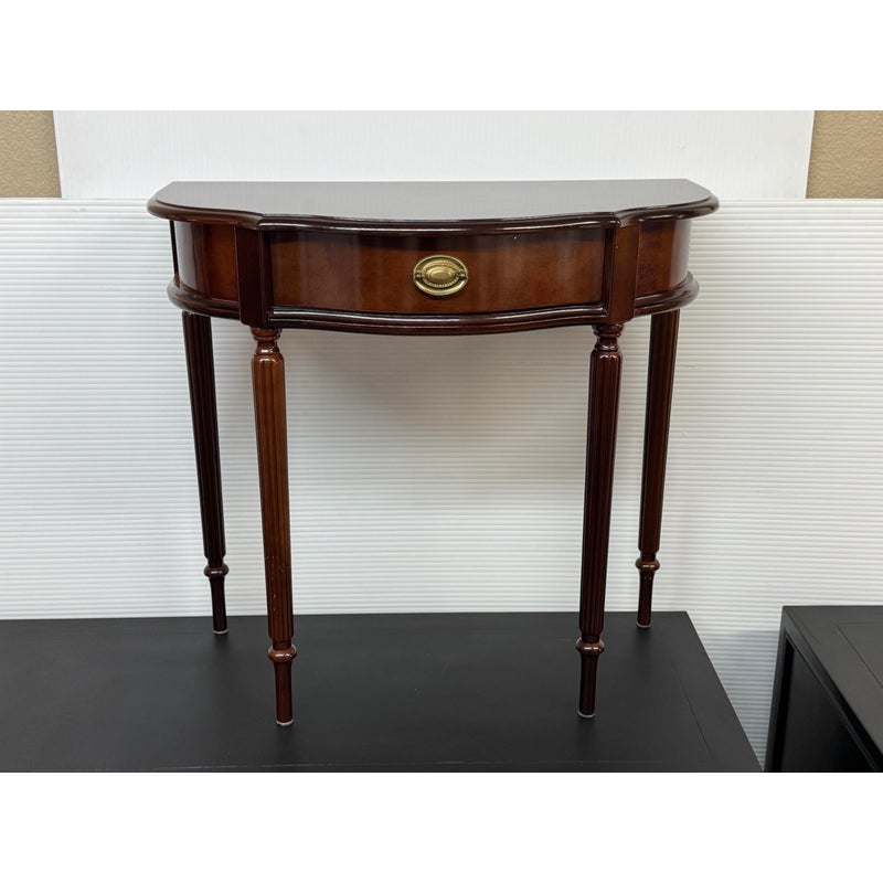 Design Plus Gallery presents a Console Table from the Bombay Company. The vintage piece console table has a mahogany finish with brass hardware in a Federal style. The table is a half circle shape making it a great, space saving piece for entry way. There is a single, shallow drawer in the center for storing small items for practical reasons. Four tapered legs with fluted carvings amplify its Traditional/Federal style. Overall the table is in good condition with minimal signs of wear for its usage.