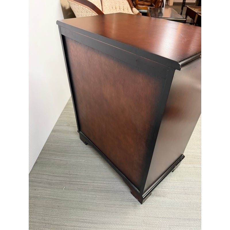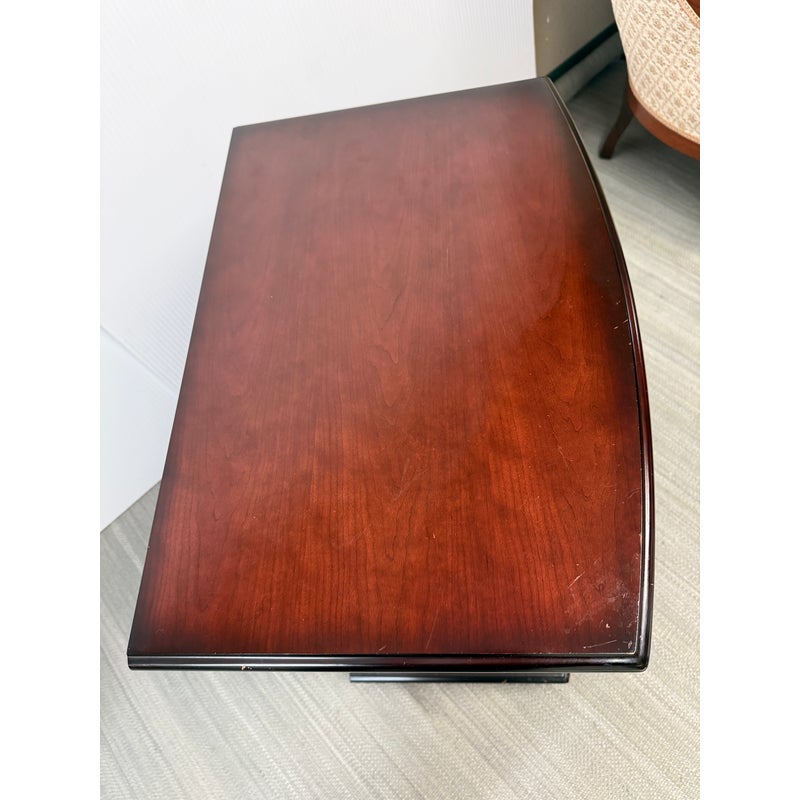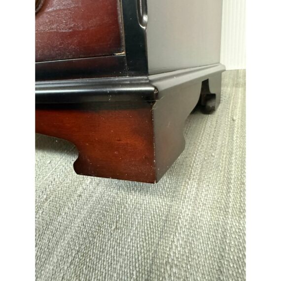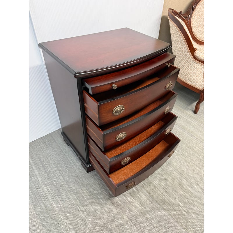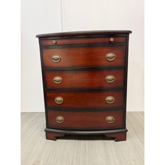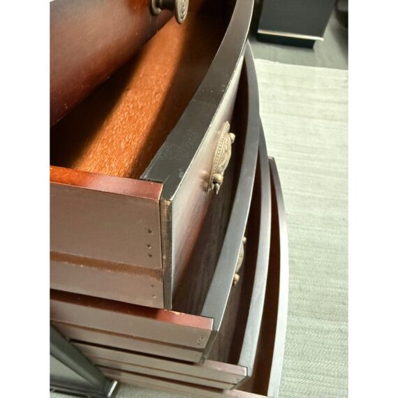Design Plus Gallery presents a Hepplewhite Style Four Drawer Dresser from Bombay Company. The dresser features distinctive bow-front drawers adorned with Hepplewhite-style brass hardware. The top of the dresser includes a convenient pull-out table extension, perfect for use as a writing surface or for extra display space. The finish is an ombre effect, with softly graduated black edges that fade into a warm, rich mahogany center, highlighting the grain of the wood. This is a discontinued model. In good condition, visible and minimal wear from usage. Made in Malaysia.