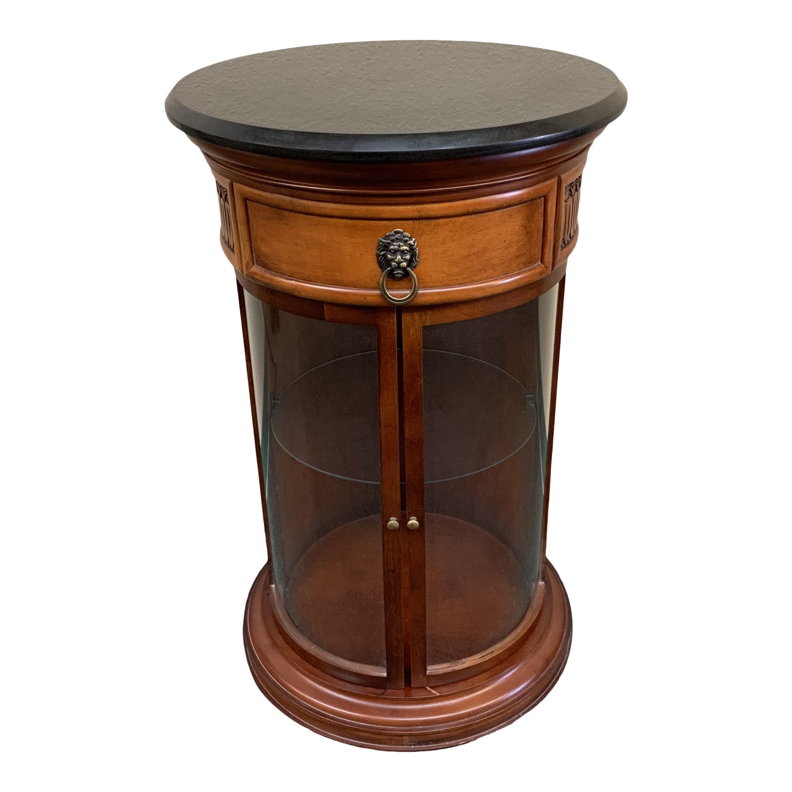 Design Plus gallery presents a Bombay Company Travertine + Glass Wood Column Cabinet. Beveled Travertine top complements column maple base. Glass doors make for lightness and display space. Charming lion’s head adds an old world feel to this unique side table. Made of Maple Construction.