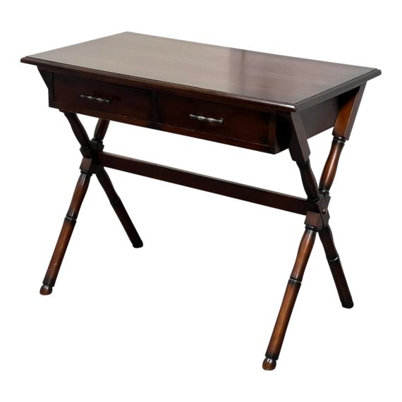 Design Plus Gallery presents a Cherrywood Writing Desk by Bombay Furniture Company. the desk has bamboo-esque legs that criss cross each other and held any a connecting arm. The desk also has two equal drawers, with identical bamboo shaped iron pulls. The table has a rich cherry finish and overall the table in is good condition, wear consistent with age + use.