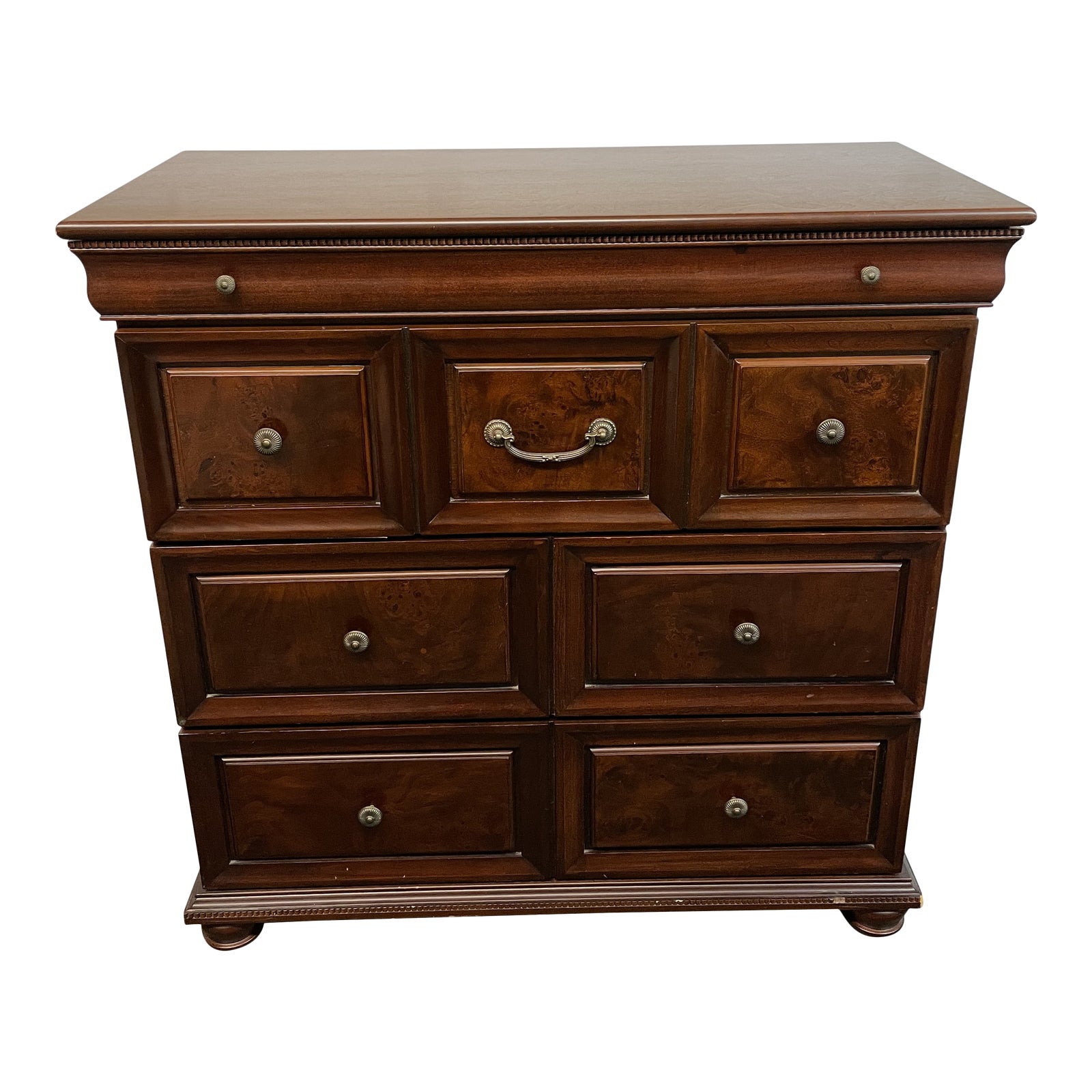 Design Plus Gallery presents a Bombay Four Drawer Dresser. Turned feet supports the maple frame and dovetail joinery. Three drawers of equal size anchor the medium scaled dresser. Counter height gives enough presence without dominating a space. Dental molding surrounds the top for a neoclassical touch. Oiled brass hardware anchors each panel which is veneered with a dramatic burl wood. Shallow tray located at top for convenience. Visible wear on frame. Made in Malaysia.