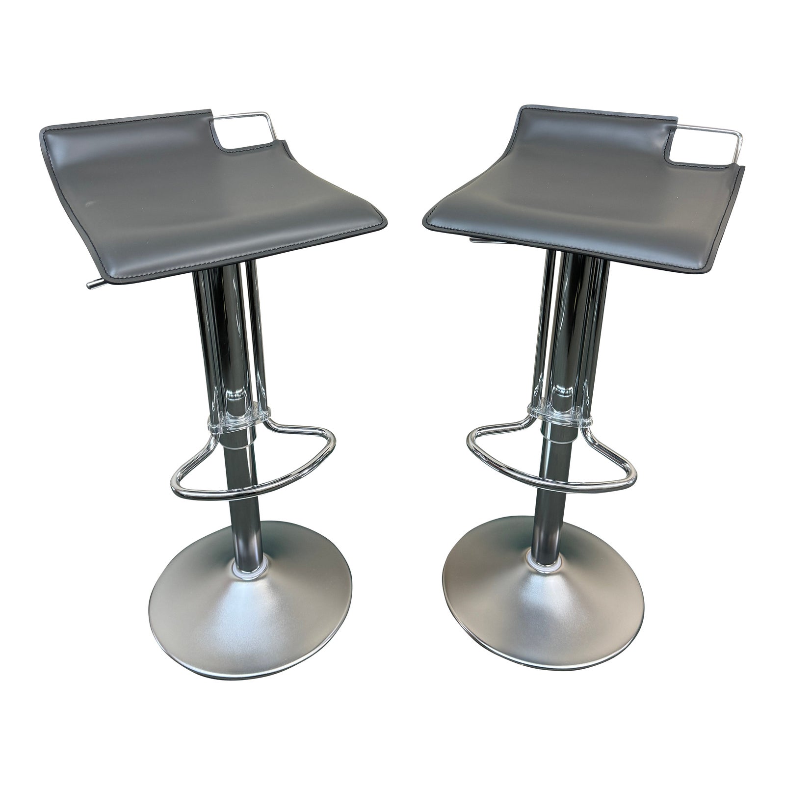 Design Plus Gallery presents a Pair of Hoppy Lift Stools by Bonaldo. Designed by Giorgio Manzali in Italy, the modern stool is created with a chrome swivel base and a gas piston lift giving an adjustable Italian Leather seat height ranging from 20-30 inches. A simple and elegant seating solution from one of Italy’s top contemporary furniture manufacturers. Little wear; showroom sample condition.
