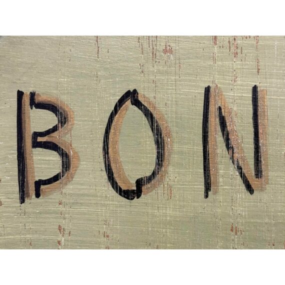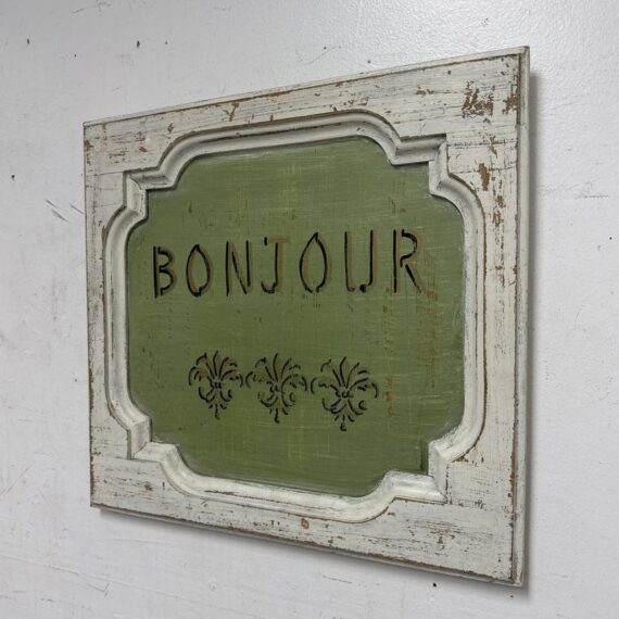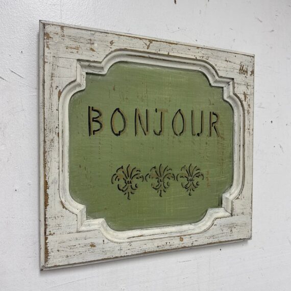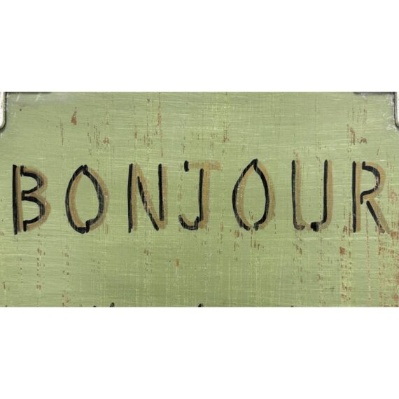 Design Plus Gallery presents a Bonjour Wall Sign. A shabby chic distressed wood sign features the word “Bonjour” prominently displayed, adding a warm and welcoming touch to any space. The background is a soothing blend of gray and green tones, creating a subtle yet elegant backdrop that enhances the rustic aesthetic. The letters of “Bonjour” are crafted in a bold black font with tan accents, giving the sign a vintage, weathered look that perfectly complements its distressed wooden texture. Ideal for adding a bit of French-inspired charm to your home decor, this sign effortlessly combines rustic appeal with understated elegance. In good condition, visible and minimal wear from usage.