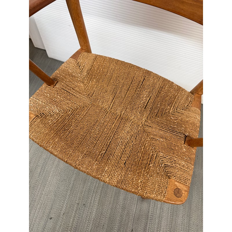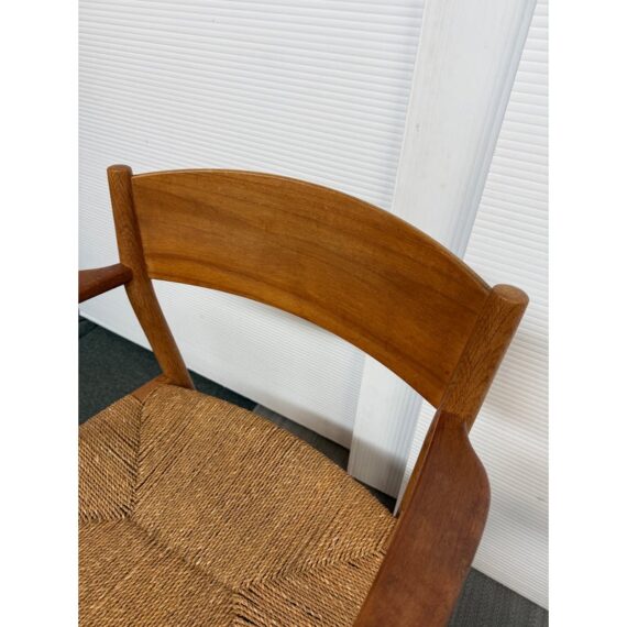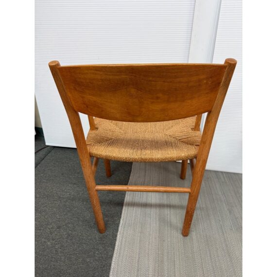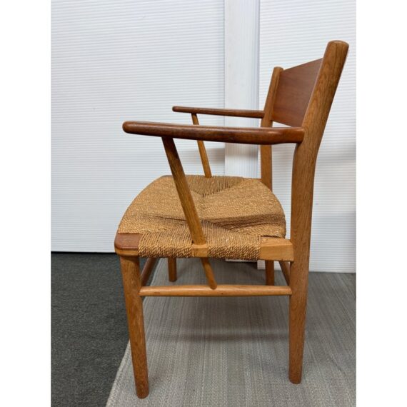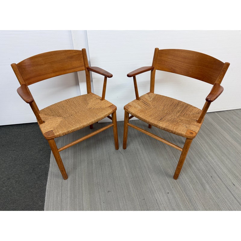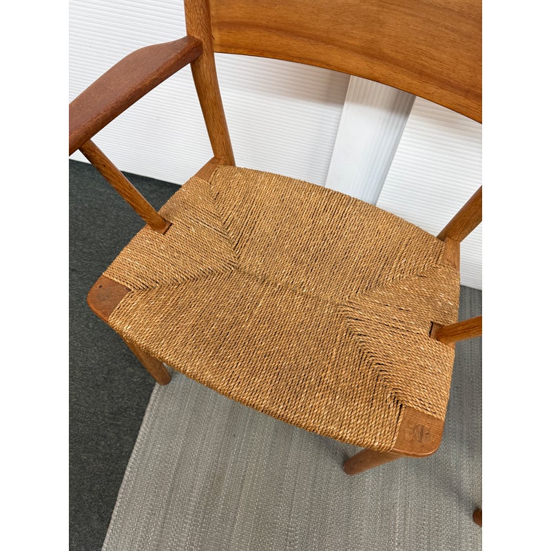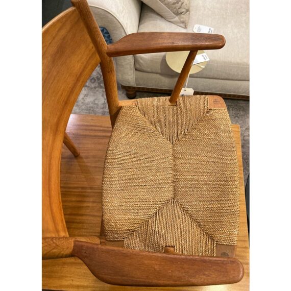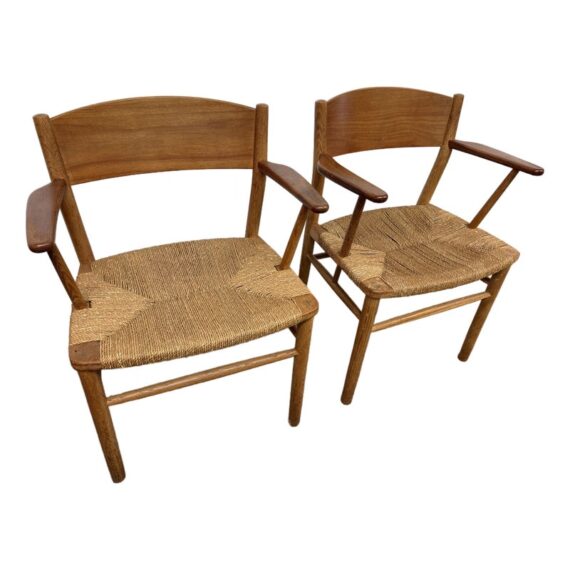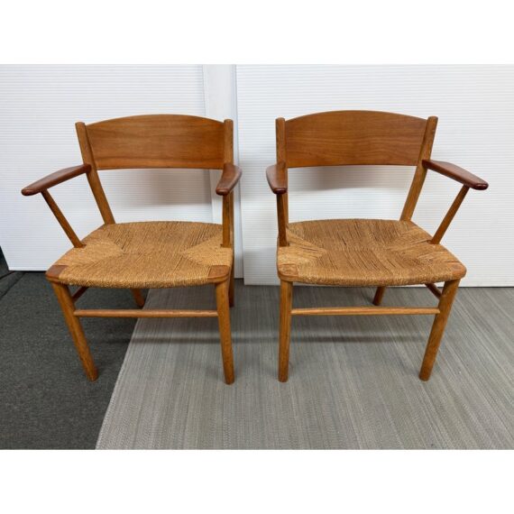 Design Plus Gallery presents a Pair of No.156 Arm Chairs from Borge Mogensen. This pair of sensational mid 20th century chairs are as organically modern now as when they were crafted. They are created in what is referred to as pegged construction where wooden pegs are used to reinforce the joint by inserting them through the tenon and mortise, thereby adding additional strength and stability to the joint. The seat of the chair is wrapped in rush, offering a bounce to the seat that is natural and enduring. We love that their shallow arms allow them to pull up close to the table. Wear is consistent with vintage age and use with several cords have started to loosen on one seat.