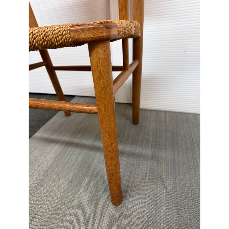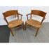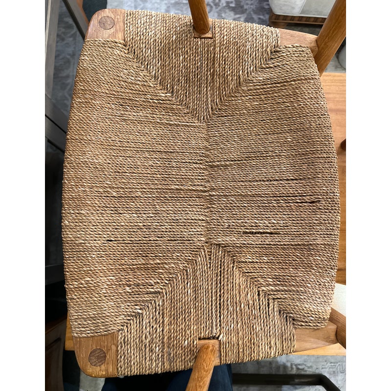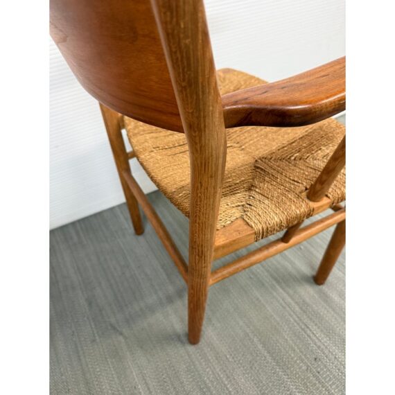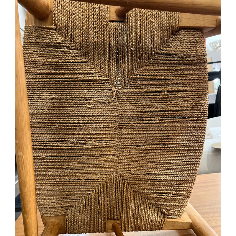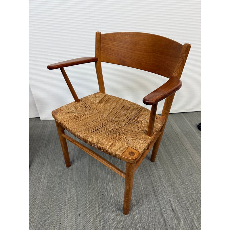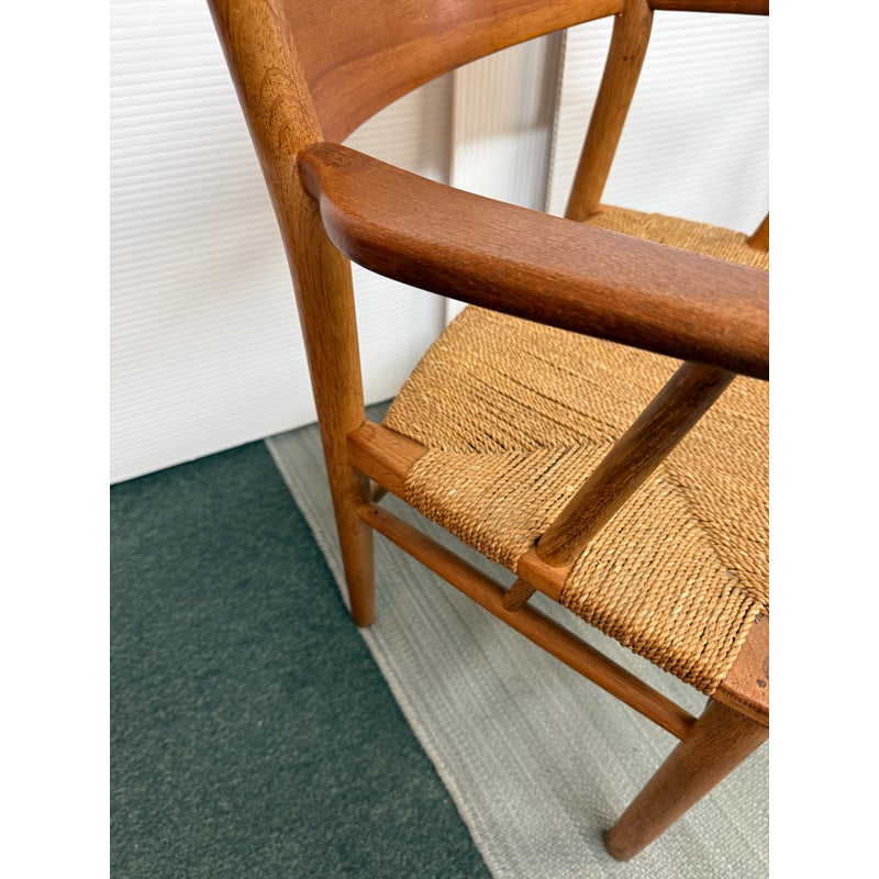 Design Plus Gallery presents a Pair of No.156 Arm Chairs from Borge Mogensen. This pair of sensational mid 20th century chairs are as organically modern now as when they were crafted. They are created in what is referred to as pegged construction where wooden pegs are used to reinforce the joint by inserting them through the tenon and mortise, thereby adding additional strength and stability to the joint. The seat of the chair is wrapped in rush, offering a bounce to the seat that is natural and enduring. We love that their shallow arms allow them to pull up close to the table. Wear is consistent with vintage age and use with several cords have started to loosen on one seat.