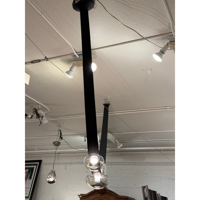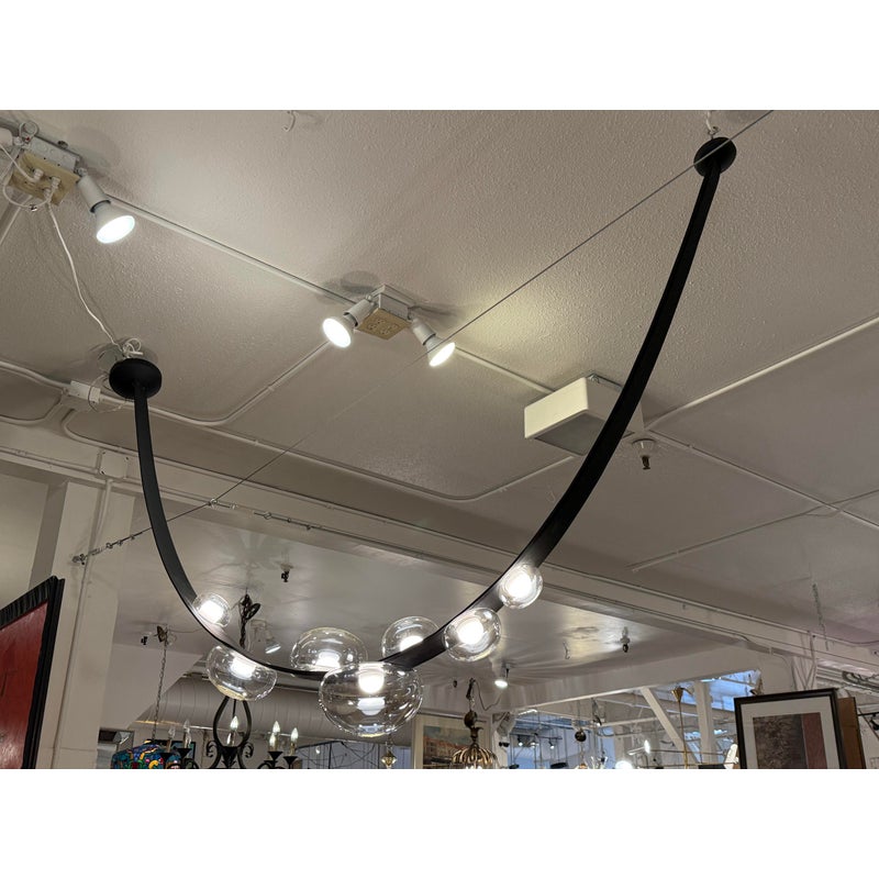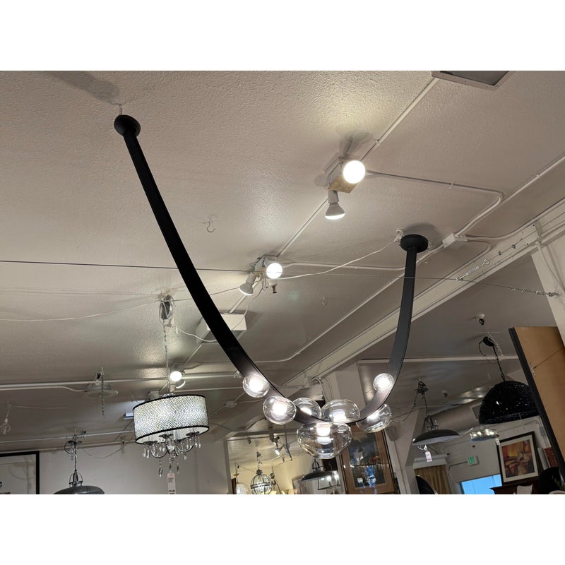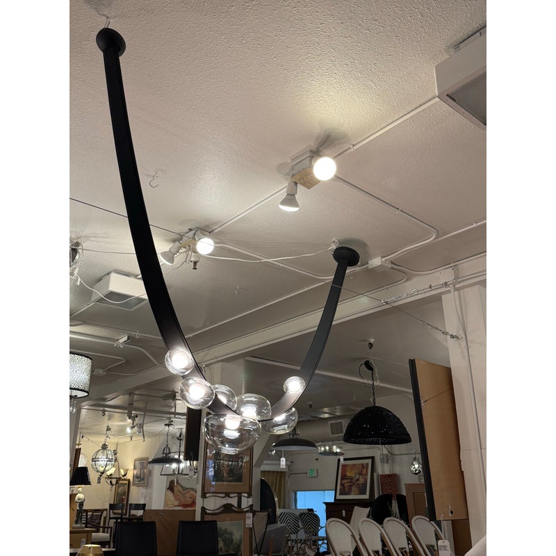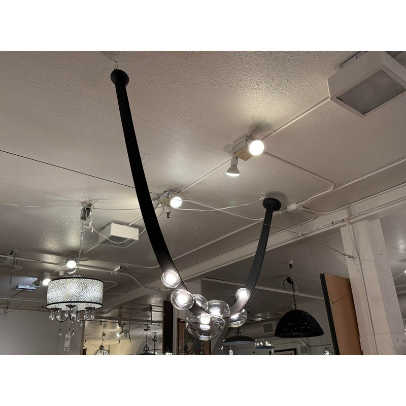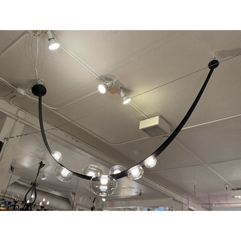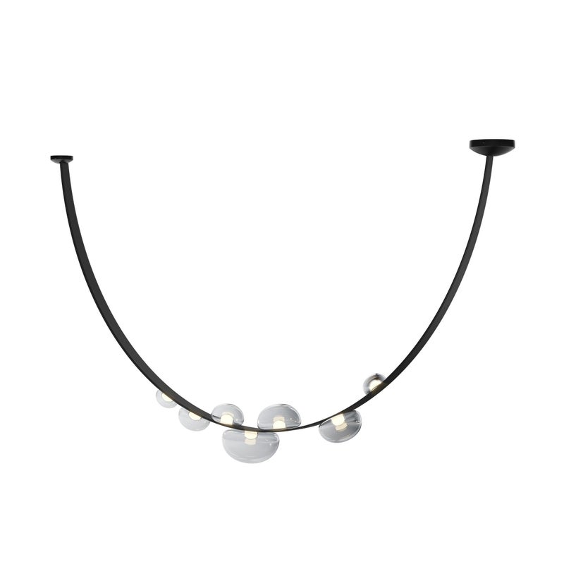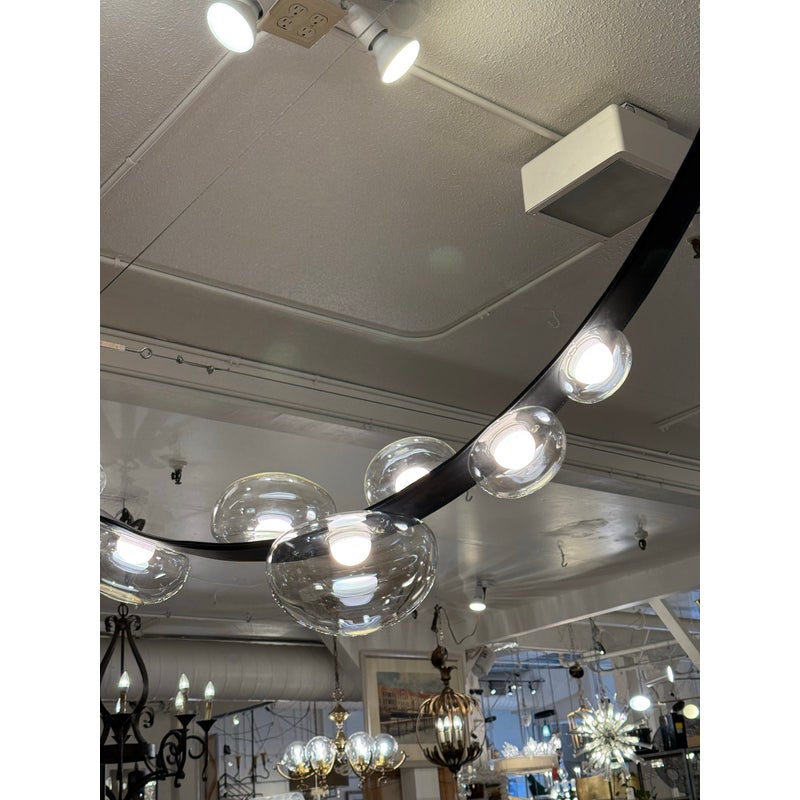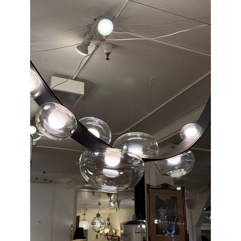 Design Plus Gallery presents an LED Dew Drop Chandelier by Boris Klimek For Bomma. This chandelier has spherical mouth-blown crystals arranged along hand-sewn leather bands. The design captures water droplets on grass blades, with each internally lit crystal sphere showing hints of iridescence. The flexible bands enable the orbs to be positioned in various configurations, while steel hardware provides secure mounting points. Light filters through the crystal spheres, which attach securely to the sewn bands in patterns that can be adjusted or reconfigured over time. This modular approach allows the composition to evolve based on spatial needs. It is in good, showroom like condition with minimal wear for its usage. Made in Czechia.
