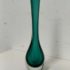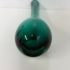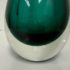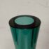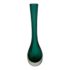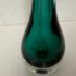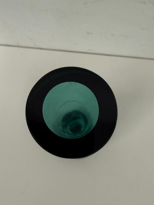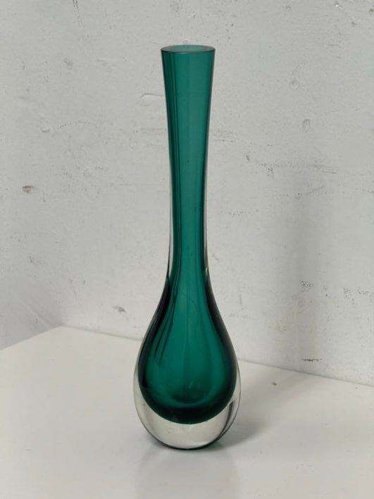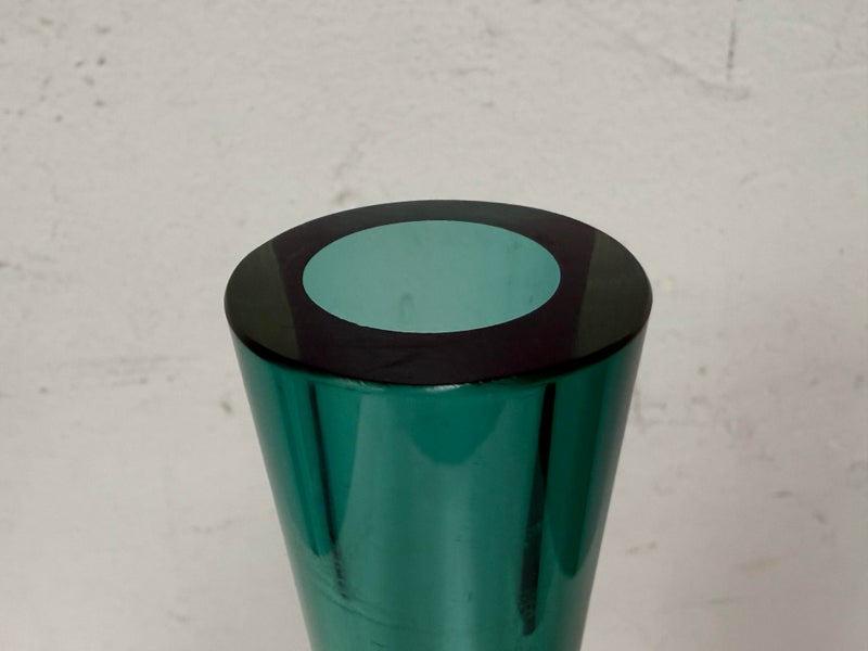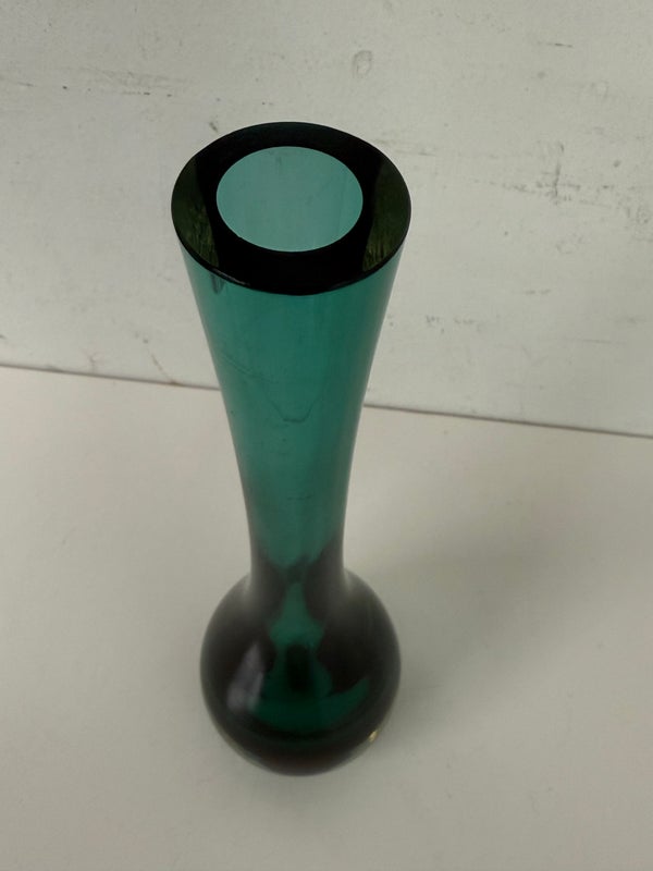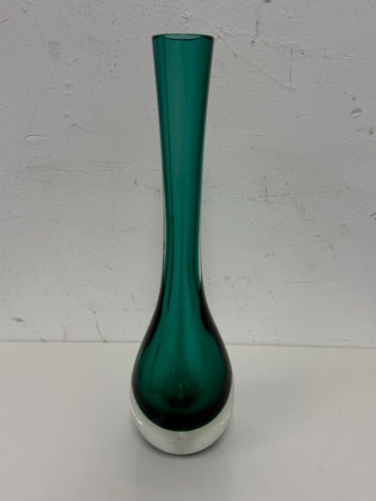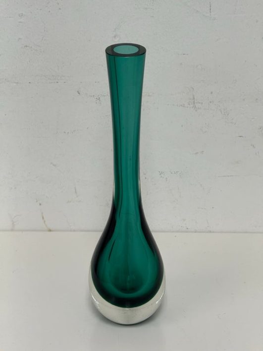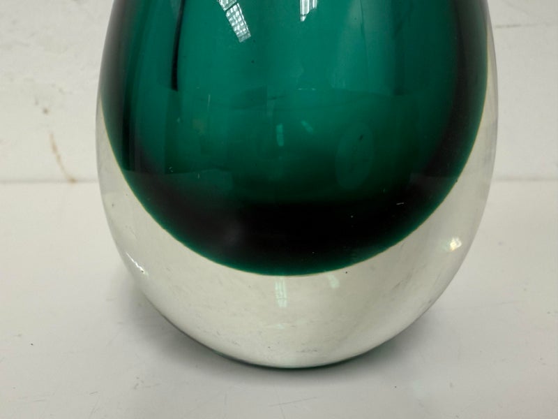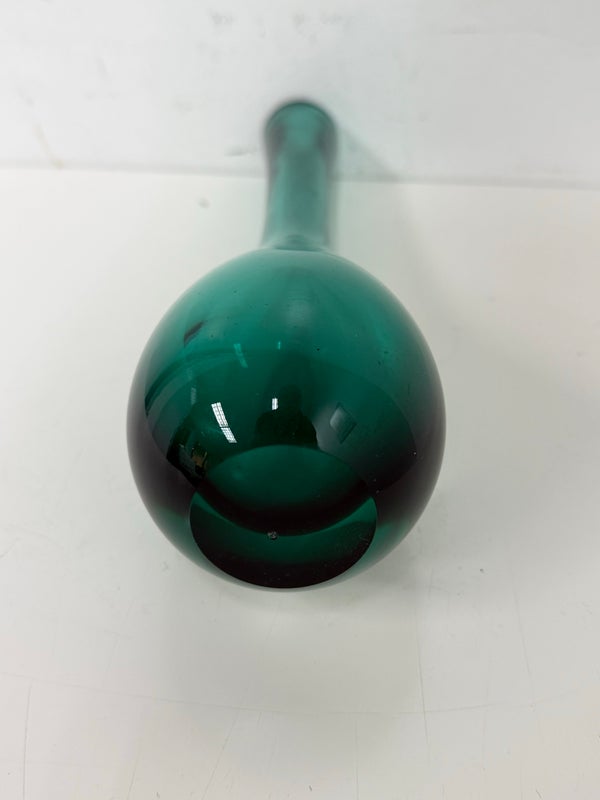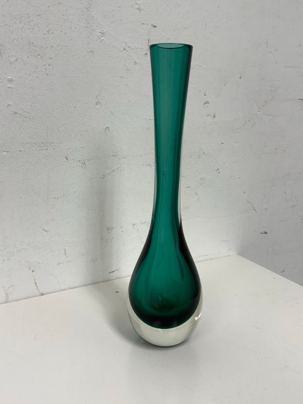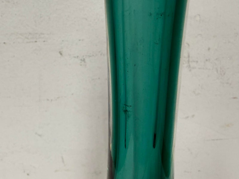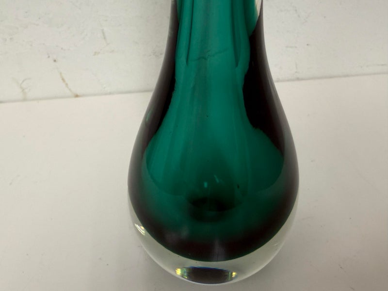 Design Plus Gallery presents a Murano Style Art Vase. The brilliant jewel tone of emerald green makes up most the body of the narrow mouthed vase. The bottom of the most bulbous point to the base of the vase is transparent. Minimal wear with small chip is found. Good condition for its usage.