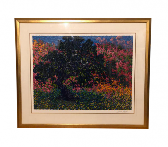 Design Plus Gallery has a limited edition 38/292 serigraph by James Hoyle. The piece is titled “Bougainvillea”. The piece was rendered in bright vibrant colors and is heavily pigmented which gives the print a great deal of depth. It has been custom matted and framed and is ready to brighten your environment!