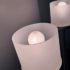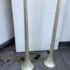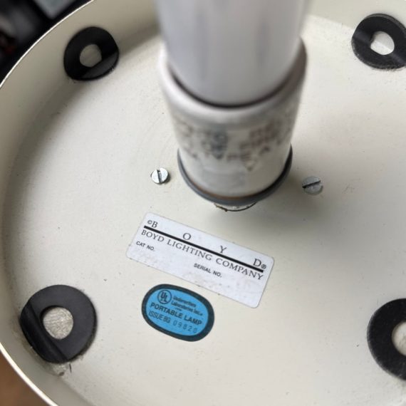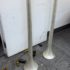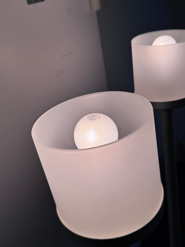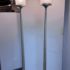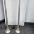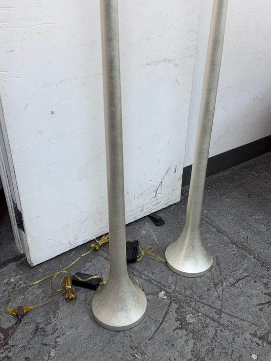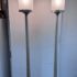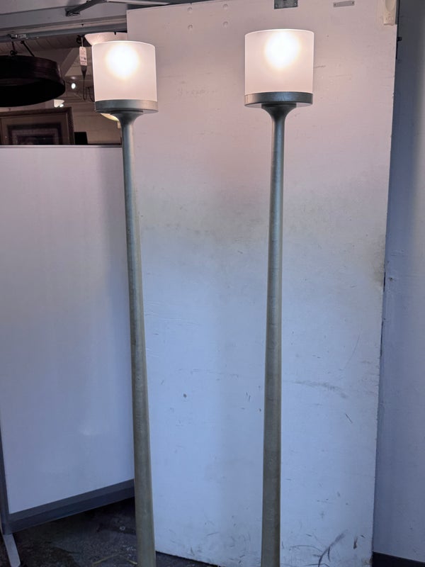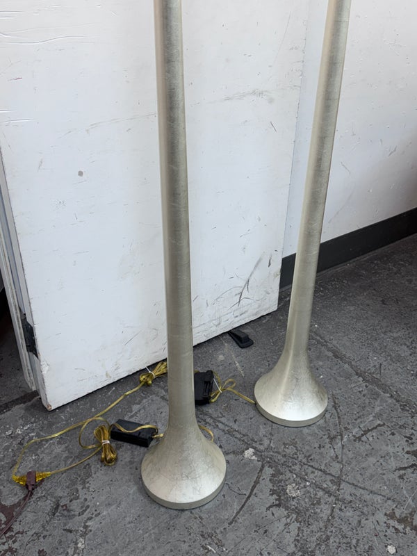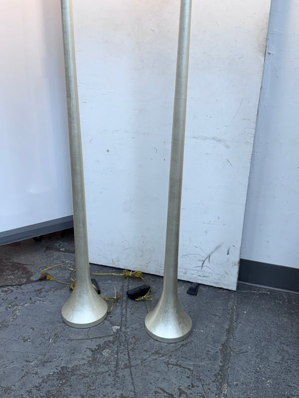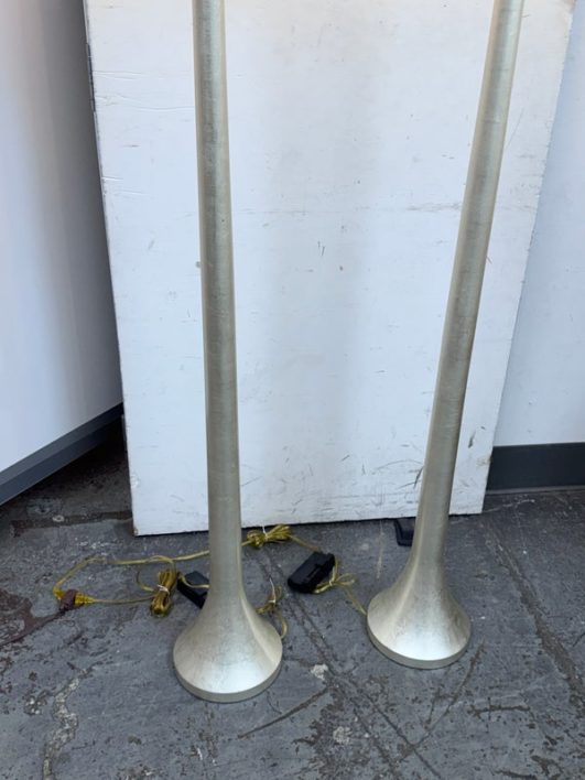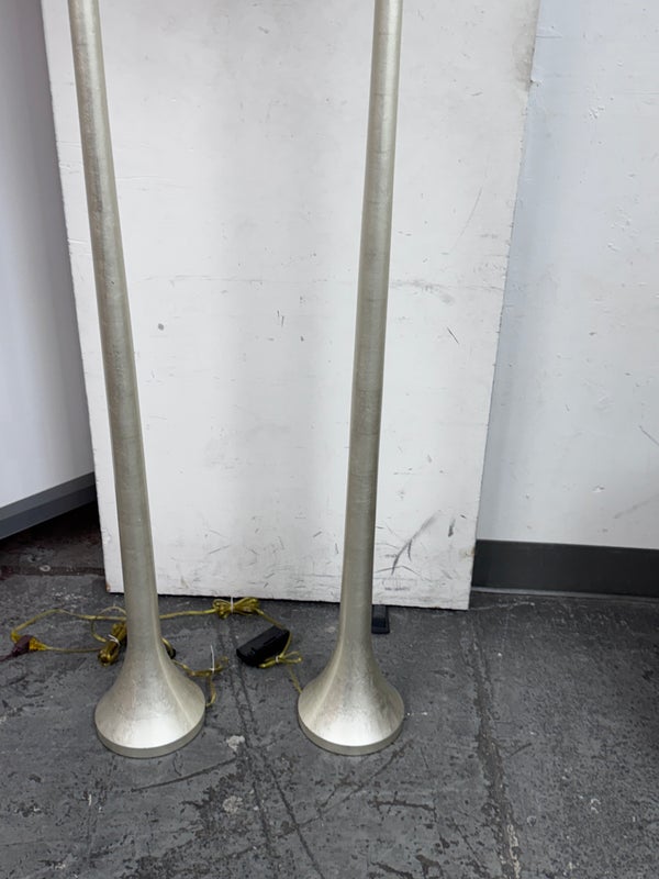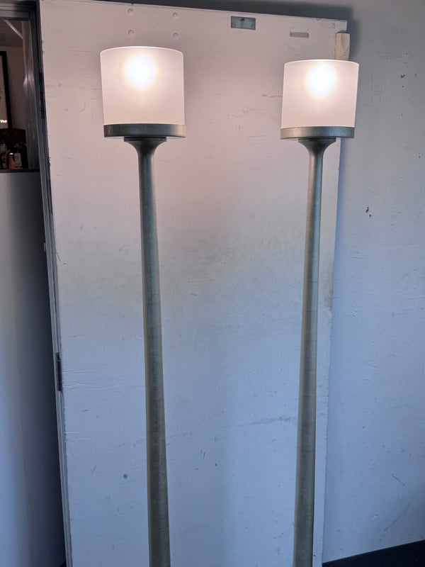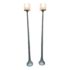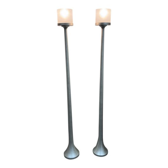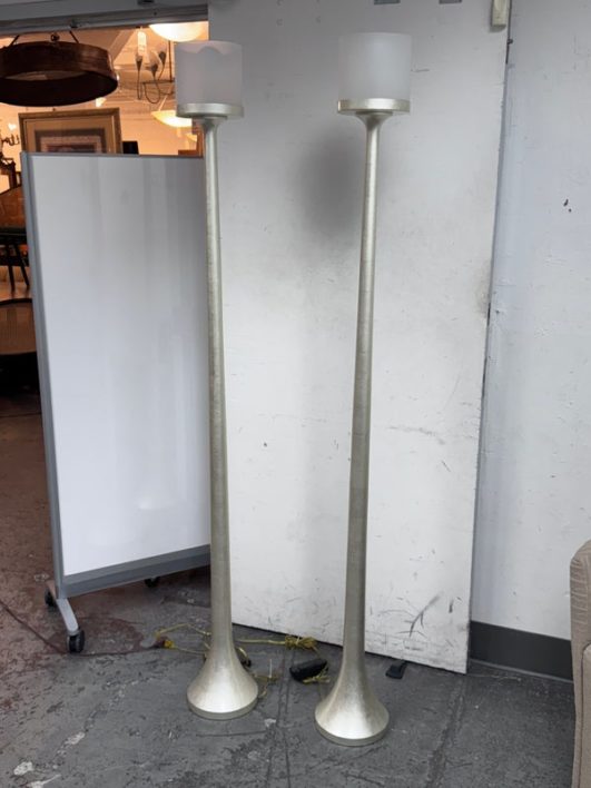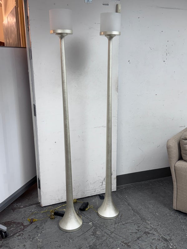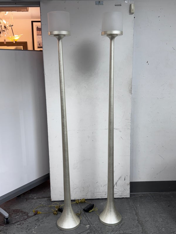 Design Plus Gallery presents a Pair of Floor Lamps from Boyd Lighting. The light have a tulip shaped base in a satin chrome finish that is nice and modern in style. The light on top shines through frosted drum shades, giving an appearance of candles resting on candlesticks. The lamps are in good condition for their age + use. These are discontinued models.