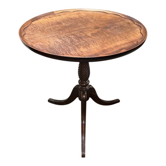 Design Plus Gallery presents an Antique Pie Crust Accent Table by Brandt Furniture. The table is constructed with wood and has a pedestal base with rounded accents and three outward curving legs. The tabletop is round with raised edges and features curve accents with corners. Minor wear from age and use; table is in good condition.