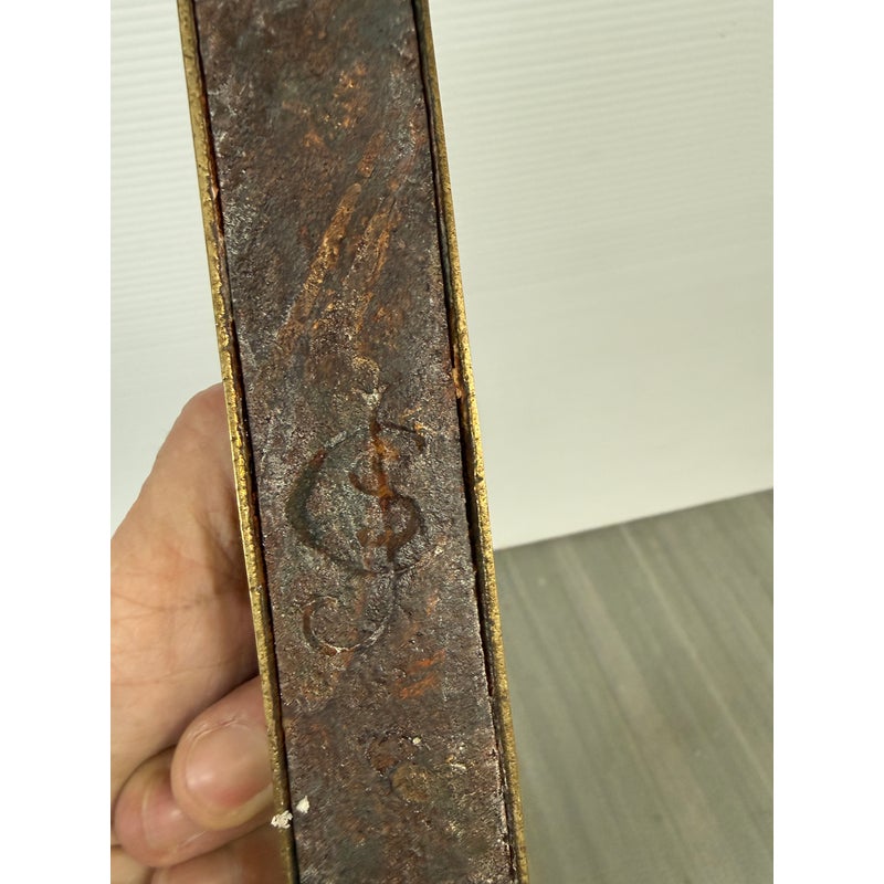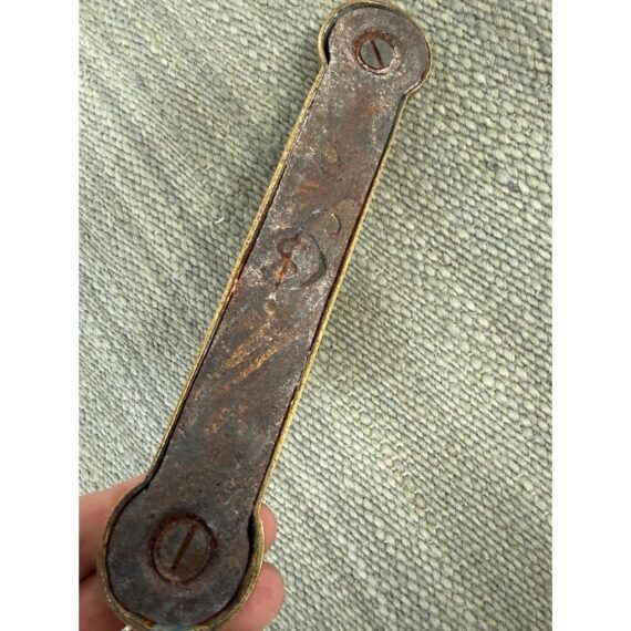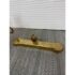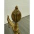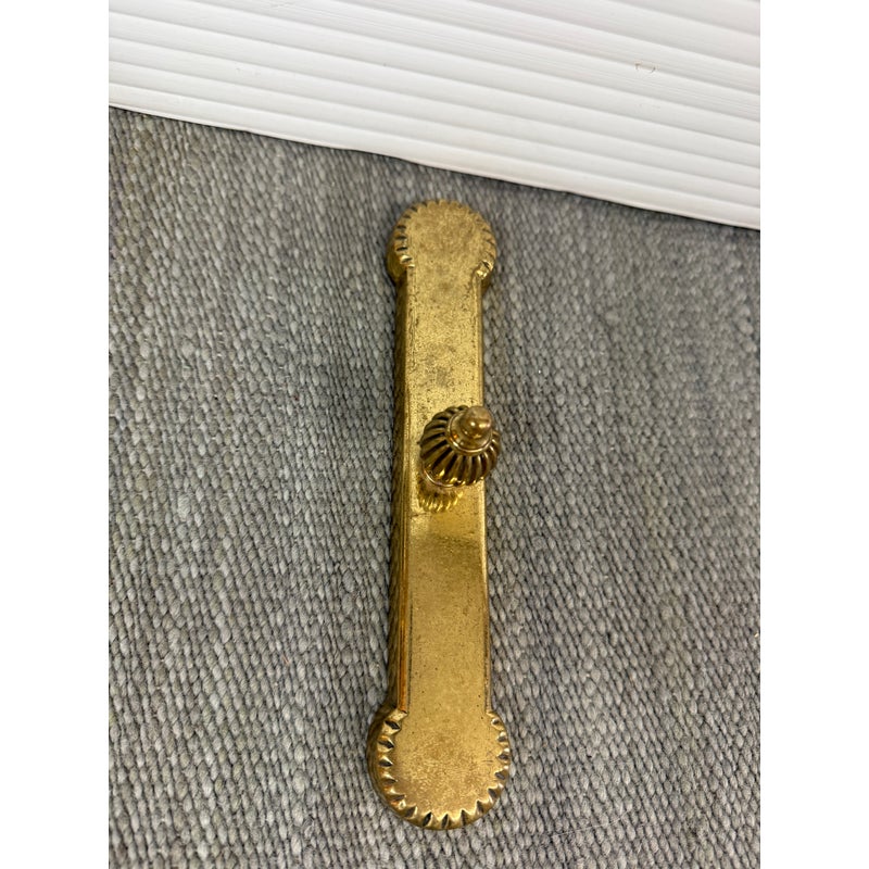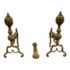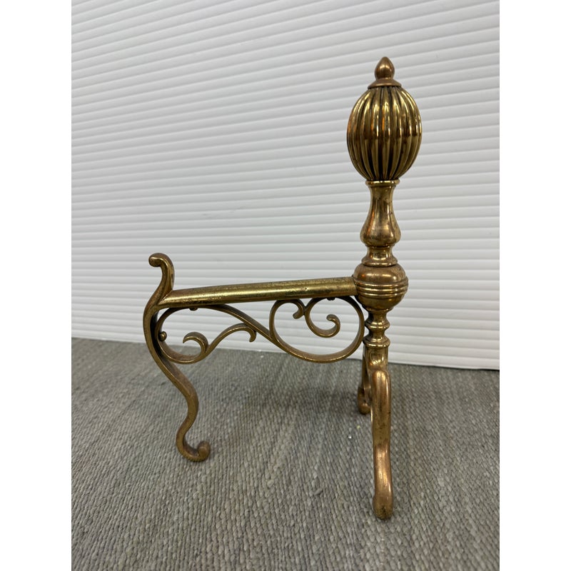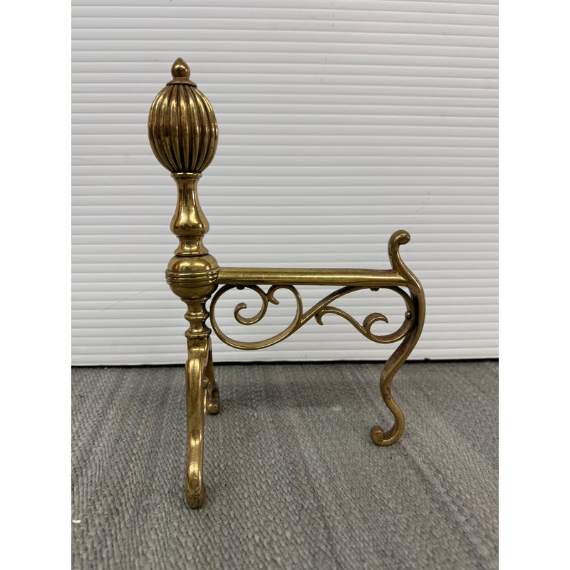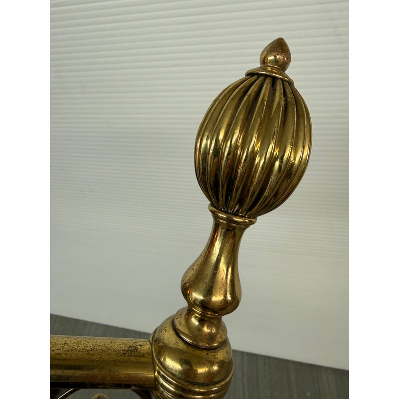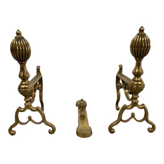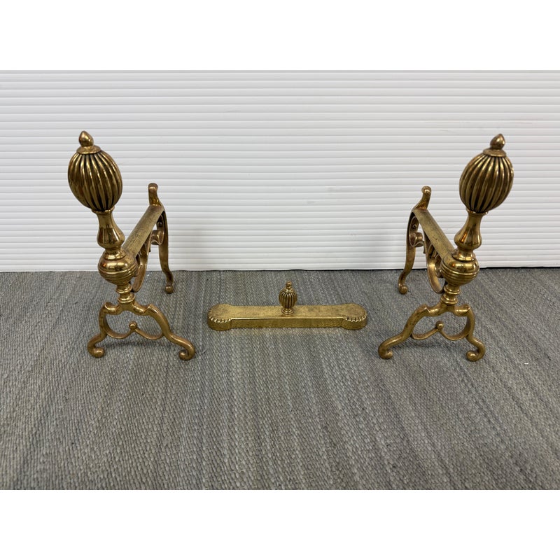 Design Plus Gallery presents a Set of Three Brass Fireplace Andirons + Front Rail. This vintage three-piece set includes a pair of brass andirons with turned urn finials, scrollwork side supports, and curved feet, along with a coordinating front rail detailed with a central finial and notched ends. The overall form reflects a traditional profile with decorative lines and balanced ornamentation. Surface patina, light scuffing, and minor wear are consistent with age and prior use. They are in good condition with visible patina and minimal wear from usage.