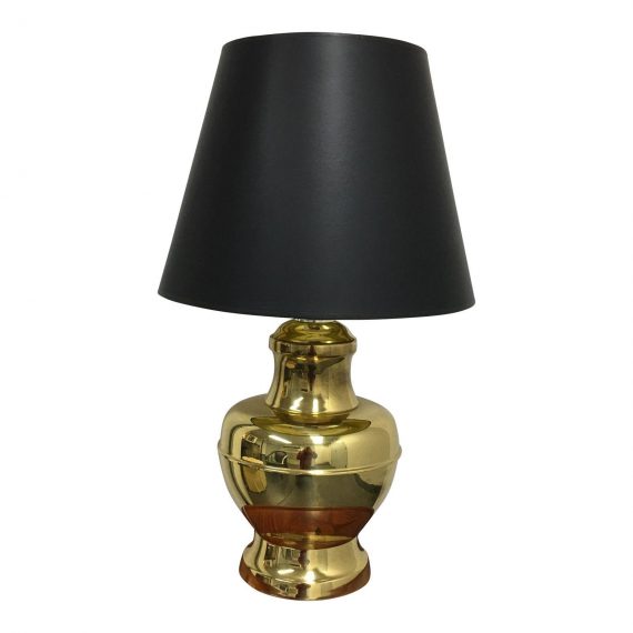 Design Plus Gallery has a Brass table lamp. The lamp has a stylized Ginger jar shape, with a Black Shade that has a Gold foil inside which helps to deflect the light and also adds a lovely glow.