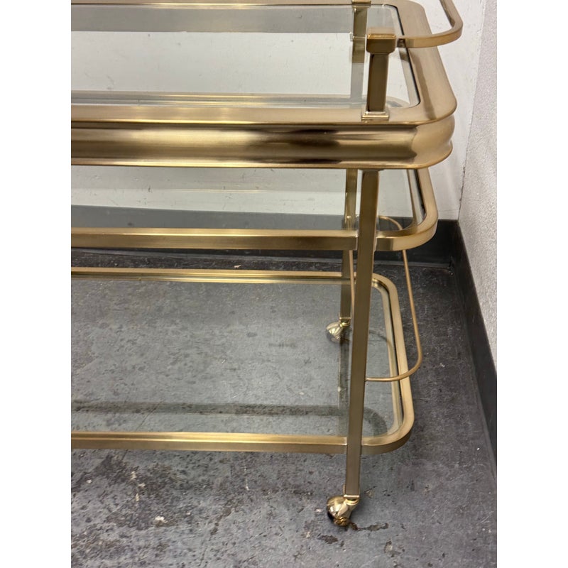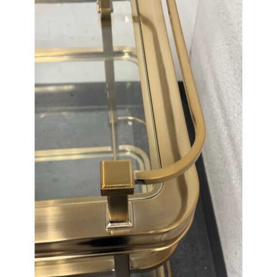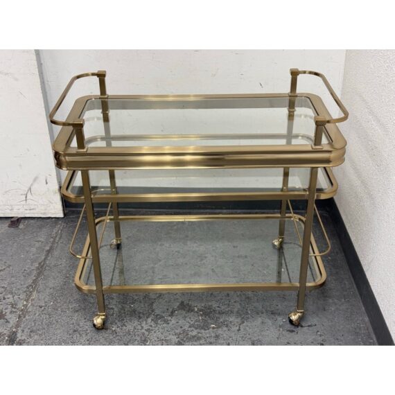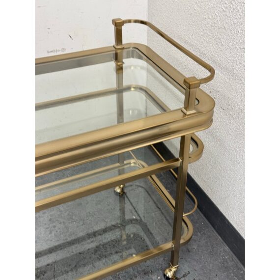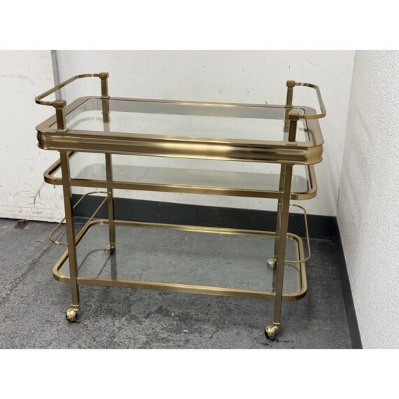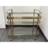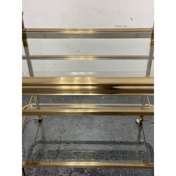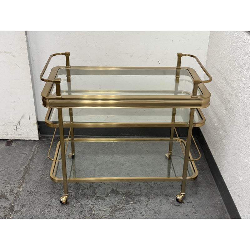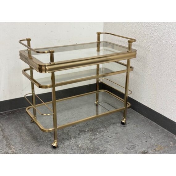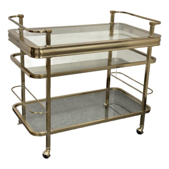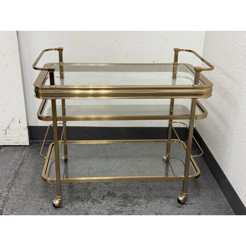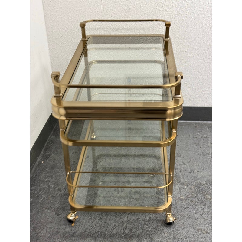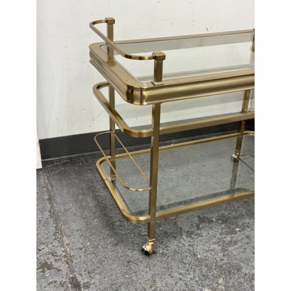 Design Plus Gallery presents a Brass Bar Cart and/or Serving Trolley. Your new best friend to some people, this wonderfully constructed trolly sits on casters and can move around easily. Three glass shelves for organizing bottles + serve ware with grace. Is in good condition with minimal signs of usage.