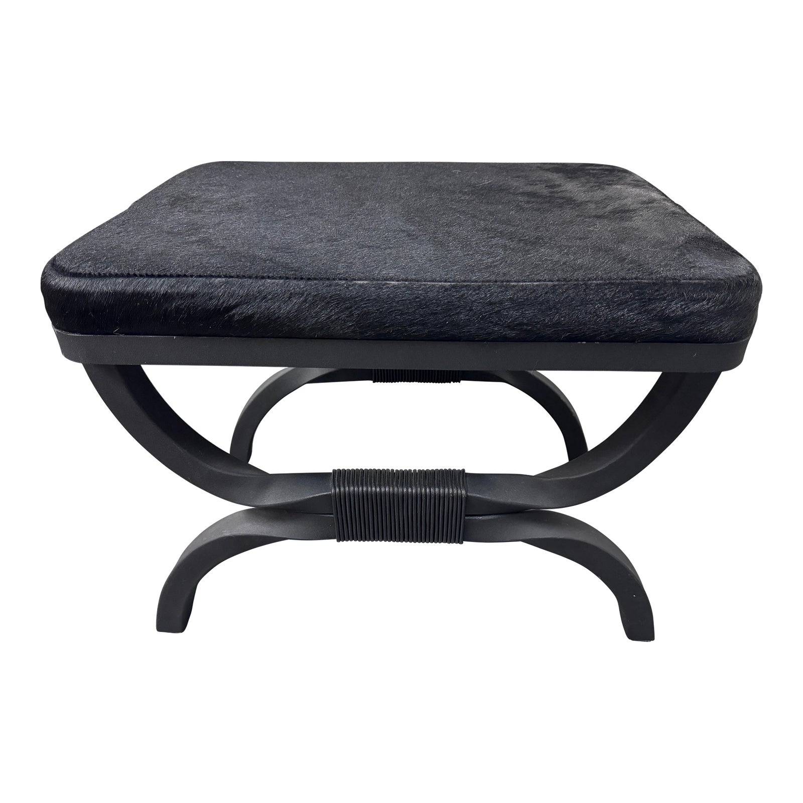 Design PLus Gallery presents the Serpette Footstool from CB2 designed by Brent Beldock . Cloaked in all black, modern stool reigns with traditional Louis XVI style. Elegant mild steel legs curve in matte black, slightly wider than their predecessors. Genuine cowhide-covered seat offers a solo spot in the entry or living room. In good condition, with minimal signs of surface wear.