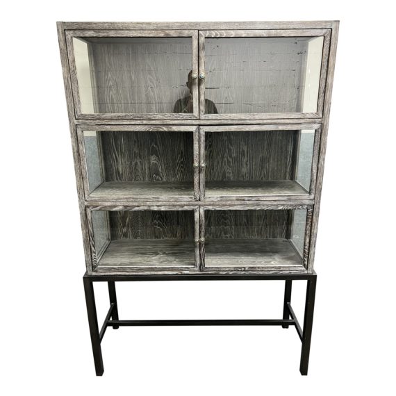 Design Plus Gallery presents a Brenton Wood + Glass Cabinet. The base is made with square rod metal with a black finish and in a trestle style. The top frame is constructed with wood in a distressed gray finish and features glass inserts with brass hardware. Each tier has two cabinet doors. The top right side glass is cracked. Visible + minor wear from use; cabinet is in good condition.