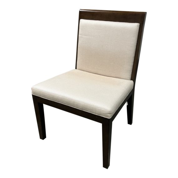 Design Plus Gallery presents a Lorin Side Chair in Cream Upholstery by Bright Chair Furniture. The frame is in a dark finish. The armless side chair is designed by Douglas Levine. There are conditions on the legs that are minor with some stains on the upholstery seat. Visible discoloration from sun exposure. Condition that is consistent with age and use.