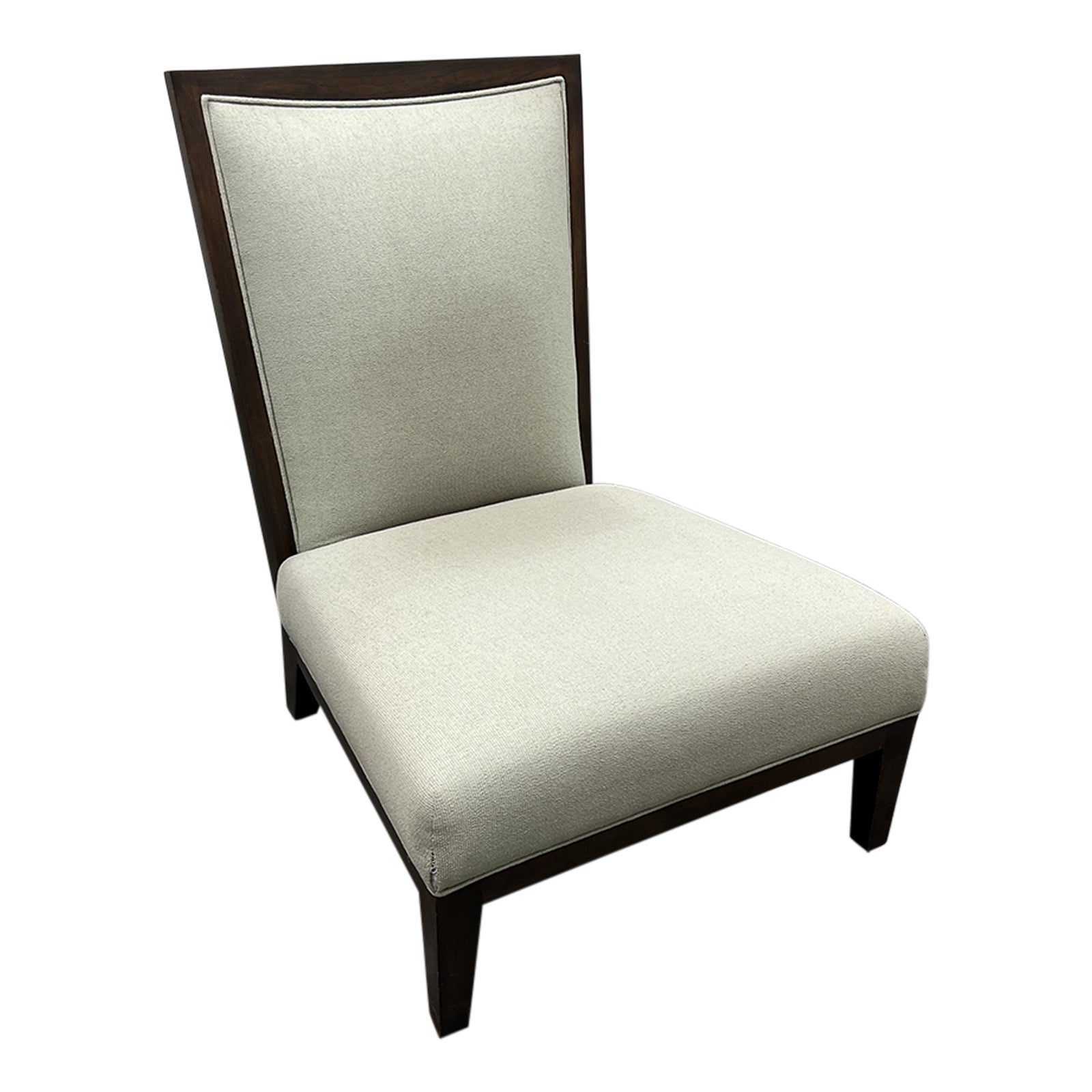 Design Plus Gallery presents a Loren Plain Tampa Lounge Chair by Bright Chair Furniture. The seat, back + back panel all have a smooth greige padded upholstery that is set in a rich mahogany finish wood frame. This has a low profile with high back to bring the drama to your living or office space. Visible discoloration from sun exposure, Condition with wear that is consistent with age + use.
