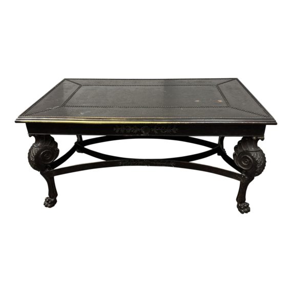 Design Plus Gallery presents a Bronze Embossed Cocktail Table. The table has a toiled design on its table top, nicely segmented at each corner and also center with a stud detail. Each leg has an interesting design of a spiraled shell with claw feet. Something new will jump out at you every time you look at it. The top surface has a few signs of heavy use and some stains, discoloration and patina.