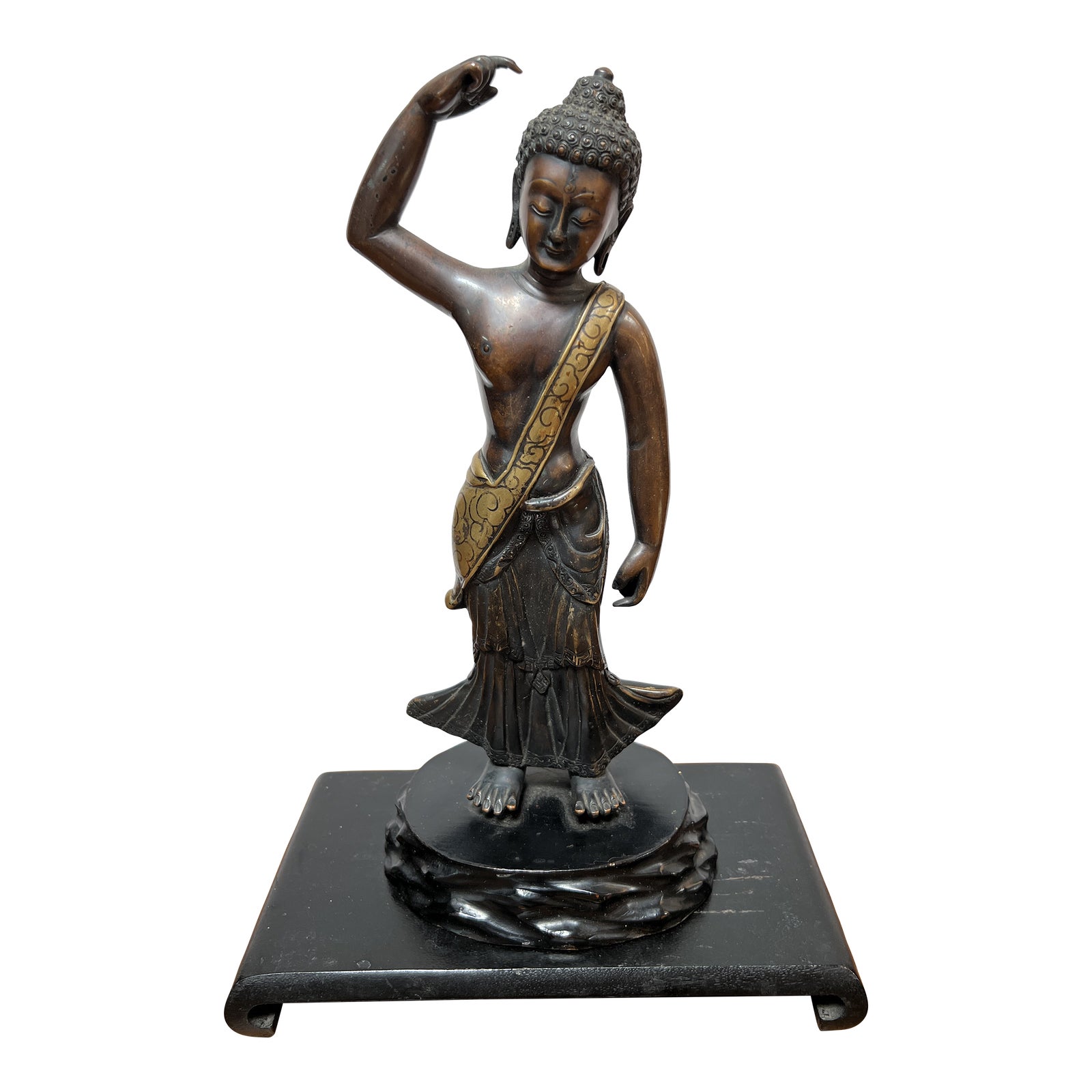 Design Plus Gallery presents the Bronzen Tanjobutsu Standing Buddha Statue. This is of significance as the buddha’s birth era, welcoming the world again on his path to nirvana. In good condition with small amounts of patina.