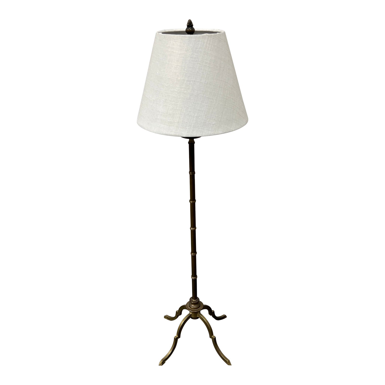 Design Plus Gallery presents a Bronze Floor Lamp Rod Floor Lamp. Sitting on a four foot stand and single rod that has notches resembling that of a telescope. Large linen shade. In good condition with minor wear.