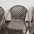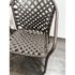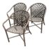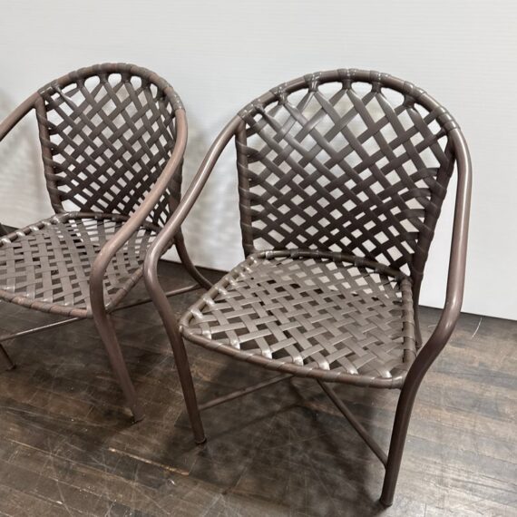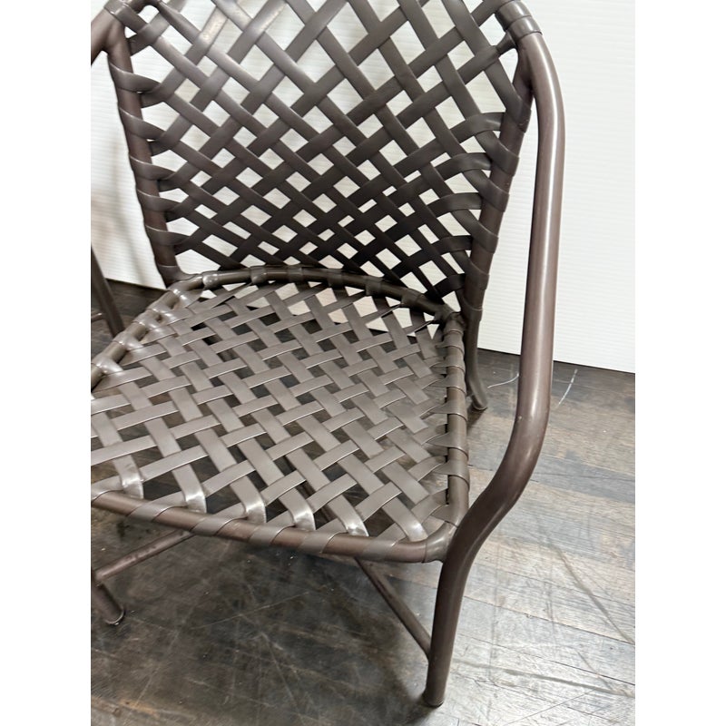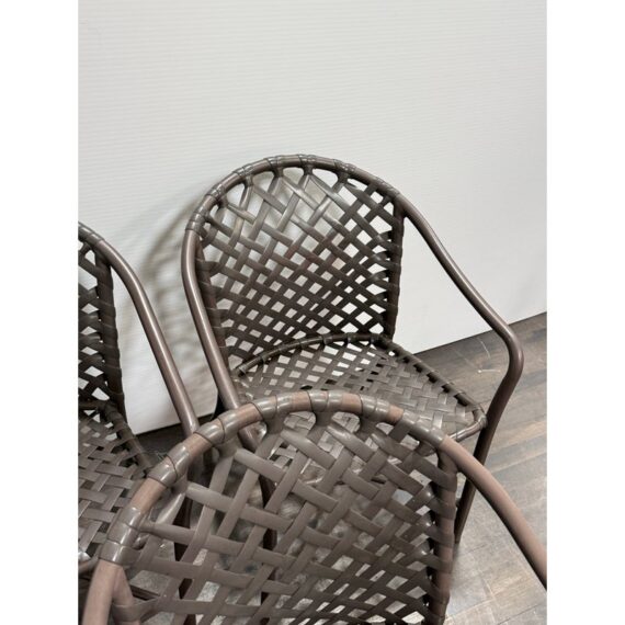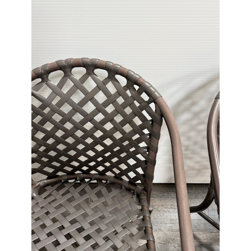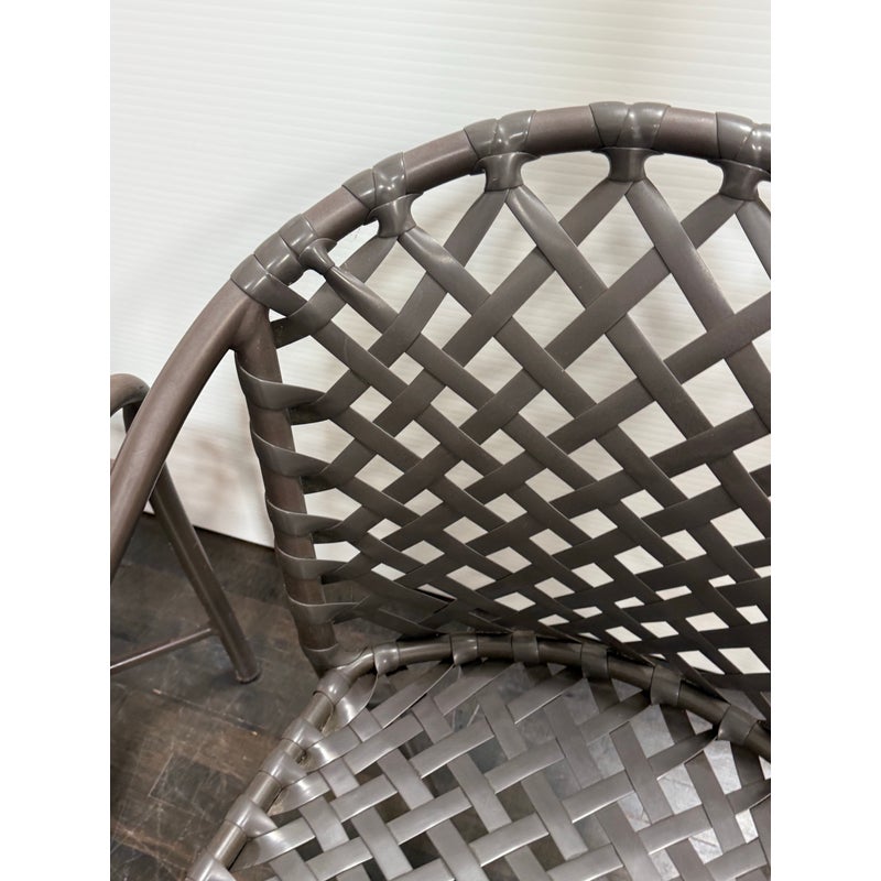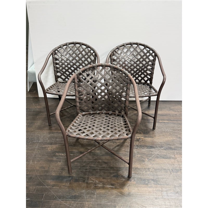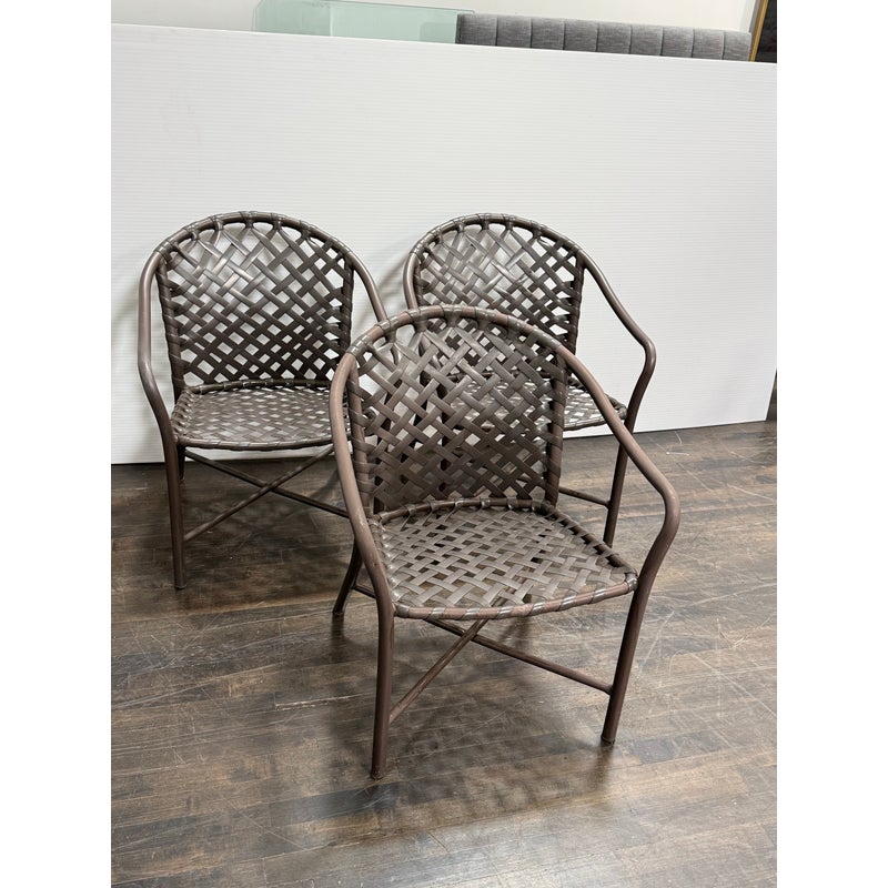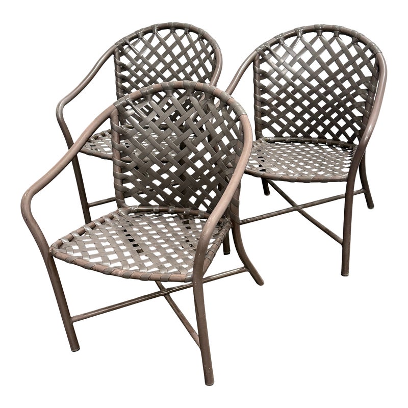Design Plus Gallery presents a Set of Three Outdoor Armchairs from Brown Jordan. Woven resin straps create an open lattice across the seats and backs, paired with extruded aluminum frames that curve into rounded backs and arms. This is a discontinued model from the brand, and they are in good condition with visible and minimal wear from usage. Made in the USA.